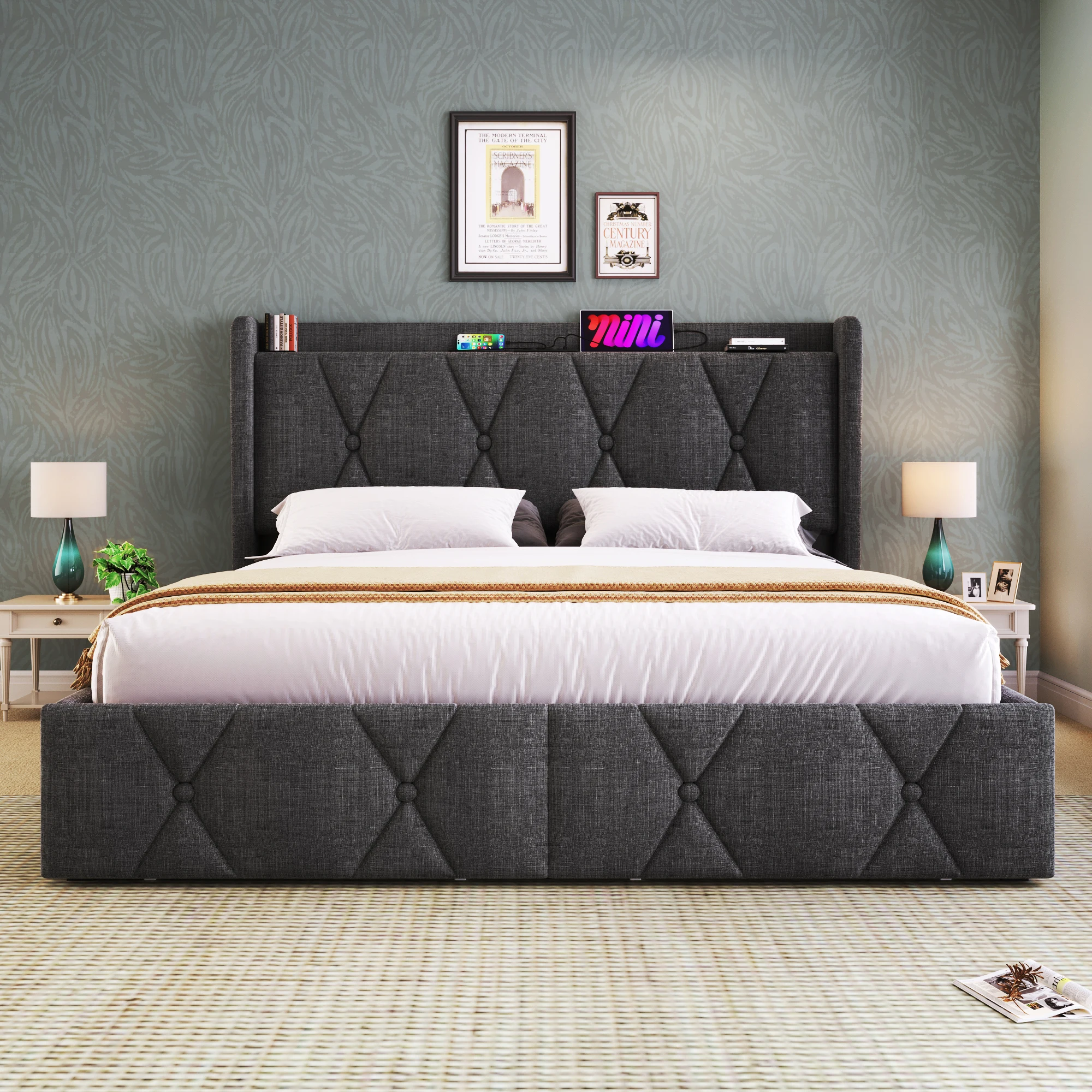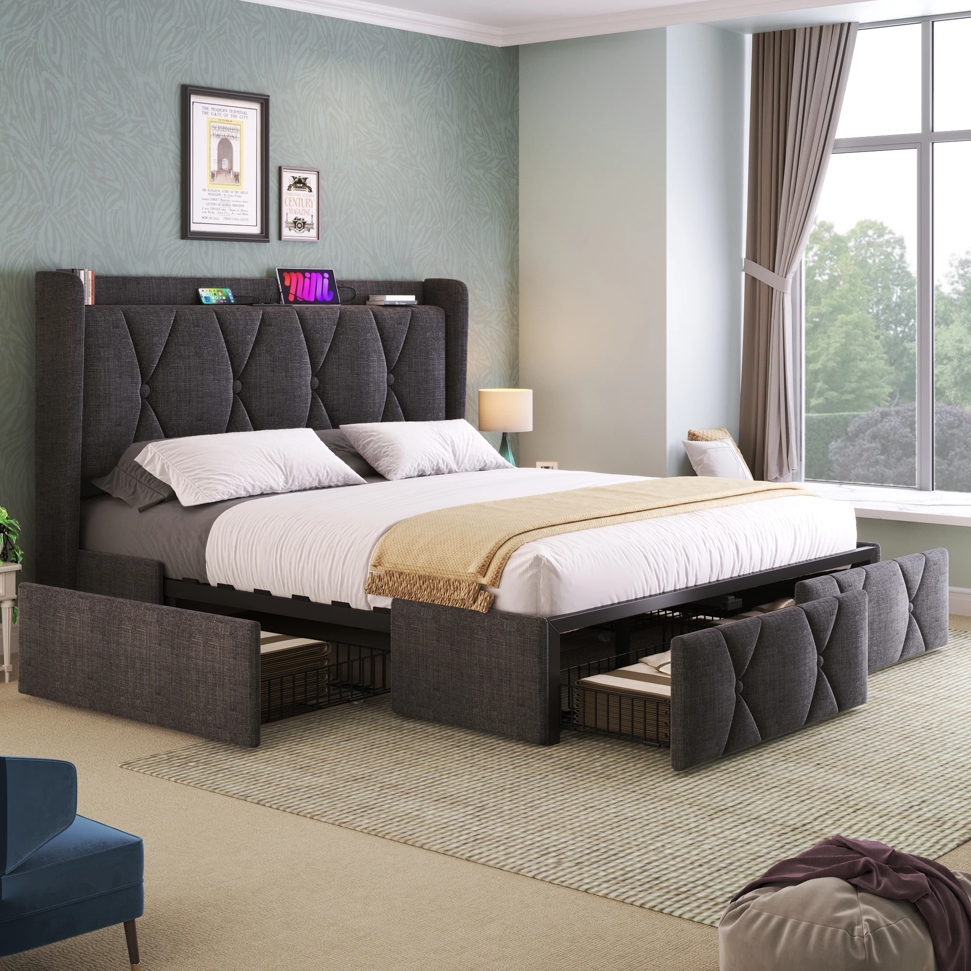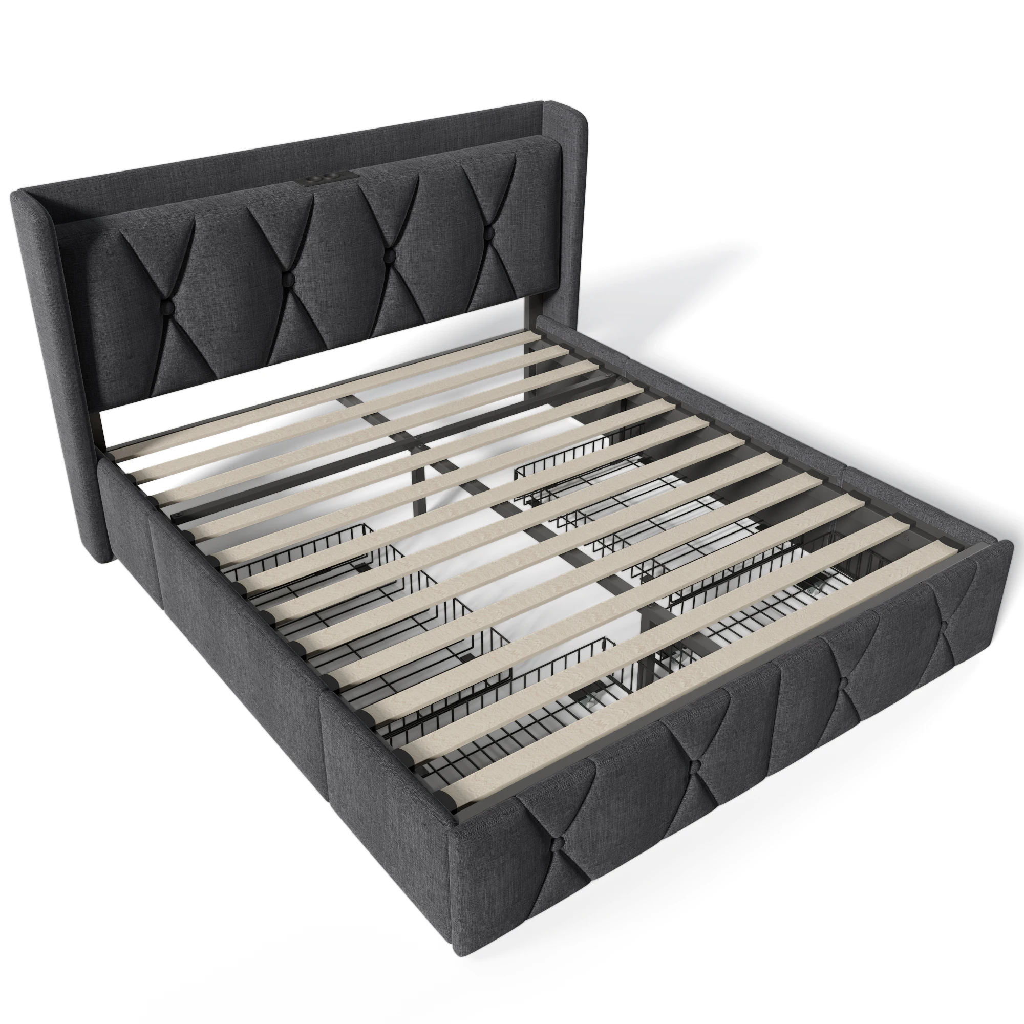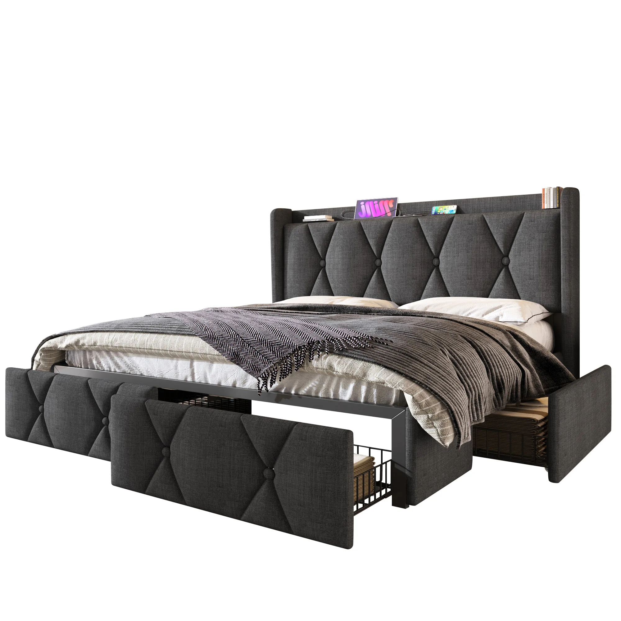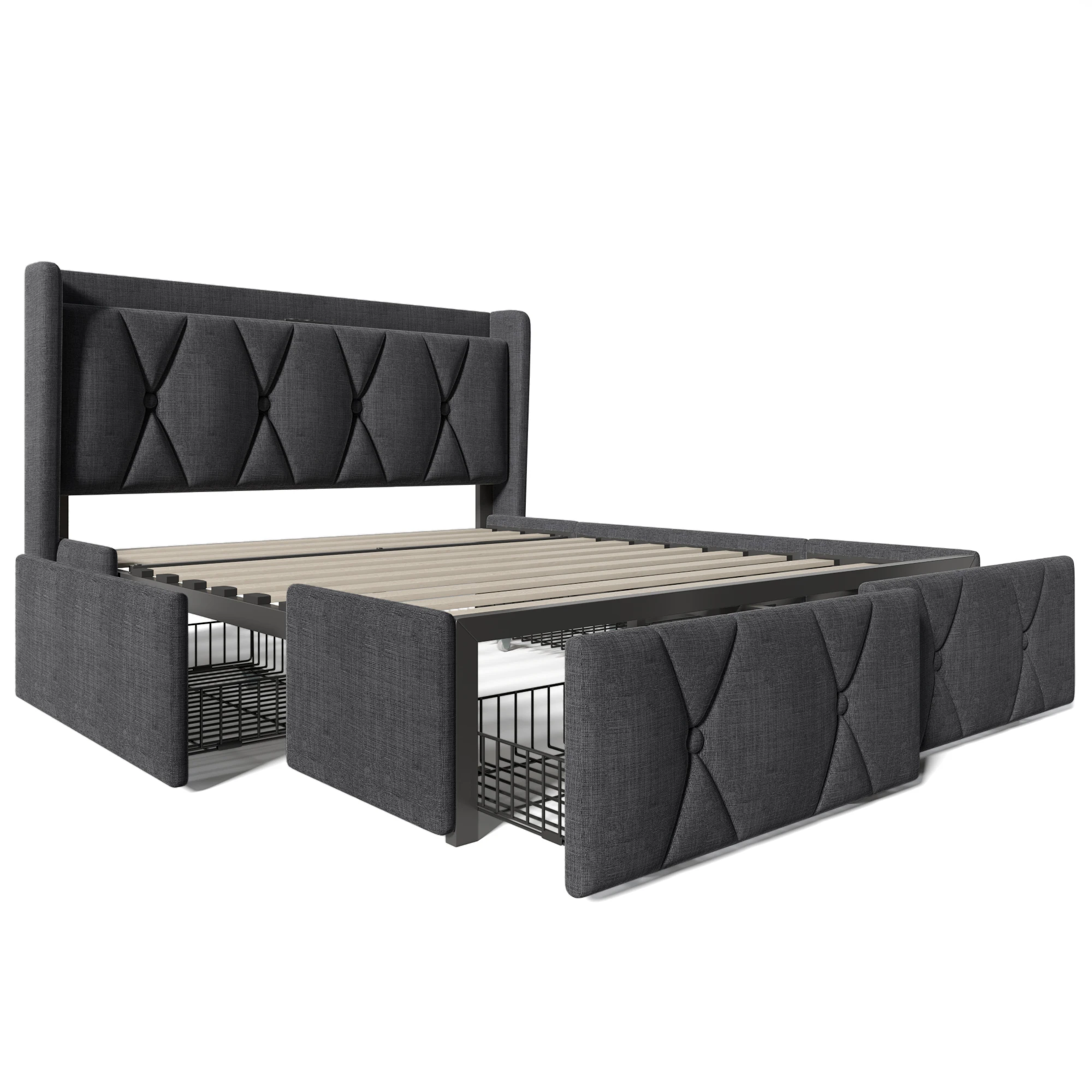 Мягкая кровать с функцией USB-зарядки, изголовьем и 4 ящиками, двуспальная кровать, каркас кровати для хранения вещей, деревянное решетчатое основание.
