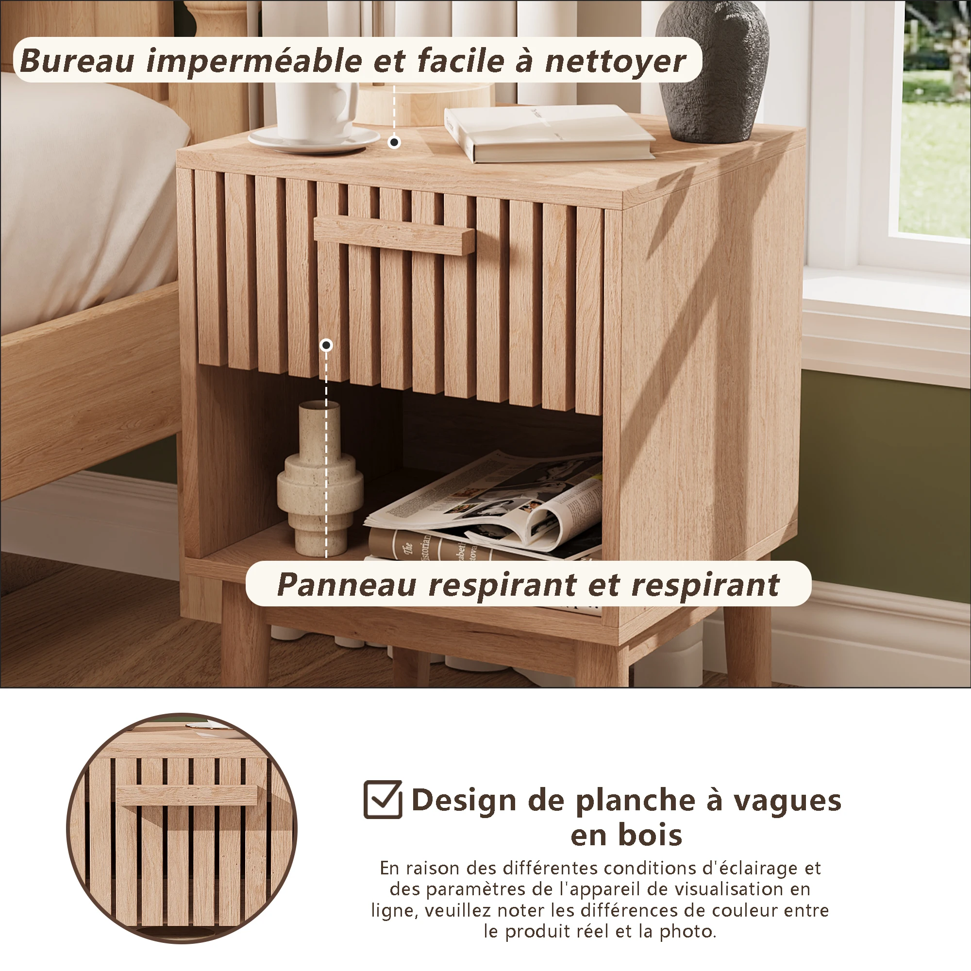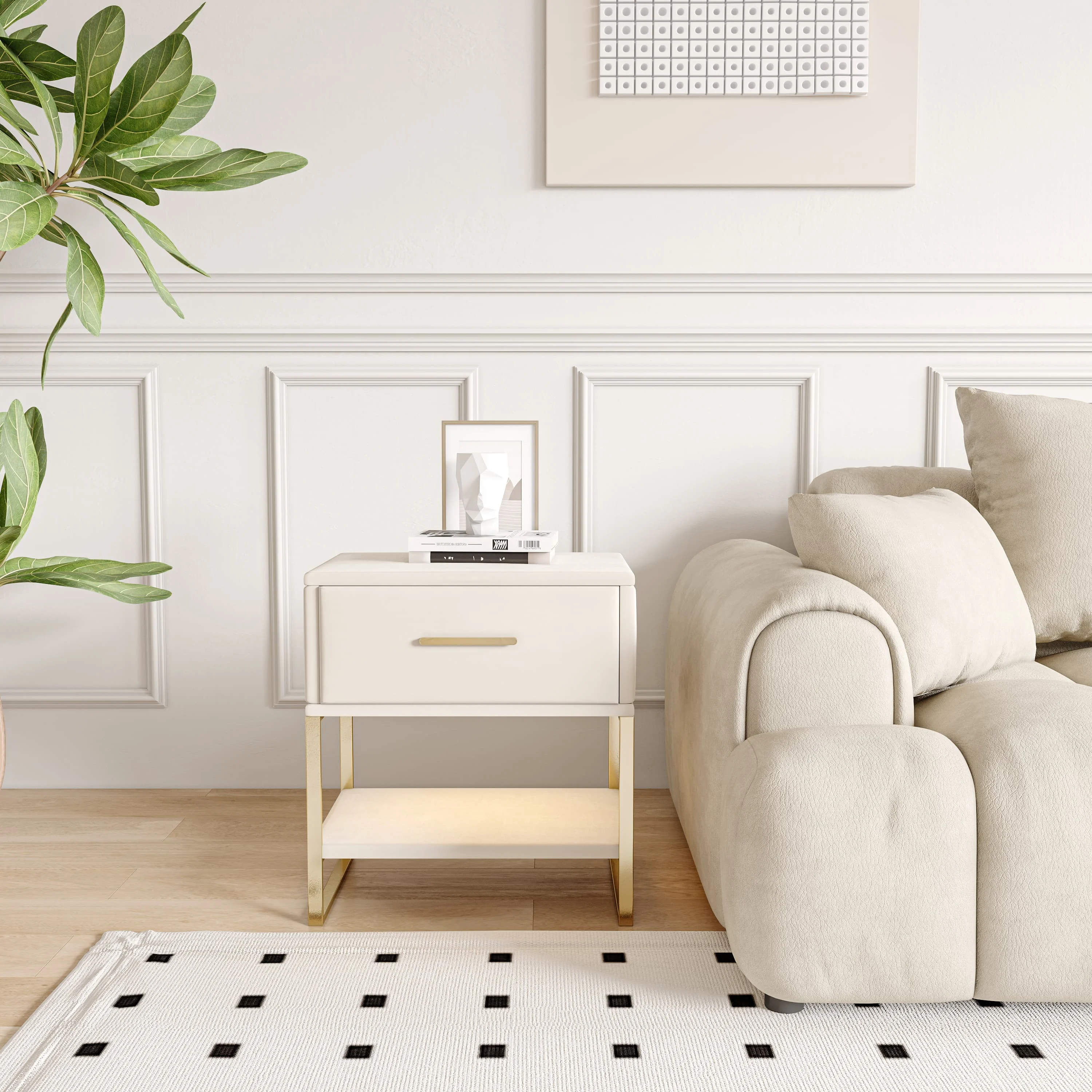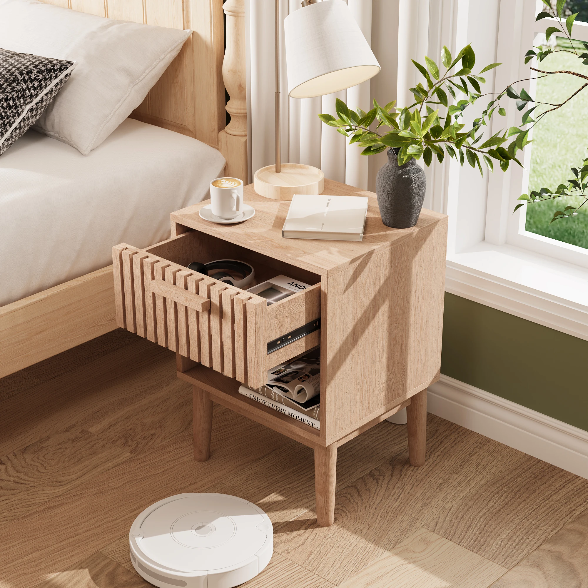 1. Интеллектуальный дизайн хранения:Двухстворчатая прикроватная тумбочка сочетает в себе закрытый ящик и открытое место для хранения для легкого доступа к вашему бизнесу.