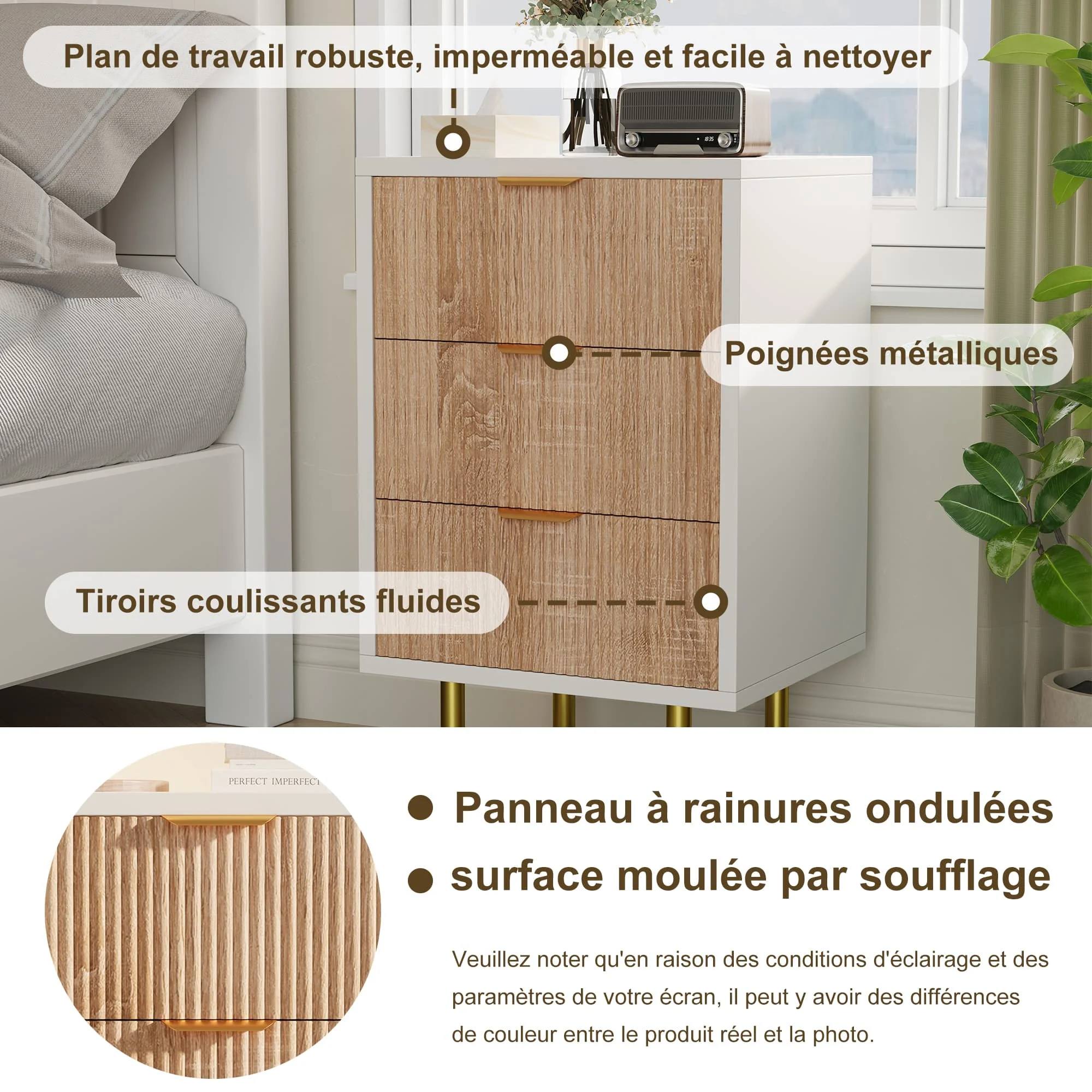 Этот блок хранения не имеет ограничений одной функции и может служить прикроватной тумбочкой, приставным столиком или небольшим хранилищем.Размещенный возле кровати, он предлагает удобное место для хранения вечернего чтения, мобильных телефонов, очков и т. д., тем самым оптимизируя пространство спальни.Крепится к стене гостиной, позволяет хранить канцелярские принадлежности, пульты дистанционного управления, журналы и т. д.Это позволяет мебели хранить косметику, уход и другие косметические товары.Его ящики оснащены плавными металлическими направляющими, которые открываются и закрываются легко и без шума.Простого давления достаточно для легкого доступа к продуктам, тем самым адаптируясь к различным использованиям и оптимизируя практичность.