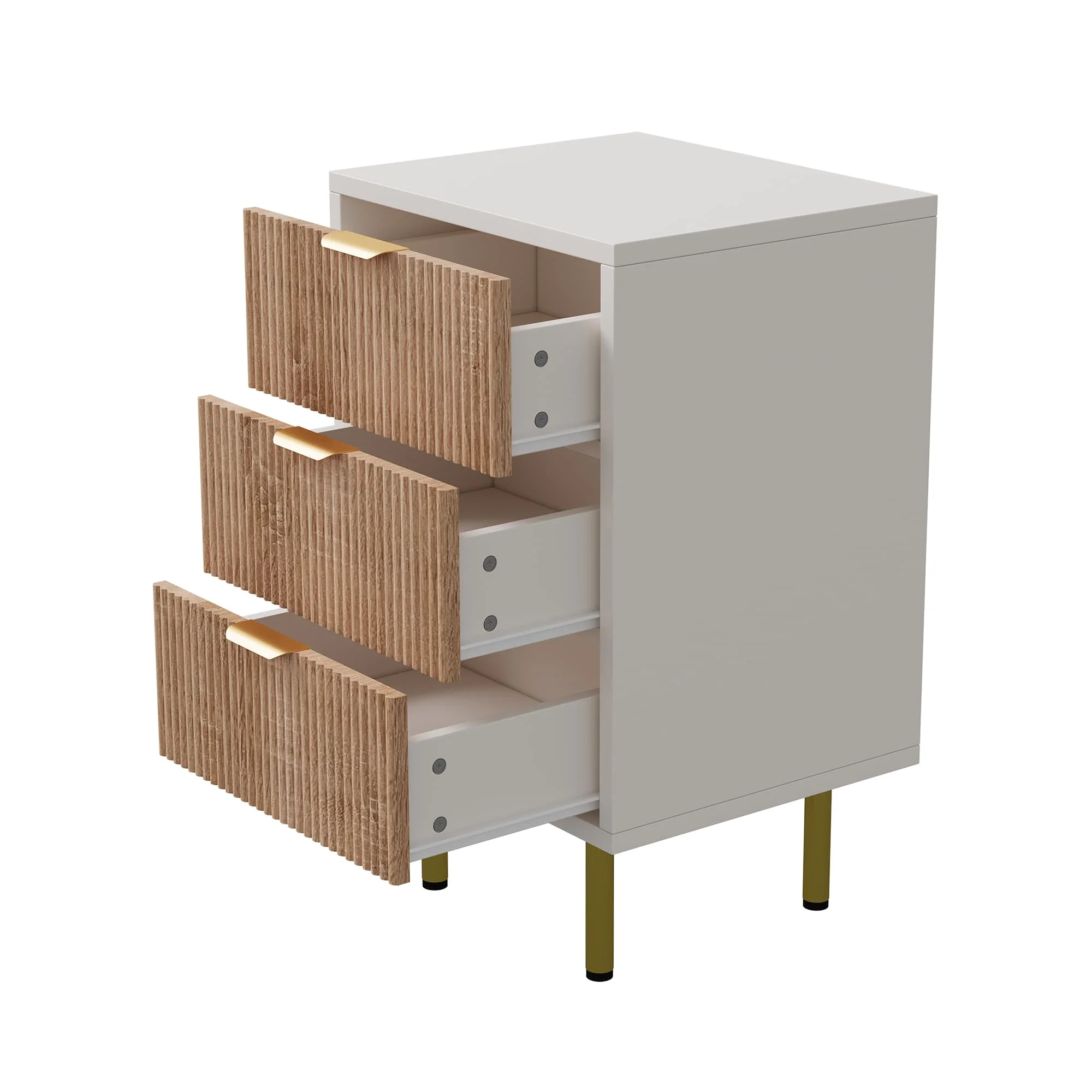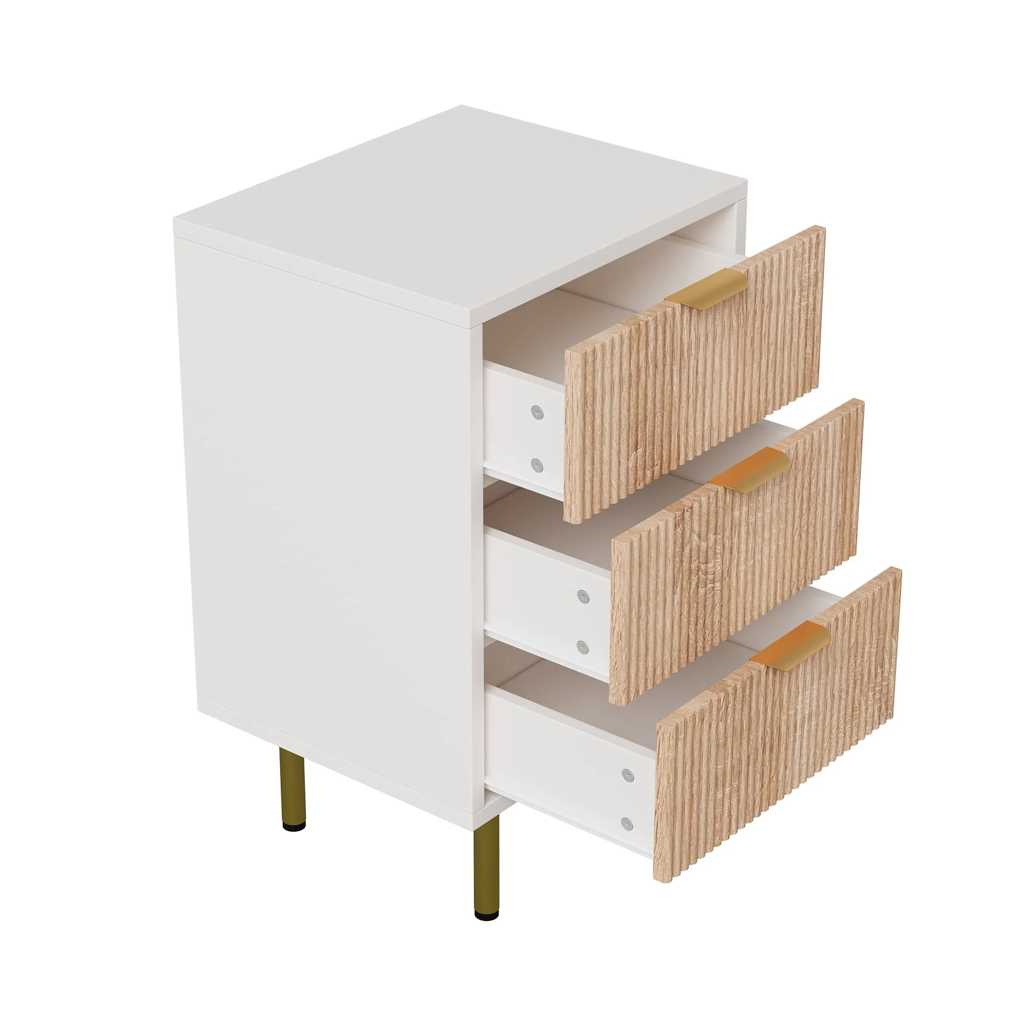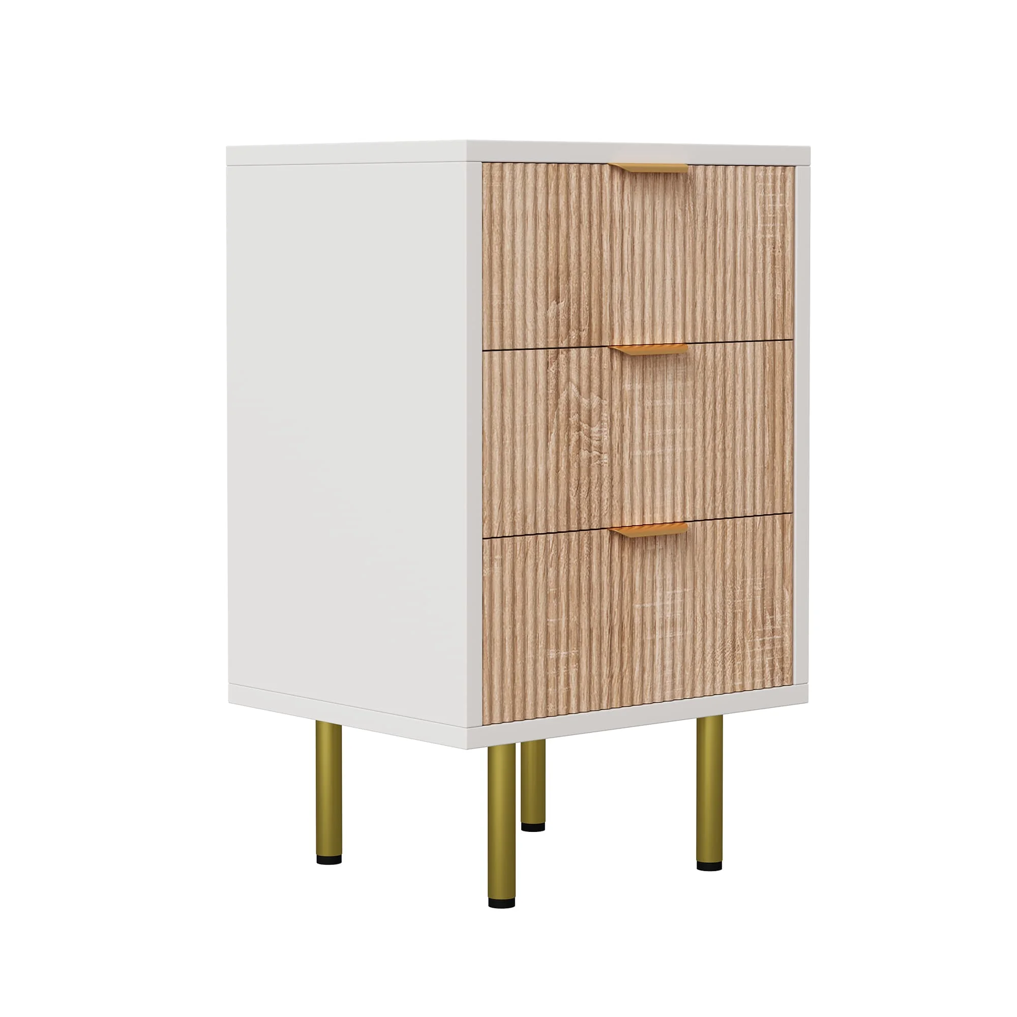 Набор из 2 прикроватных тумбочек, 3 ящика, металлических ручек, металлических ножек, идеально подходит для спальни или гостиной, белый и дерево.