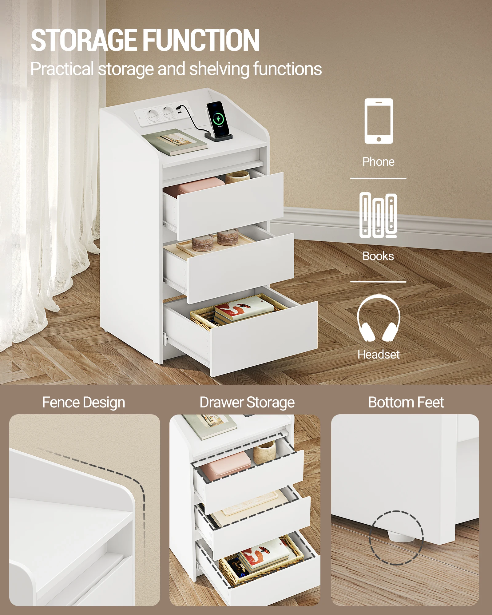 1. Удобная зарядная станцияУгловая зарядная панель является выдающейся особенностью этой прикроватной тумбочки для легкой зарядки по принципу «подключи и работай».Прикроватная тумбочка оснащена 2AC и 2USB для зарядки мобильных телефонов, планшетов и других устройств.А 1.В комплект входит 5-метровый кабель, поэтому вам не нужно вставать с кровати и идти в розетку для зарядки.