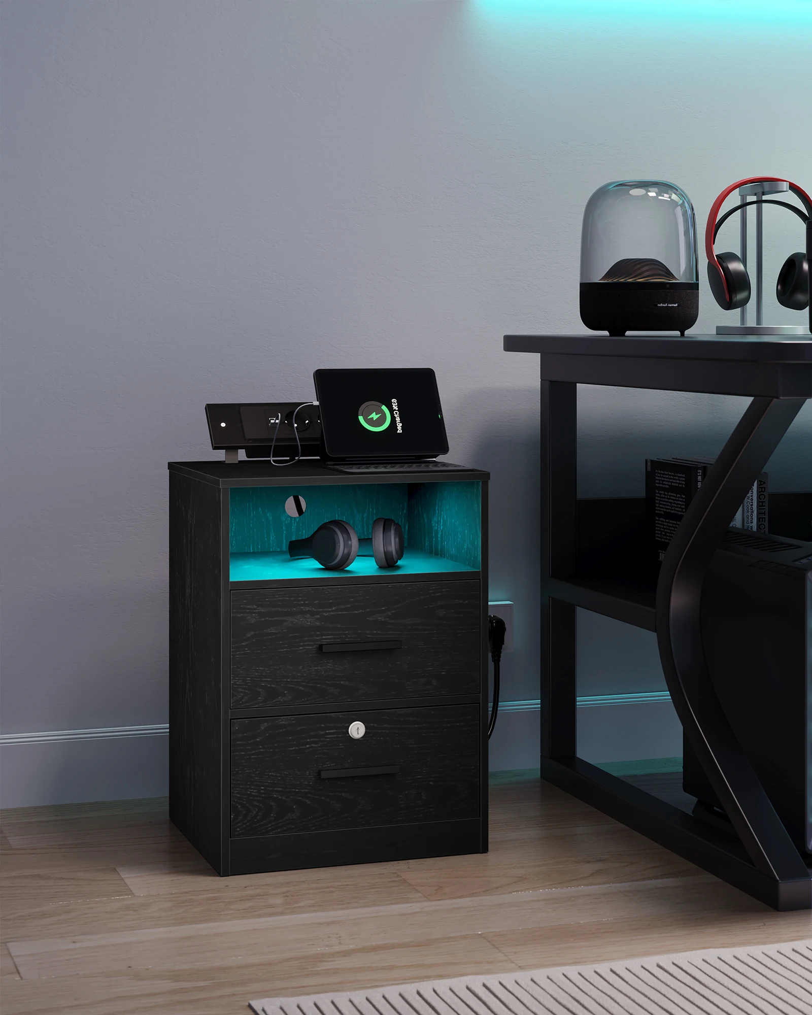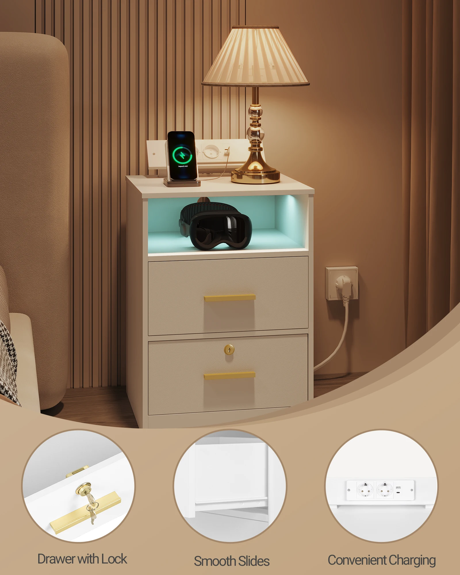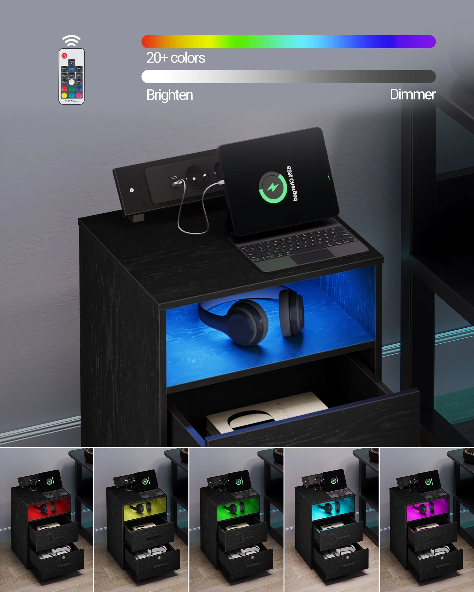 【Светодиодное освещение】В дополнение к удобным функциям хранения и зарядки эта прикроватная тумбочка также оснащена светодиодными лентами.Вы можете выбрать один из 20 цветов и настроить частоту мигания.Вы можете настроить цвет света в соответствии со своими предпочтениями, создавая романтическую и комфортную среду для сна в вашей спальне.