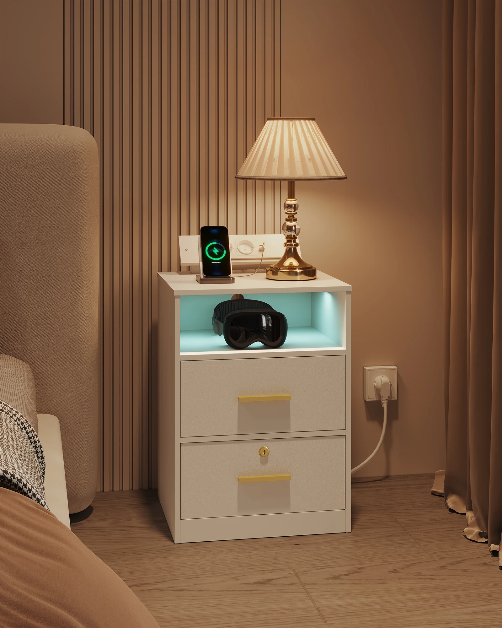 Набор прикроватных столиков Hzuaneri из 2 шт., с зарядной станцией, приставным столиком со светодиодной подсветкой, 1 открытым отделением и 2 ящиками, белый