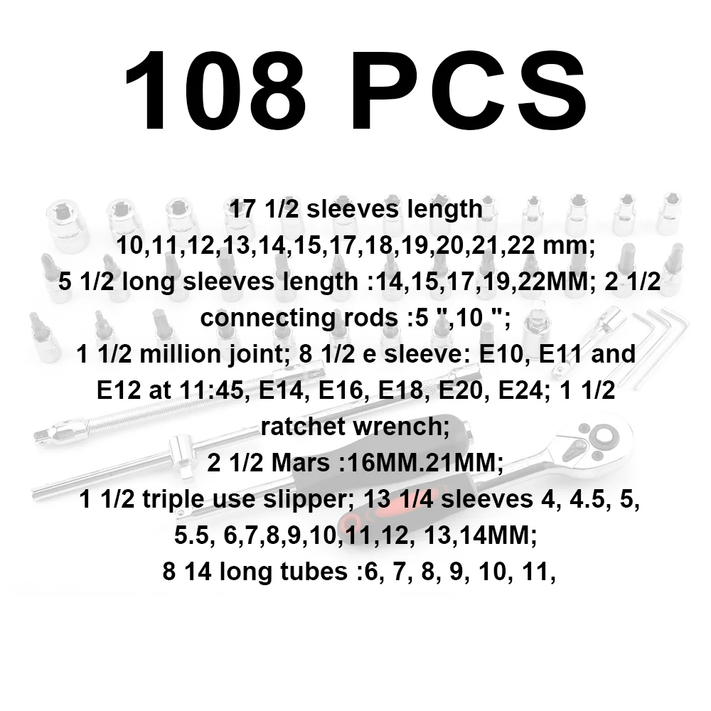 Набор торцевых ключей с храповым механизмом, 108 шт., наборы инструментов для ремонта автомобилей, комбинированный динамометрический ключ с храповым механизмом, гаечный ключ с храповым механизмом, отвертки, ручной инструмент