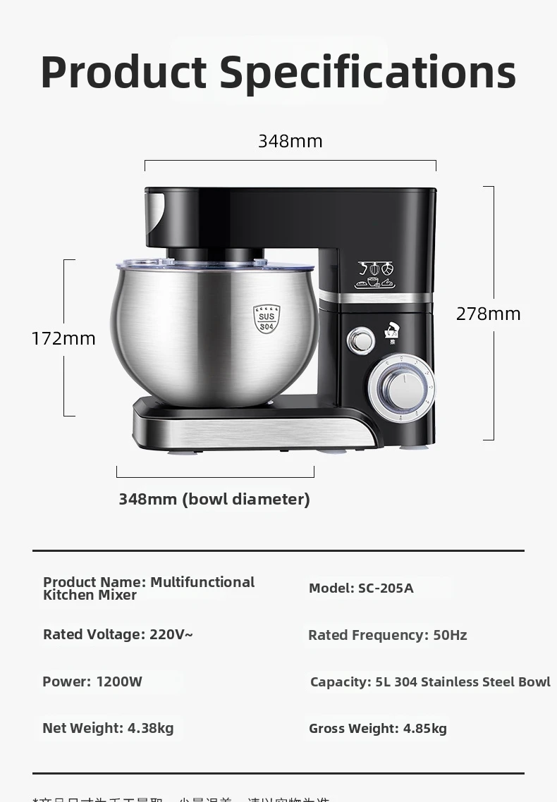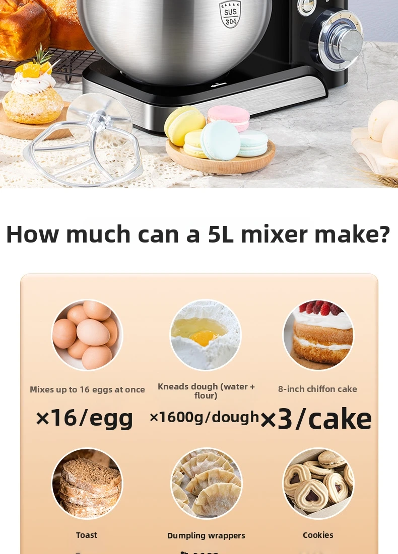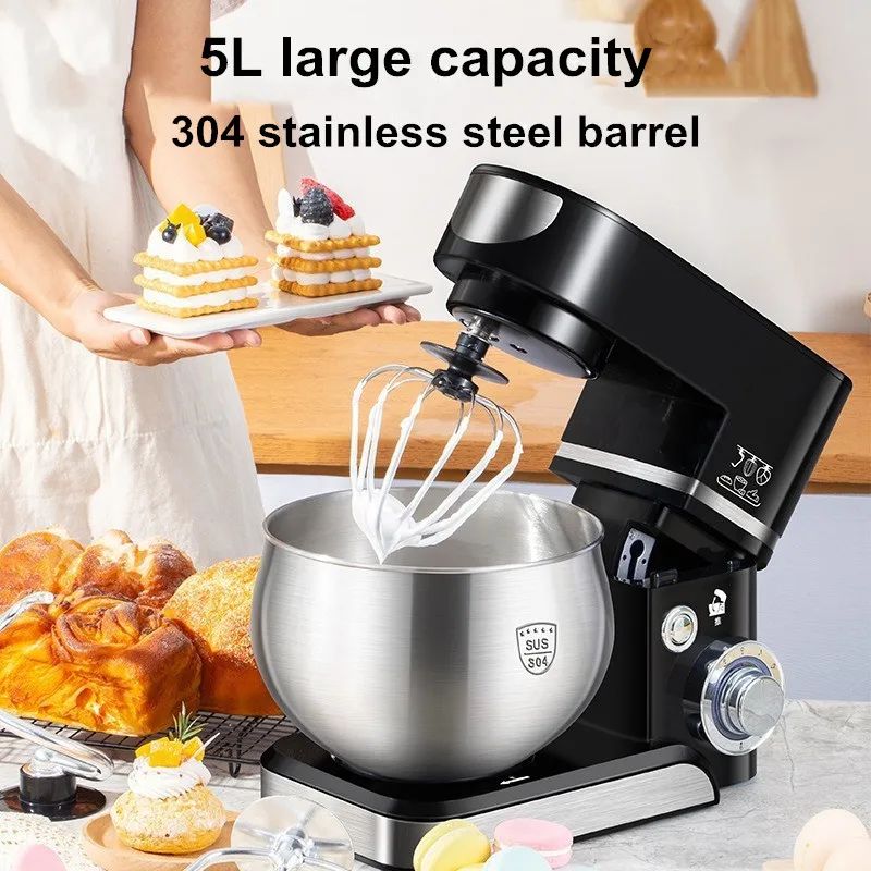Настольный миксер на 5 л — многофункциональная кухонная машина 3-в-1 с крючком для теста, венчиком и венчиком, мощным двигателем 1000 Вт для выпечки/приготовления пищи