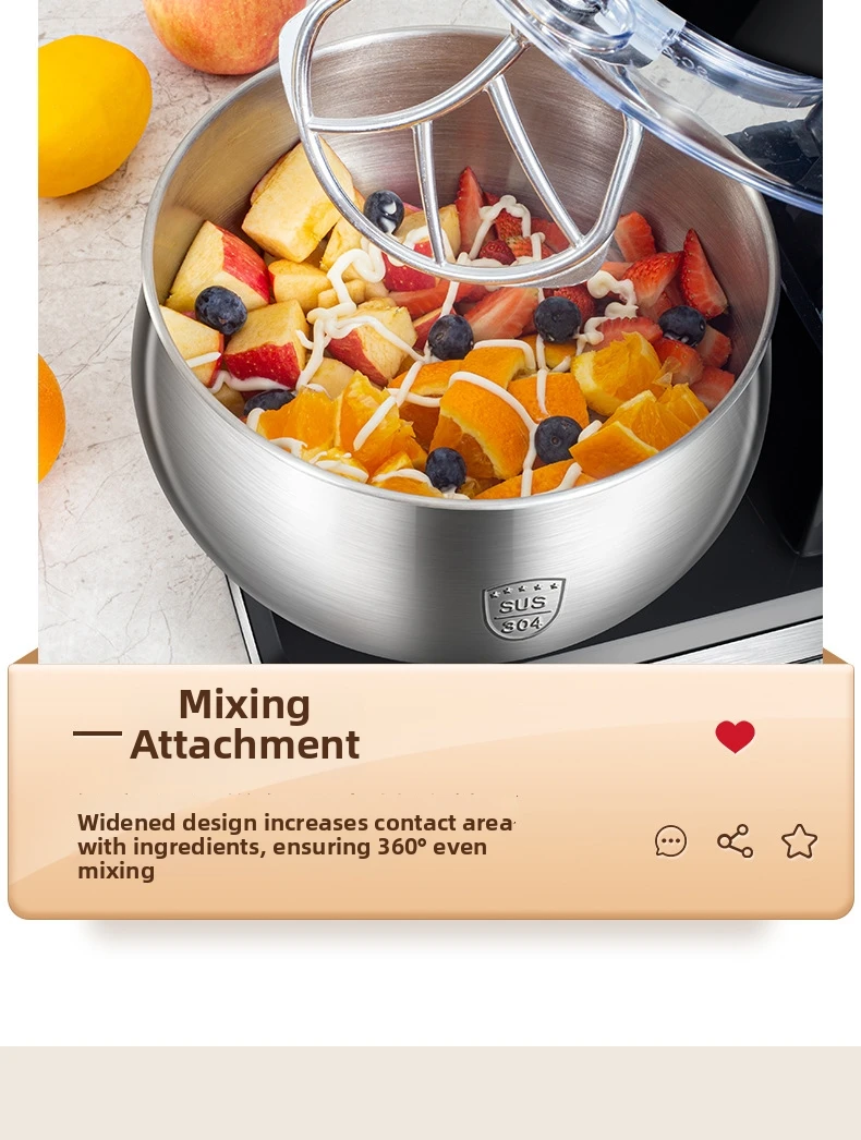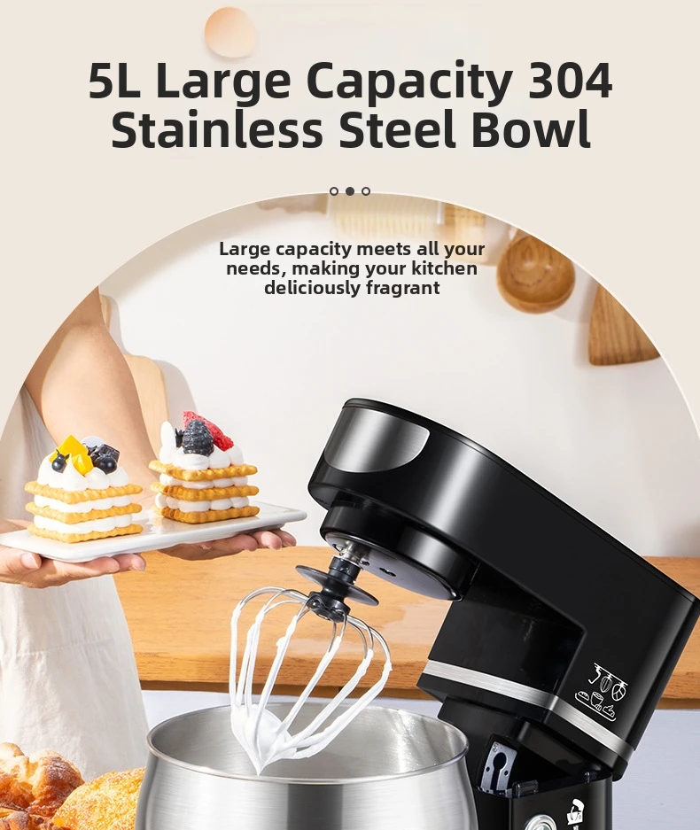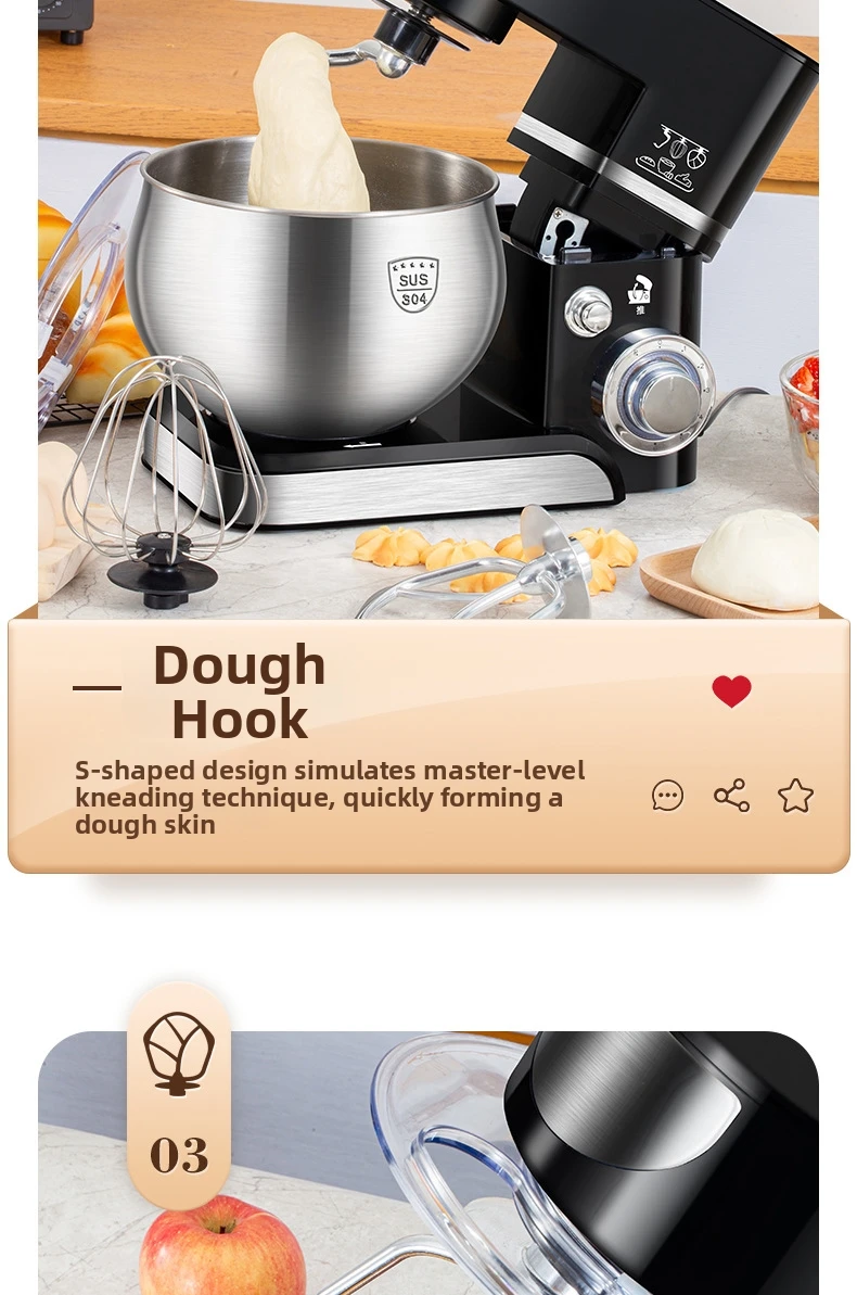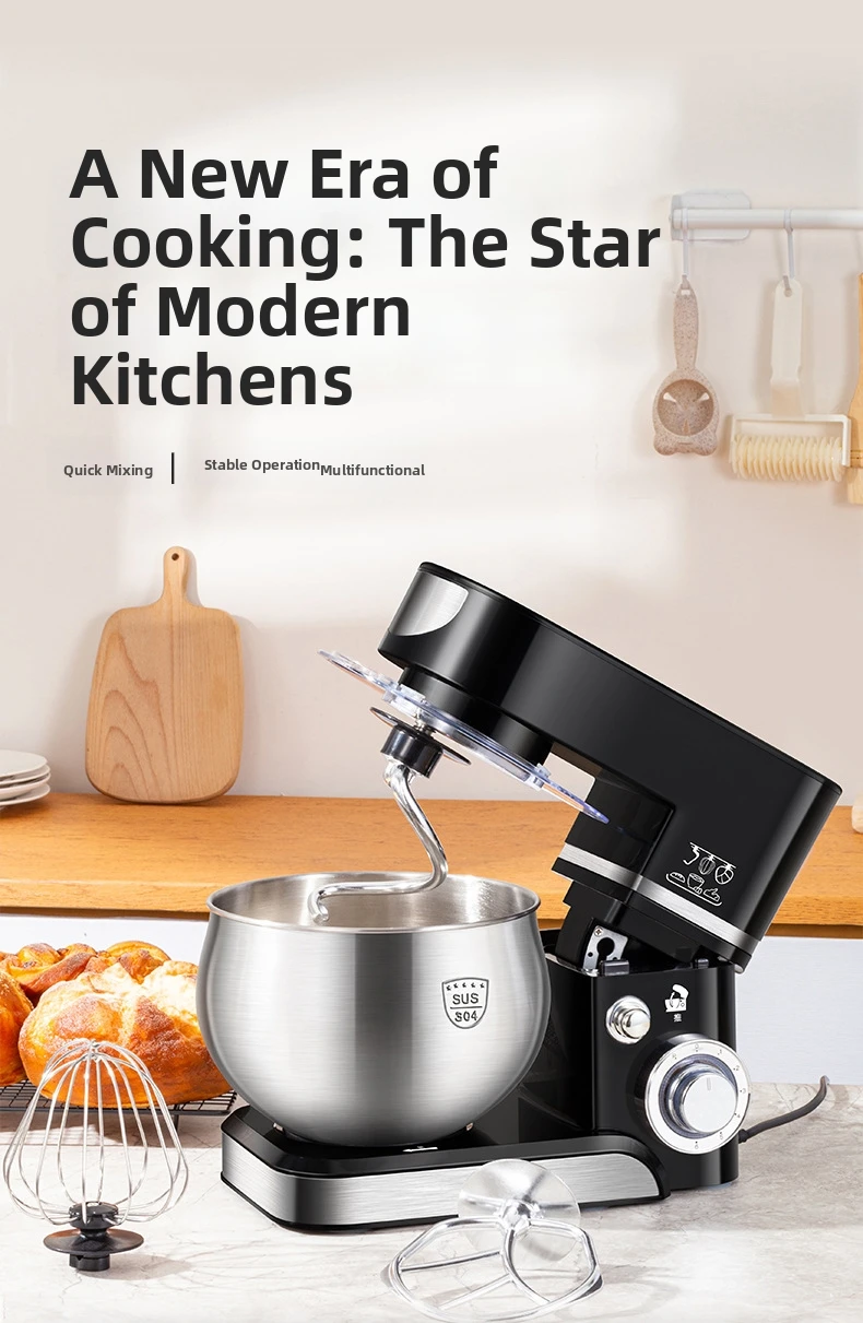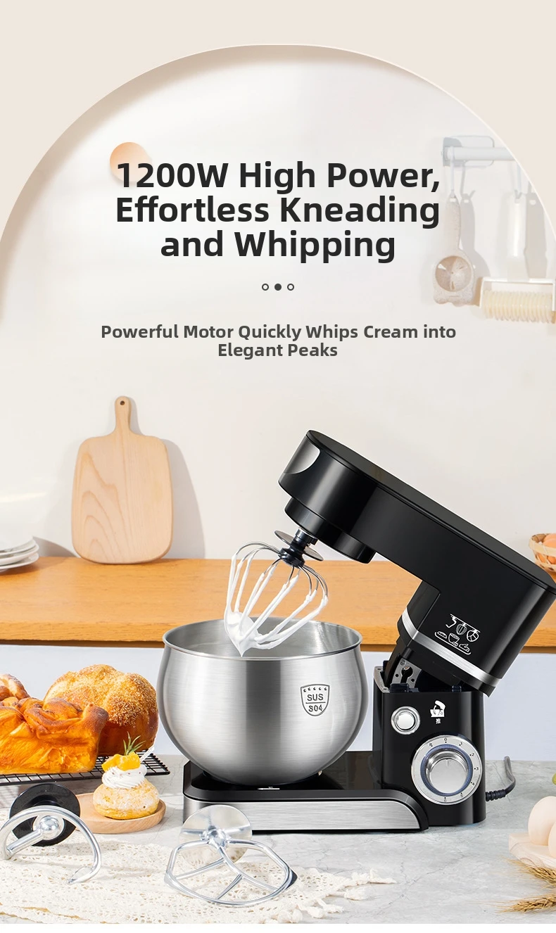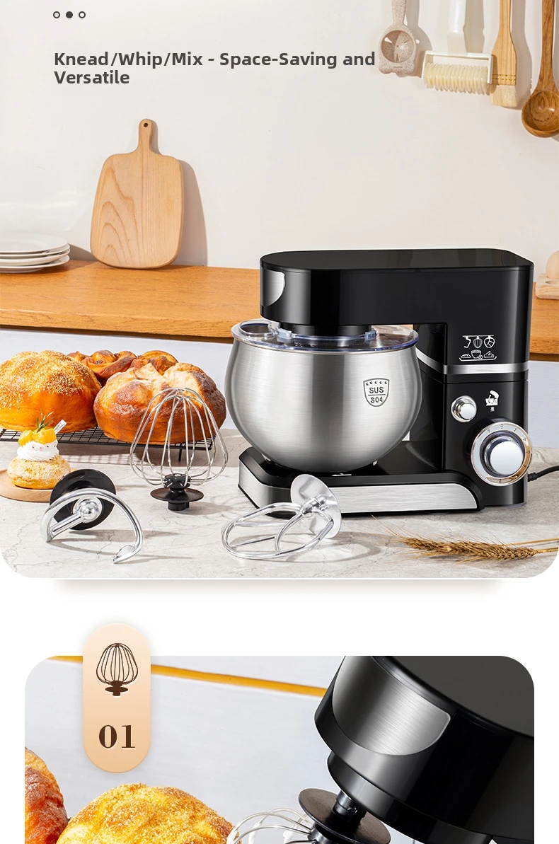 Эта кухонная машина 3-в-1 оснащена крюком для теста, венчиком и насадкой для взбивания, что делает её универсальной для различных кулинарных задач.