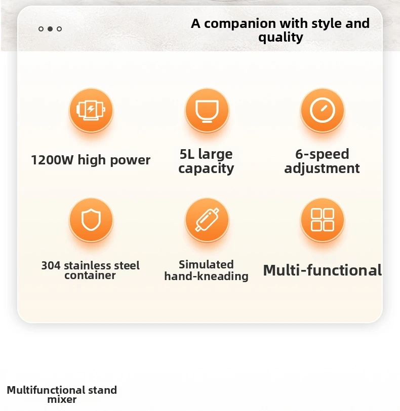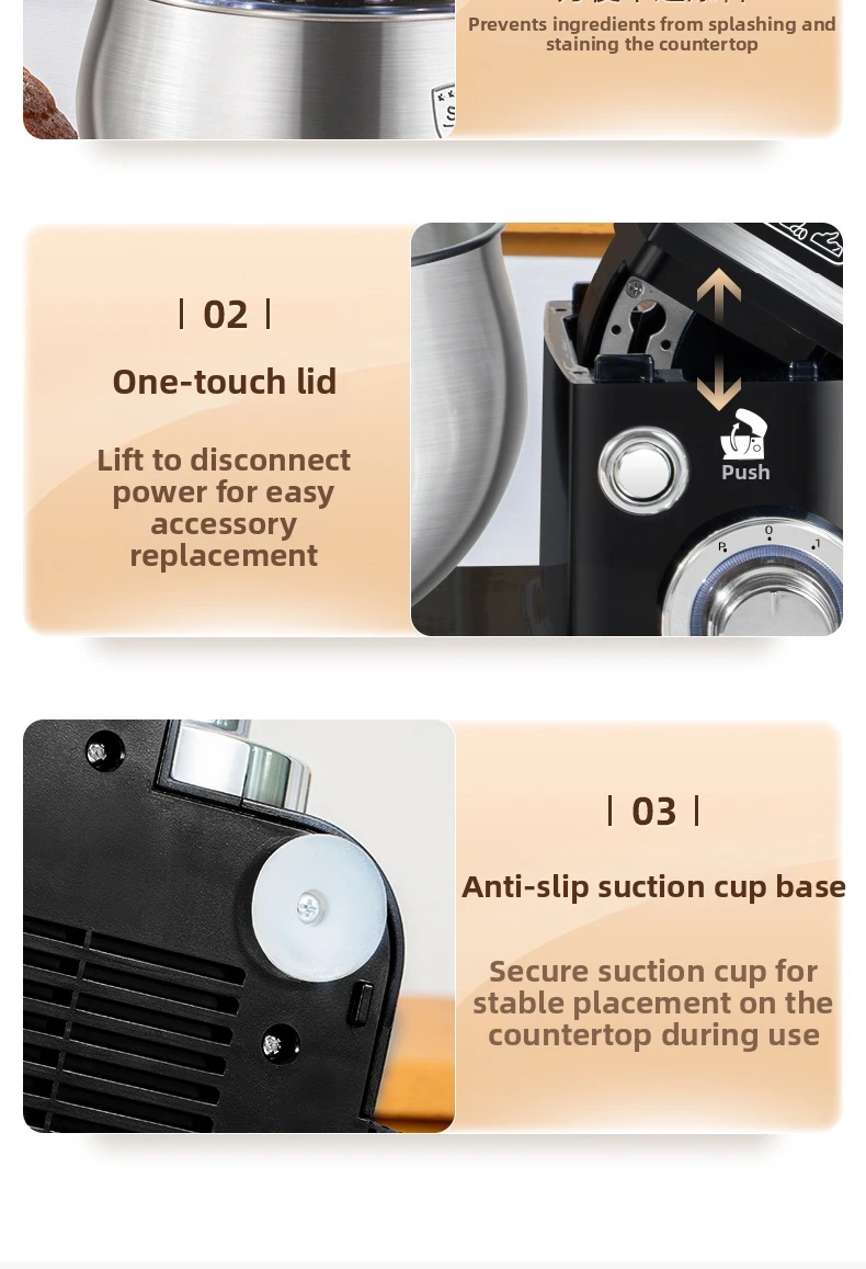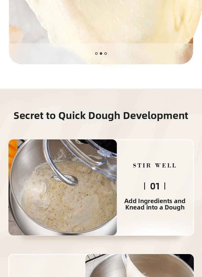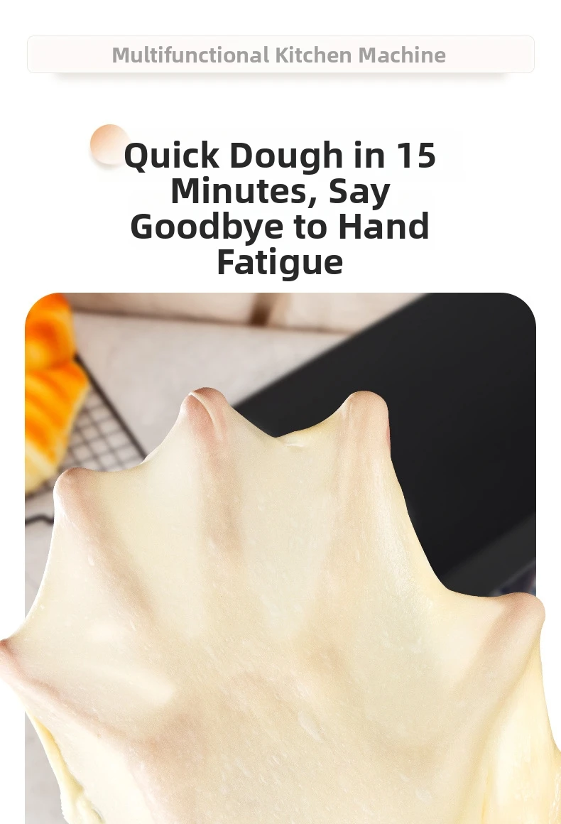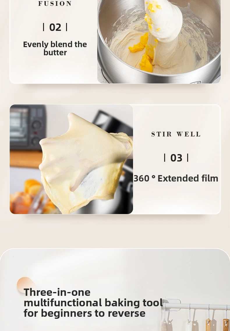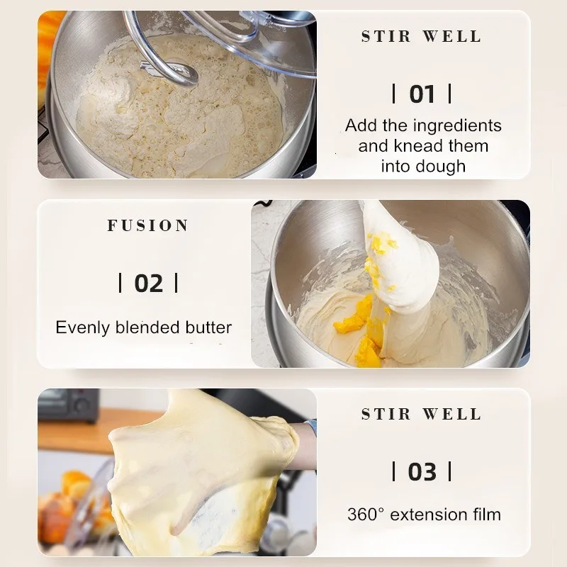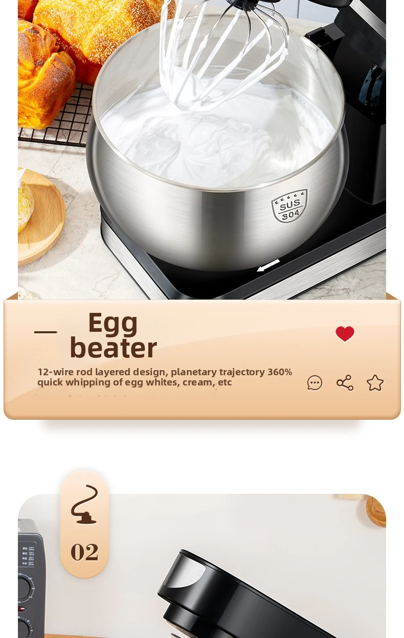 Эта кухонная машина 3-в-1 оснащена крюком для теста, венчиком и насадкой для взбивания, что делает её универсальной для различных кулинарных задач.