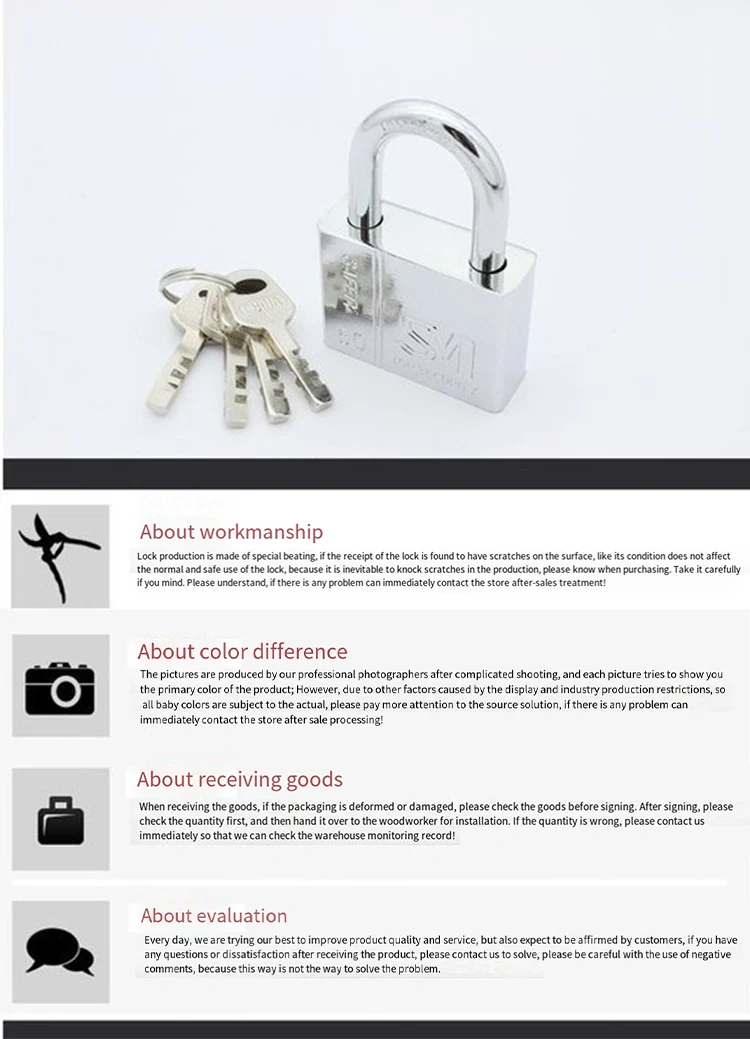 Этот замок кажется свободным?На самом деле он не рыхлый.Это связано с концепцией безопасности и долговечности конструкции цельностального навесного замка.В обычном небольшом замке первого поколения имеется пружина для затягивания подвесной балки, но если замок подберет или пружина будет использована в течение длительного времени для выбора мертвого замка, ее невозможно открыть нормально.Наша подвесная балка не имеет пружинного подъема, поэтому ее нужно слегка вытянуть вручную.Такая конструкция Даже если навесной замок ржавеет, его можно открыть нормально.Долговечность – преимущество этого замка.
