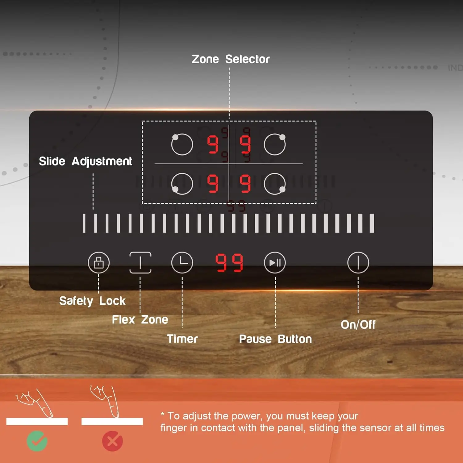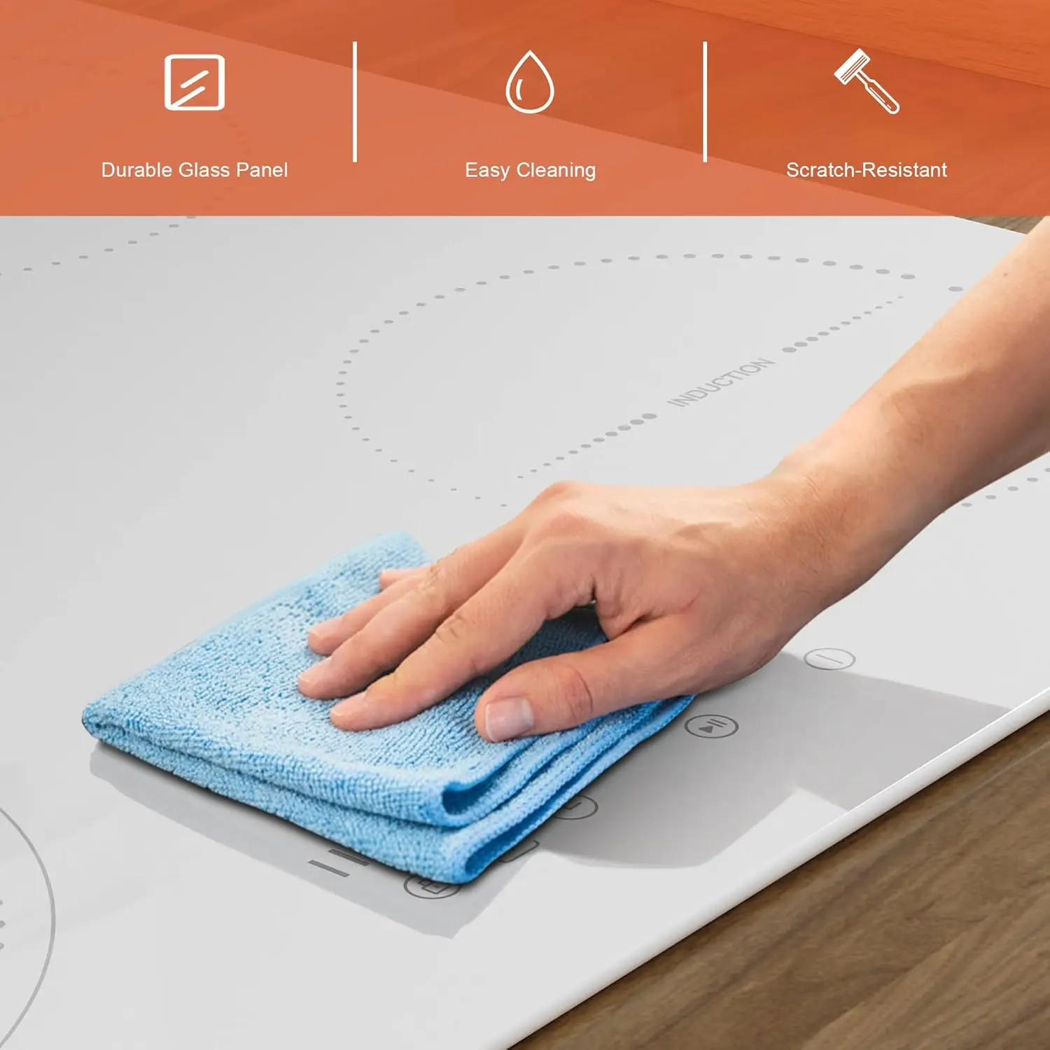 👆【Чувствительное сенсорное управление】Индукционную варочную панель нужно только отрегулировать для питания с помощью скользящего прикосновения пальца.Поверхность из черного стекла легко чистится влажной тряпкой.