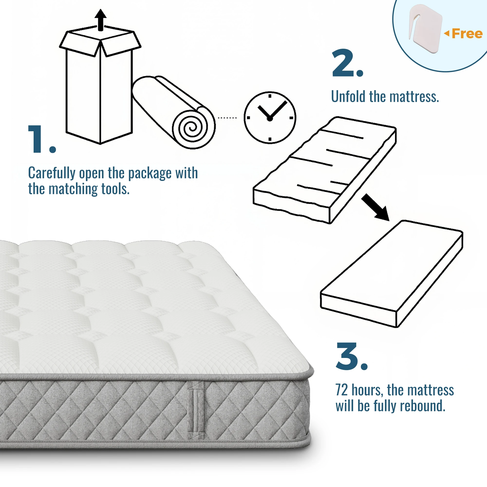 5. 【Поставляется в форме вакуумного рулона】Матрас поставляется в свернутом виде и вакуумной упаковке. Пожалуйста, позвольте матрасу полностью растянуться как минимум на 72 часа, чтобы насладиться лучшим сном. Дружеское напоминание: при распаковке будьте осторожны, чтобы не поцарапать матрас острыми предметами.