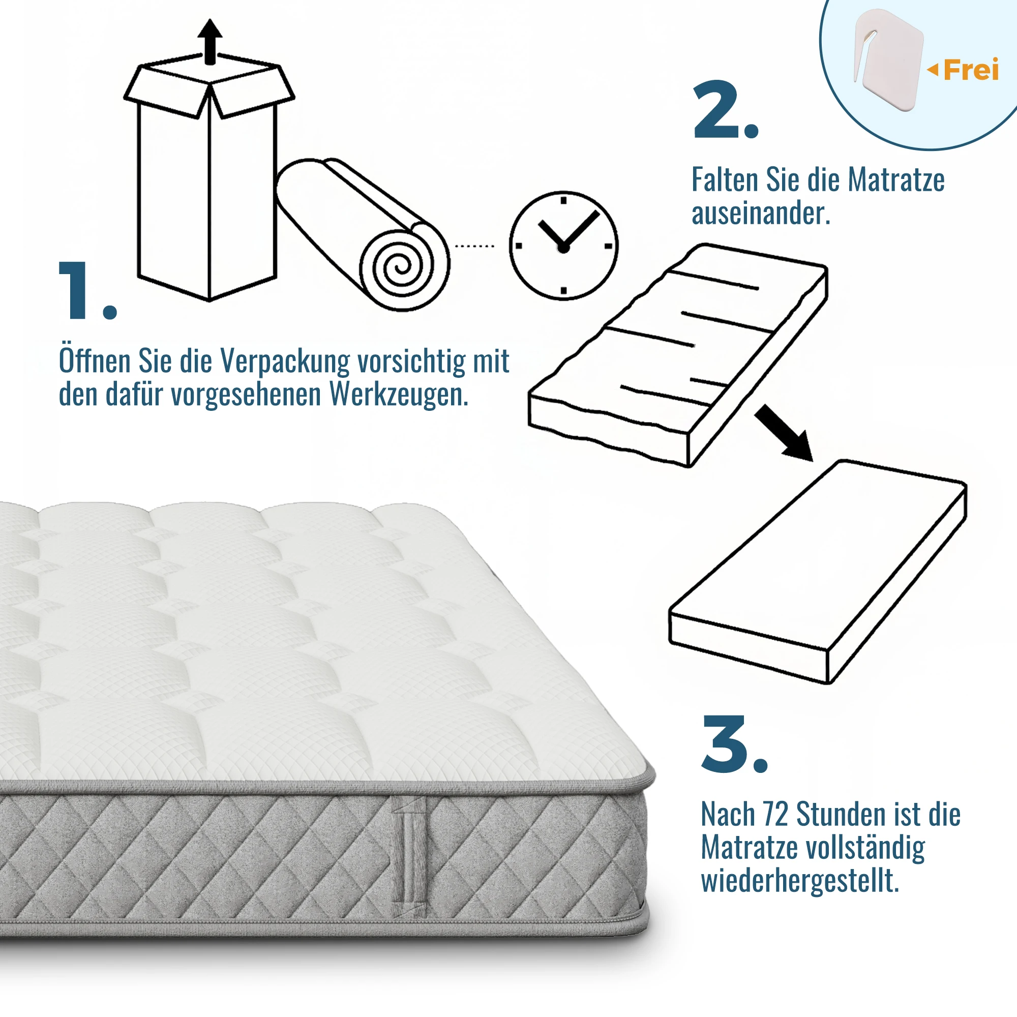 4.【Безопасное и надежное качество с сертификацией】Сделано из OEKO-TEX.® сертифицированные материалы, матрас гипоаллергенен, приятен для кожи и долговечен.Наши матрасы подходят практически для любой ширины каркаса кровати: 90 / 120 / 140 / 160 / 180 см.Матрас имеет по бокам две пары ручек для удобства перемещения.