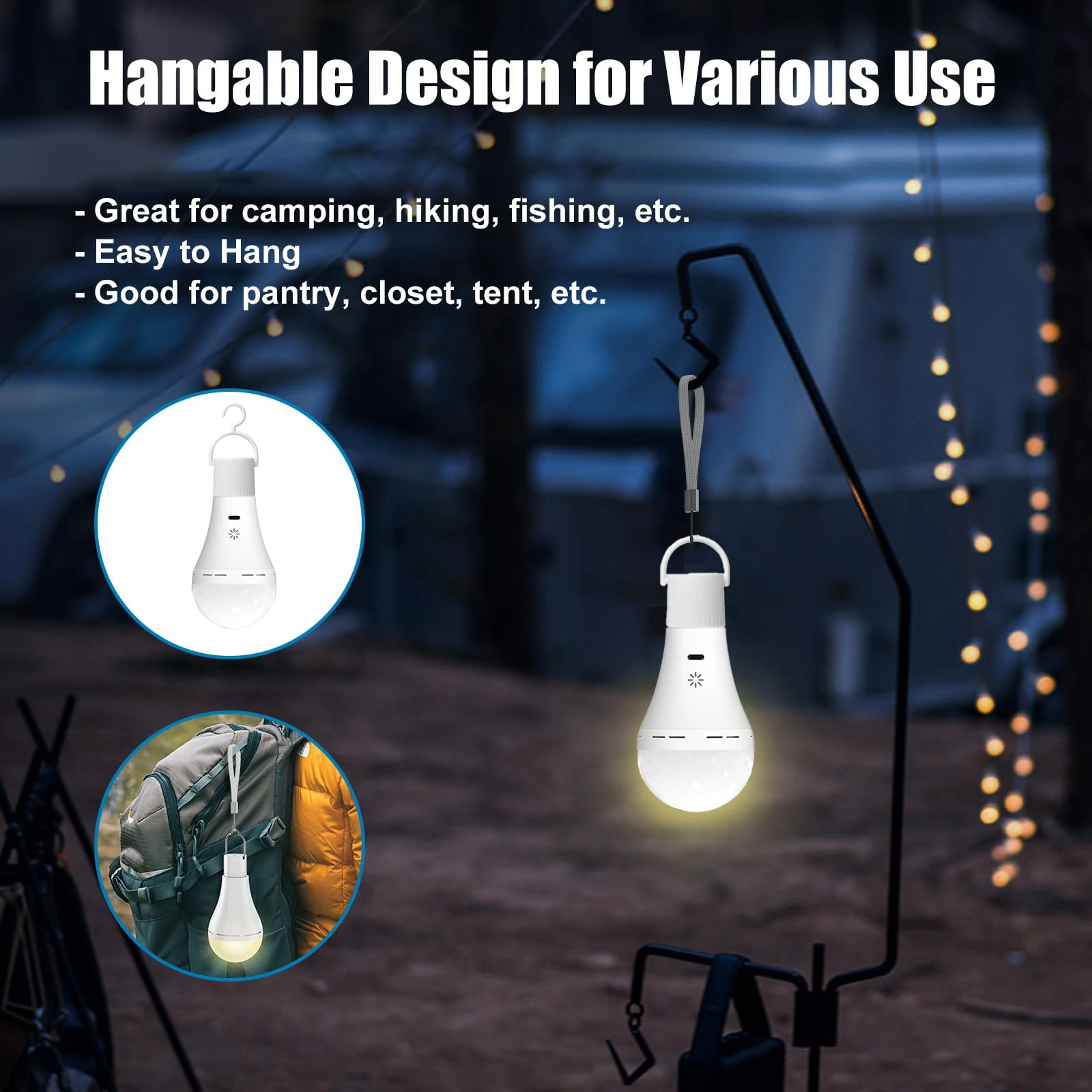 · 【Более, чем светодиодная лампа 】- Благодаря дополнительному верхнему основанию с крючком и ремешком перезаряжаемая светодиодная лампа — это больше, чем просто обычная лампочка для лампы или подвесного светильника.Вы можете использовать его в качестве десяти уличных фонарей, позволяющих исследовать приключения на свежем воздухе, такие как кемпинг, рыбалка, походы и т. д.Также отлично подходит для продавцов, небольшого выпечки, фермерского дома, складского дома, гаража, сарая, подвала или любого места, где вам нужен временный дополнительный свет.