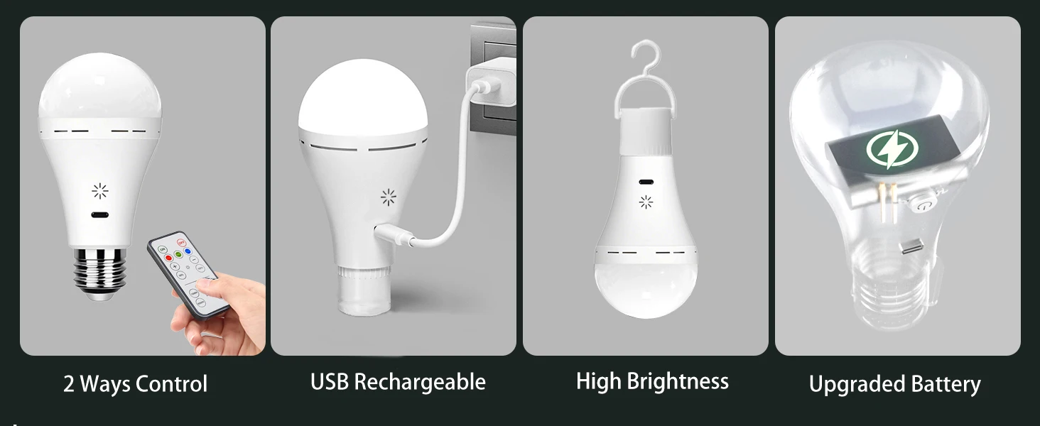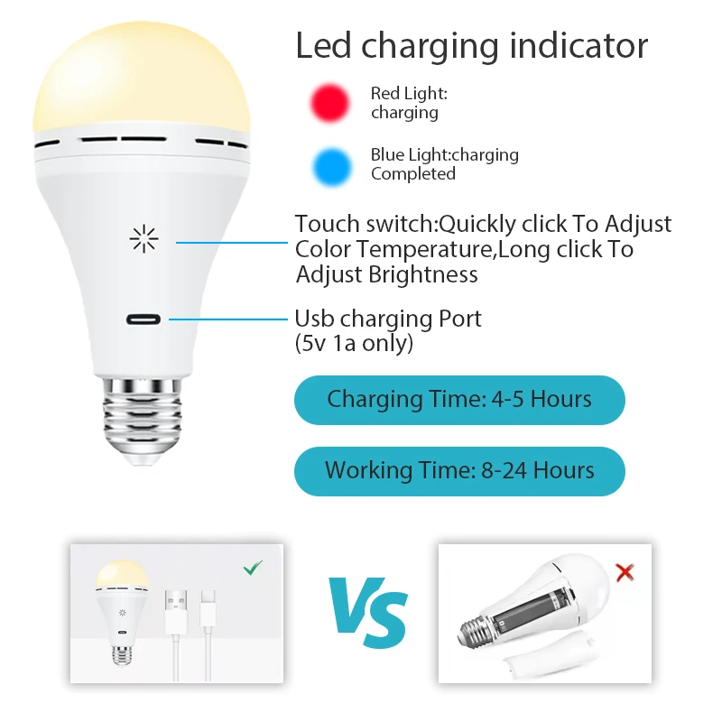【Подвесная лампочка для отключения электроэнергии в доме 】- Эта аварийная лампочка с резервным питанием от аккумулятора мощностью 7 Вт обеспечивает яркость 700 люмен, удобную для жизни, что эквивалентно лампе накаливания мощностью 40 Вт.Вы можете выбрать: теплый белый, натуральный белый и холодный белый.Полная зарядка занимает 4-6 часов, а работа длится.8-24часы.Вы можете заряжать эту лампочку с помощью прилагаемого USB-кабеля Type-C.