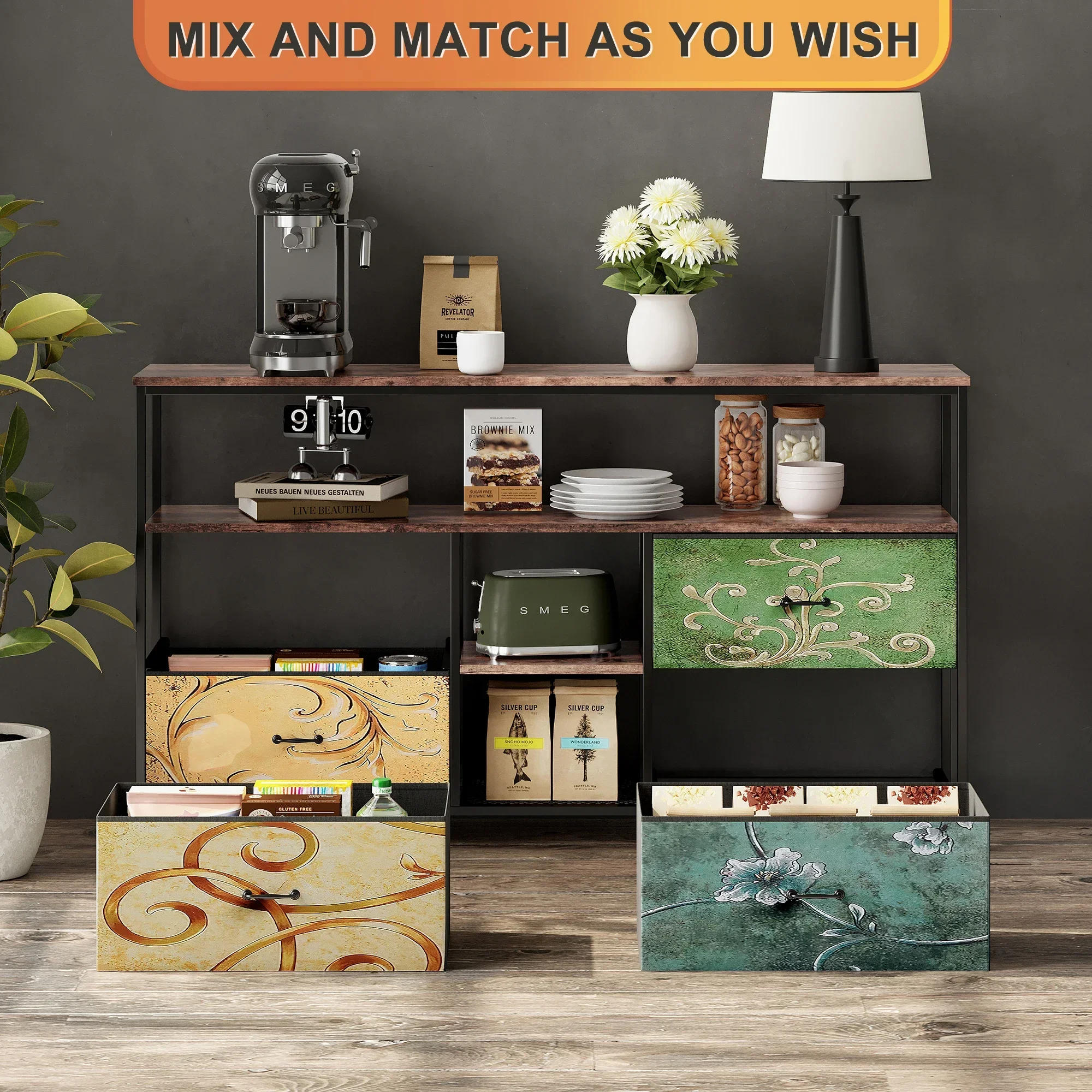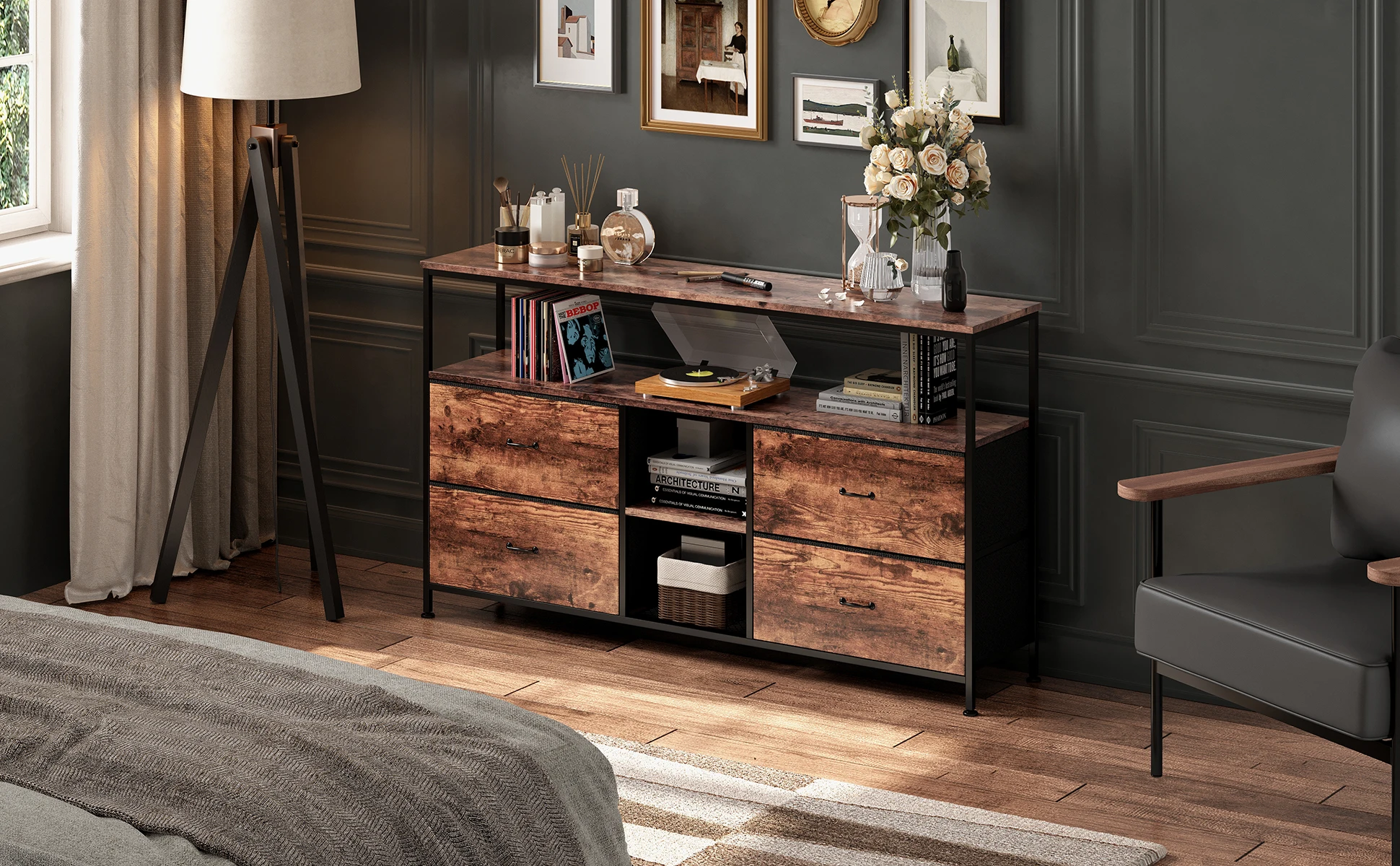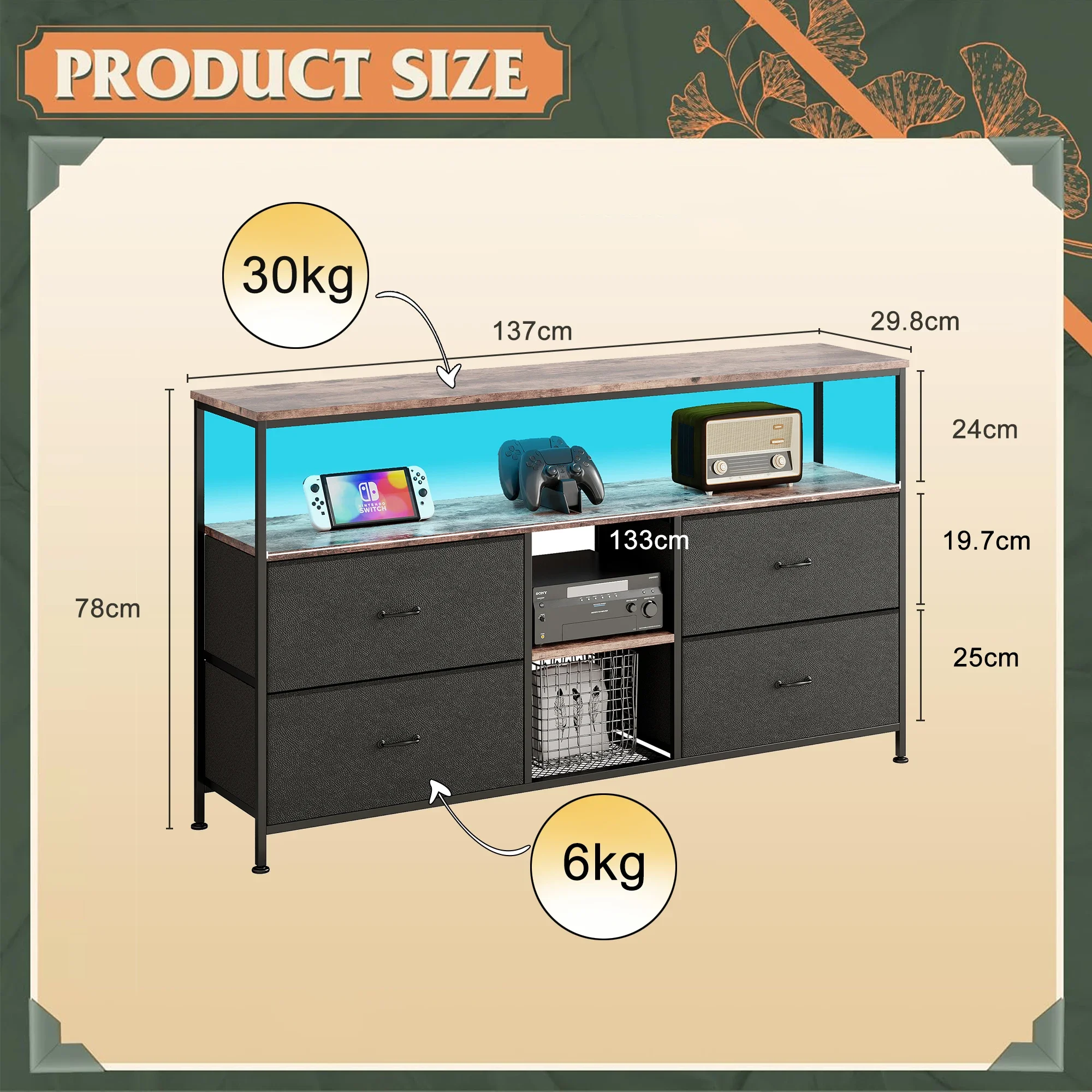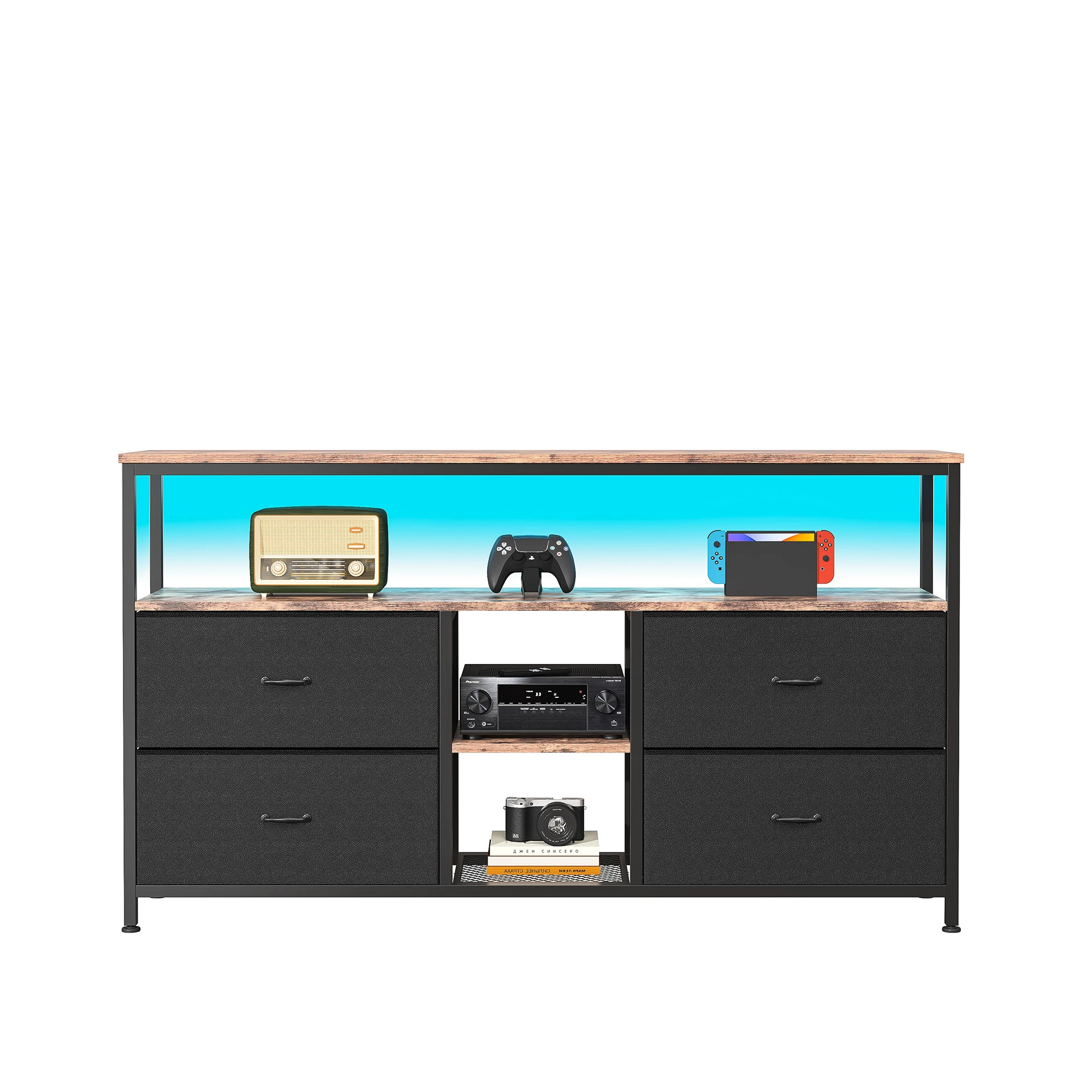 Эта подставка для телевизора имеет просторную столешницу и четыре тканевых ящика, в которых можно легко хранить игровые аксессуары, книги и другие предметы.Регулируемые полки обеспечивают гибкое хранение более крупных предметов, таких как аудиосистемы и игровое оборудование.