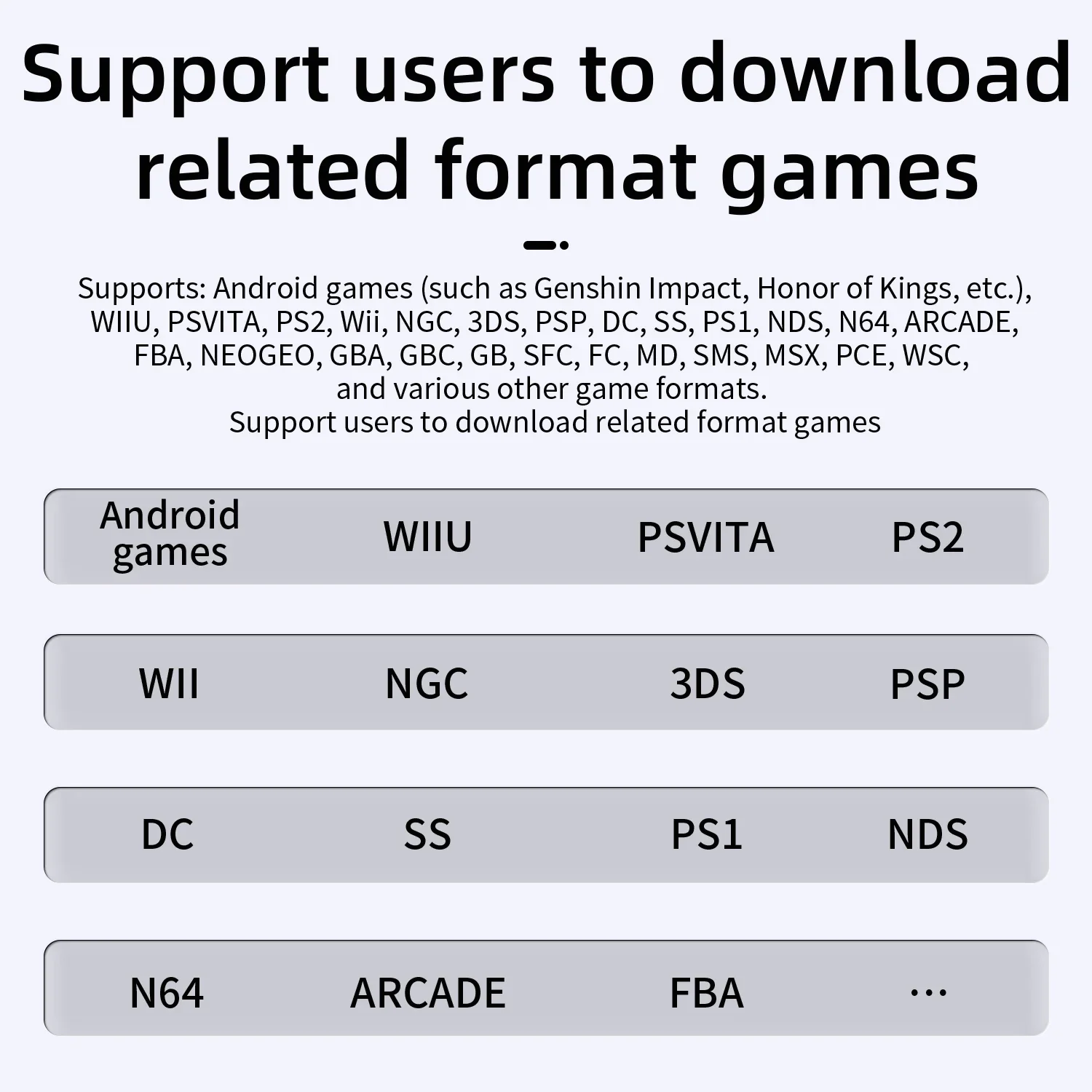 Поддерживает: игры Android (Genshin Impact, Honor of Kings и т. д.), WIIU, PSVITA, PS2, Wii, NGC, 3DS, PSP, DC, SS, PS1, NDS, N64, CPS1, CPS2, CPS3, FBA, NEOGEO, GBA, GBC, GB, SFC,