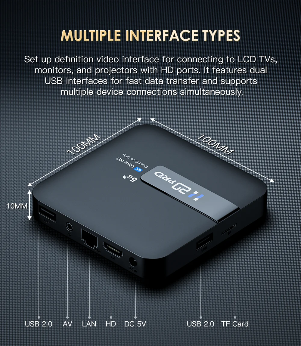 • Умная ТВ-приставка с WiFi6 :HONGTOP H20PRO Smart TV Box оснащен технологией WiFi6, обеспечивающей быстрое и стабильное подключение к Интернету для бесперебойной потоковой передачи.