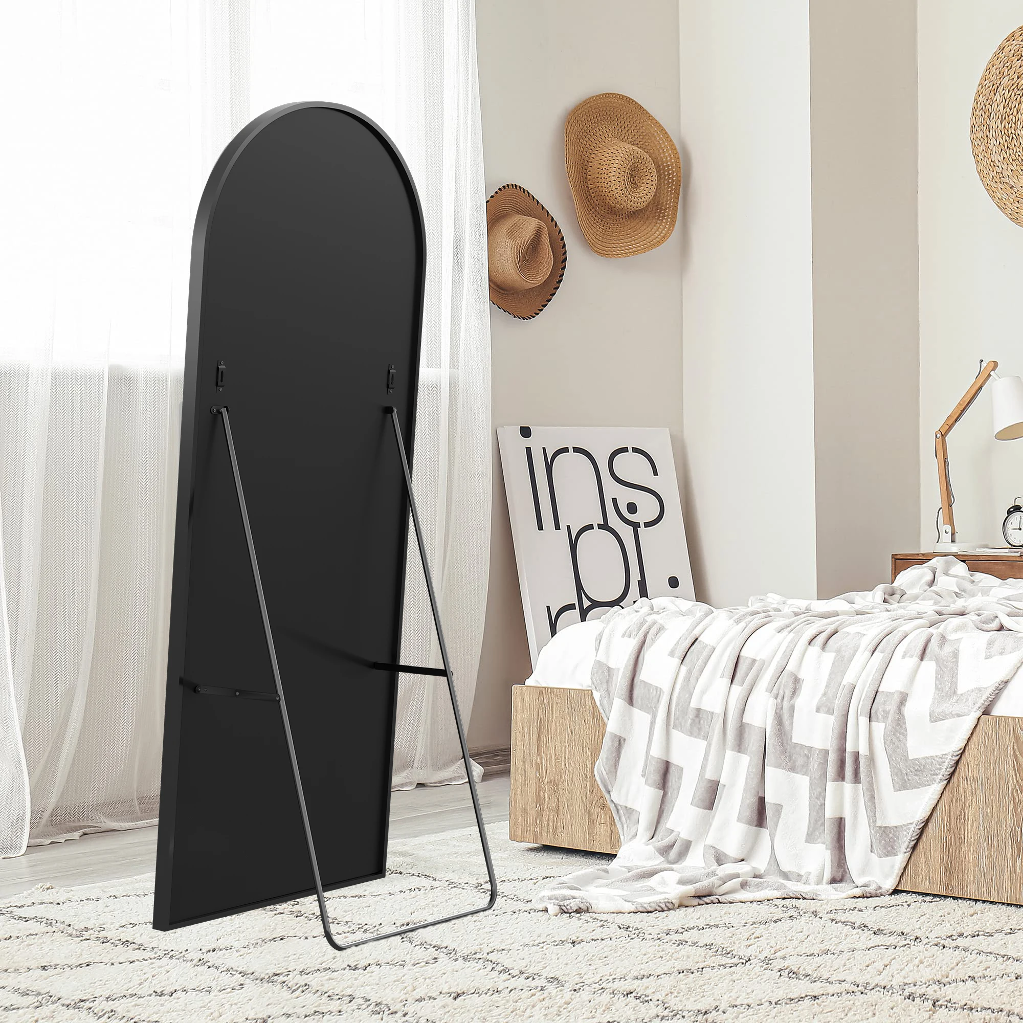 3. Простота установки: отличное стоячее зеркало с изогнутым верхом для наклона, размещения и подвешивания.Предварительно установленные крючки на раме зеркала позволяют легко повесить его на стену.Складной кронштейн также позволяет свободно размещать зеркала в гостиной, спальне и других комнатах.