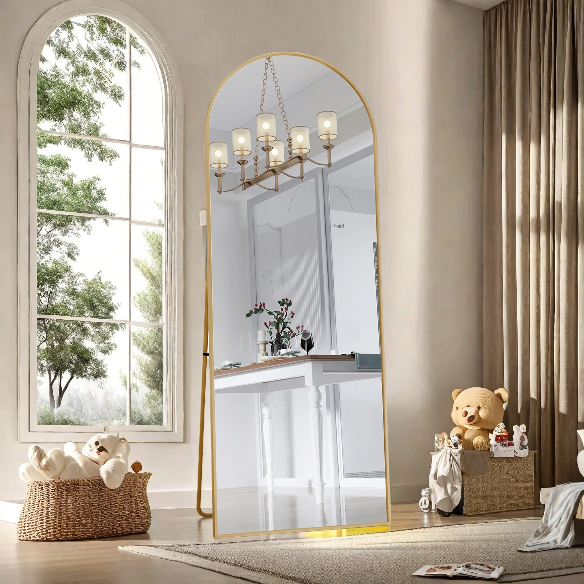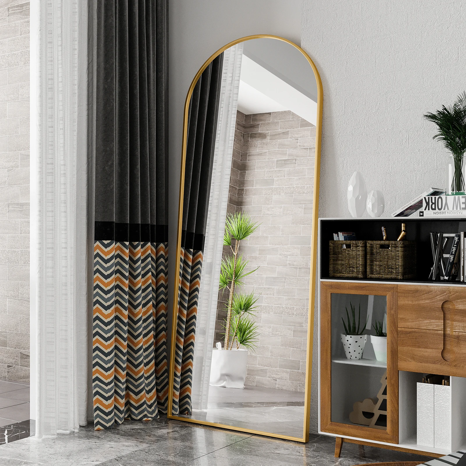 4. Большое стоячее зеркало: размер 40×140 см, 40×150 см, 53×162 см, 60×165 см, 80×180 см. Оно отвечает потребностям различных размеров пространства, зеркало во всю длину представляет собой универсальную отражающую поверхность и способствует визуальному расширеннию пространства.Черный/золотой цвет рамки придает зеркалу в полный рост минималистичный вид, а изогнутый верх создает современную эстетику.