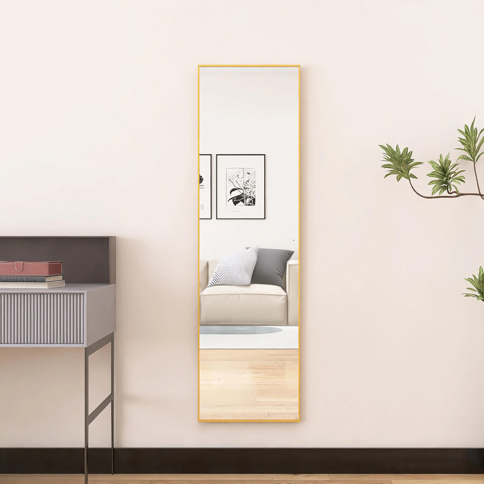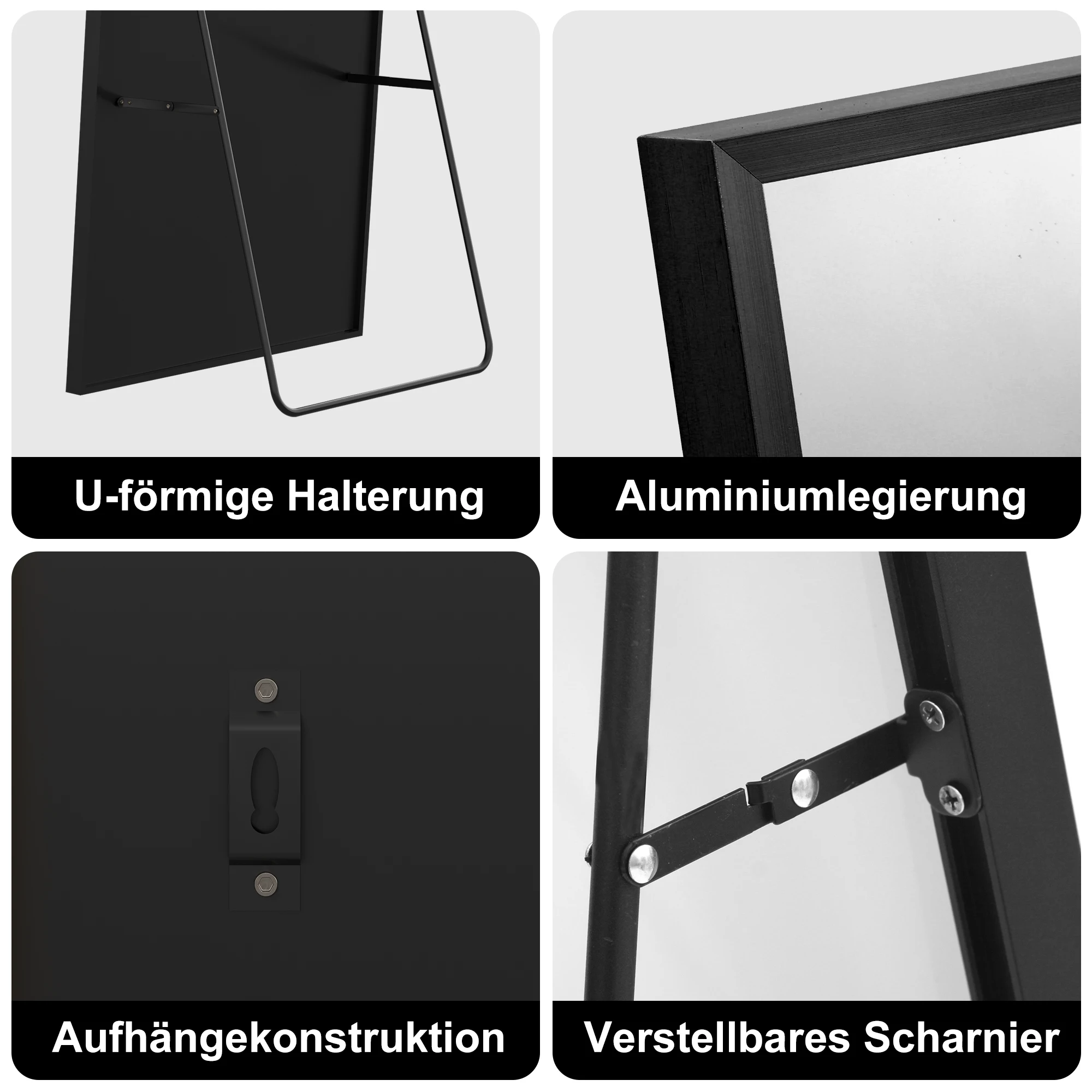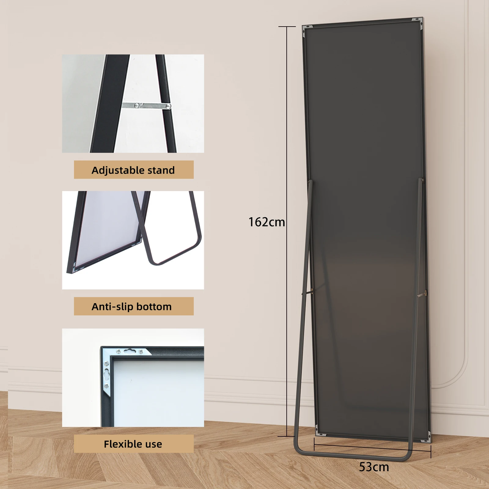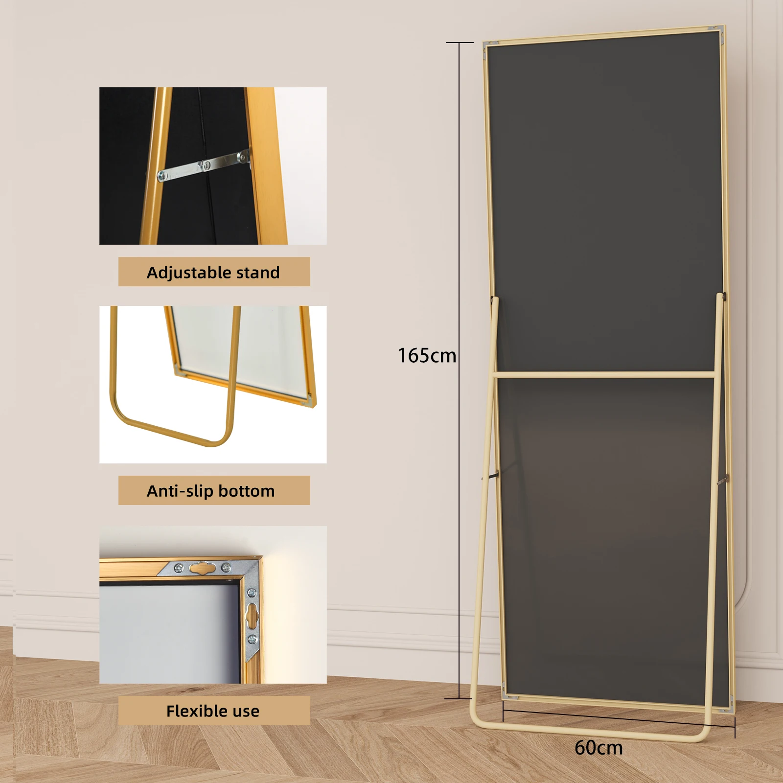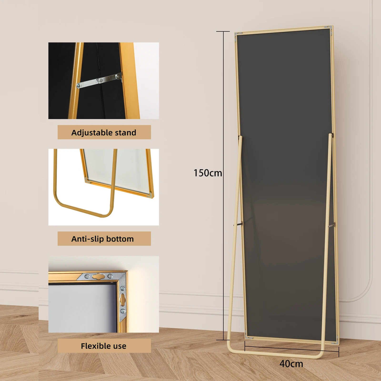 ROSAHQNDA Квадратное зеркало в полный рост, с регулируемой подставкой, простое напольное зеркало, подвесное, черная/золотая алюминиевая рама
