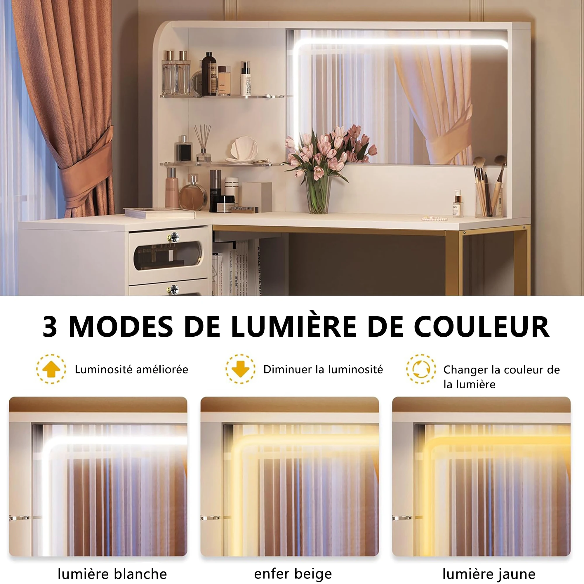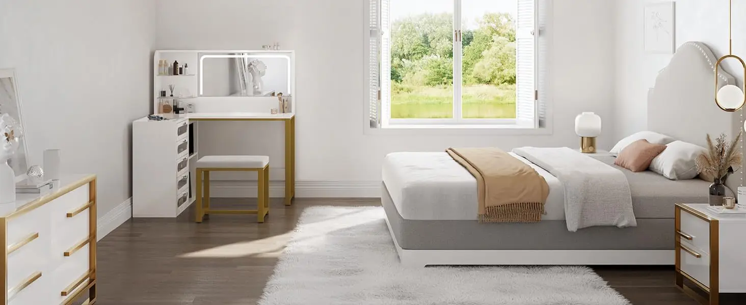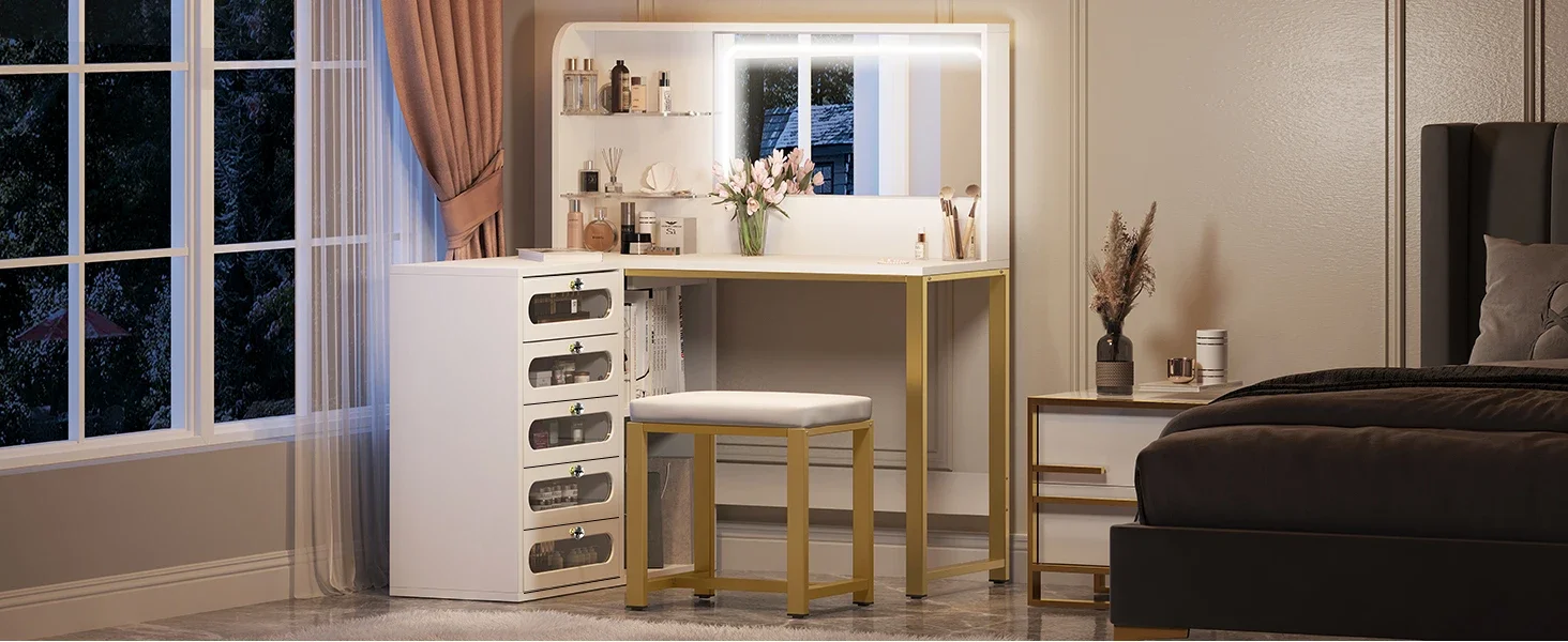 Столешница туалетного столика оснащена большим светодиодным зеркалом и двумя регулируемыми съемными акриловыми перегородками, позволяющими с легкостью организовать косметику.Светодиодное освещение предлагает три варианта цвета, что позволяет настроить освещение так, чтобы оно идеально соответствовало вашему макияжу в любой обстановке.