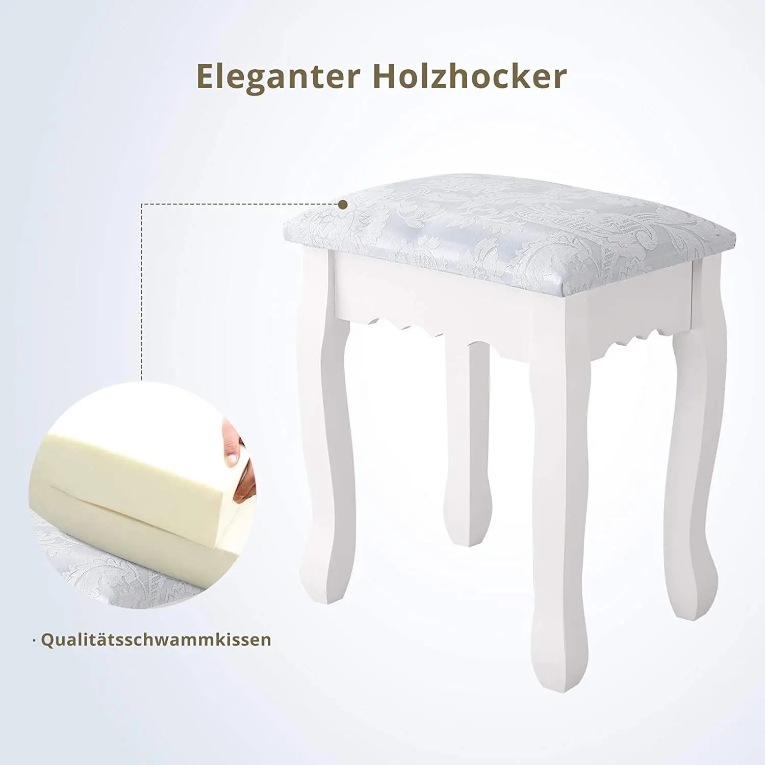 Сопутствующий деревянный табурет сочетает в себе комфорт и очарование.Обтянутый высококачественной губчатой подкладкой и украшенный изысканной резьбой, он подходит для различных жилых помещений — от спален до гардеробных, обеспечивая при этом удобное место во время ритуалов красоты.