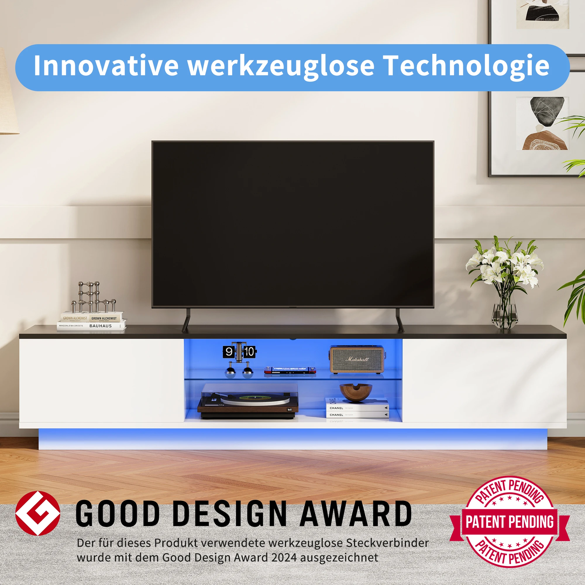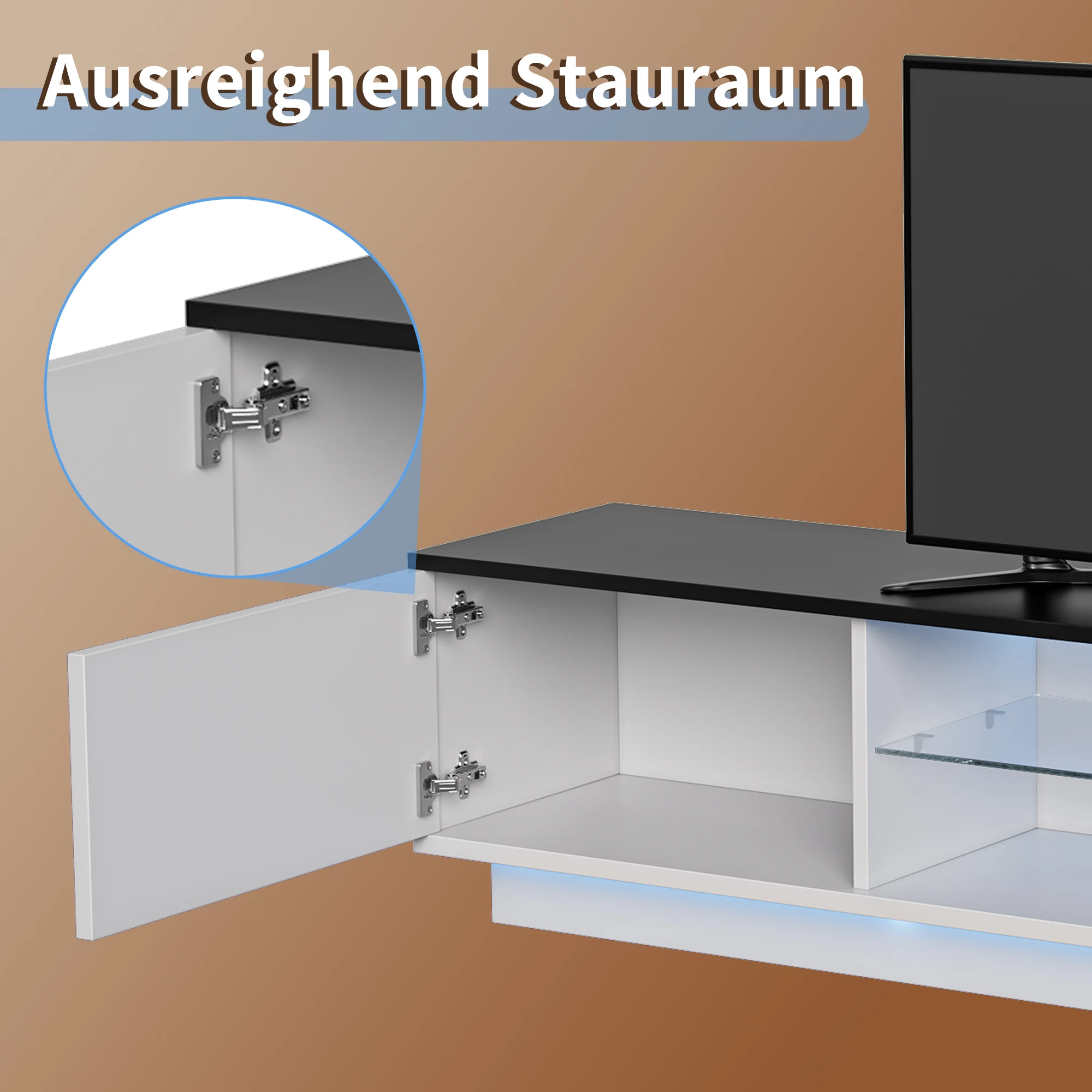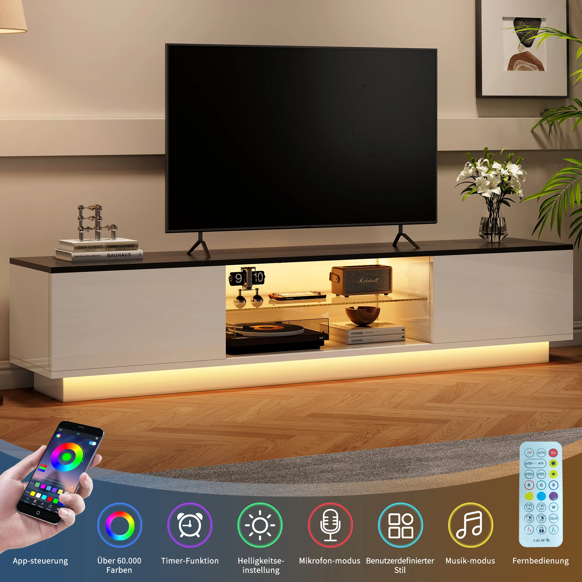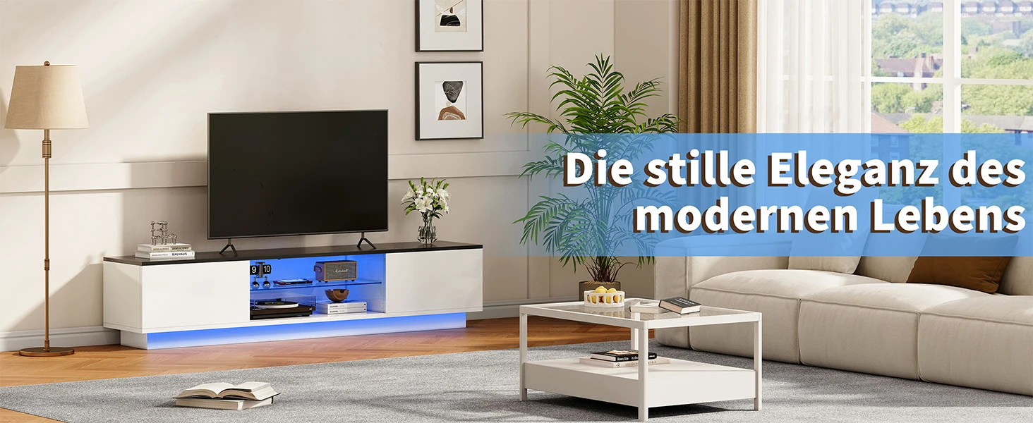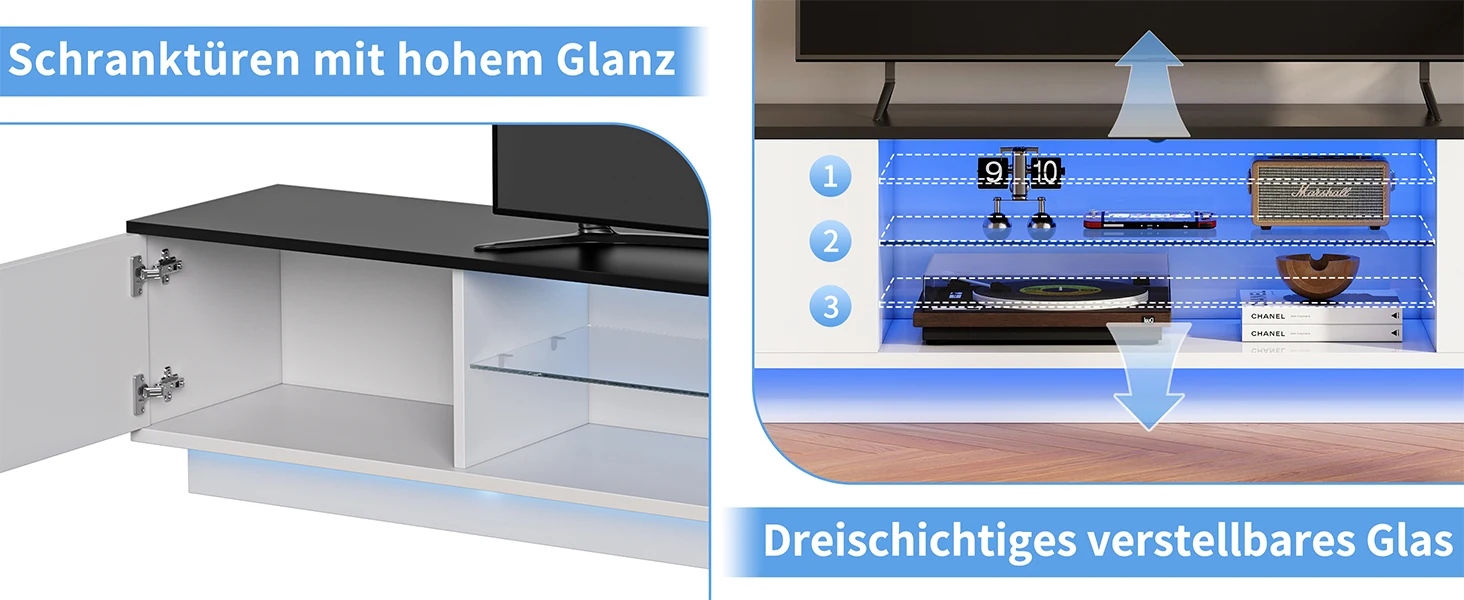 Rosahqnda ТВ-шкаф с 2 дверцами, 2 полками, низкая панель телевизора со светодиодной подсветкой, ТВ-доска для телевизоров до 65 дюймов для гостиной, спальни