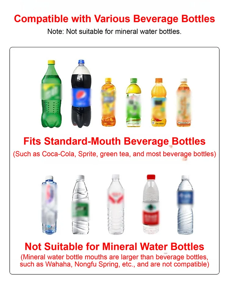 Подходит для бутылок для напитков стандартного калибра (таких как кока, сприт, зеленый чай и большинство других бутылок для безалкогольных напитков).Не подходит для бутылок с минеральной водой (поскольку горловина их бутылок больше, чем у бутылок с напитками и т. д.).).