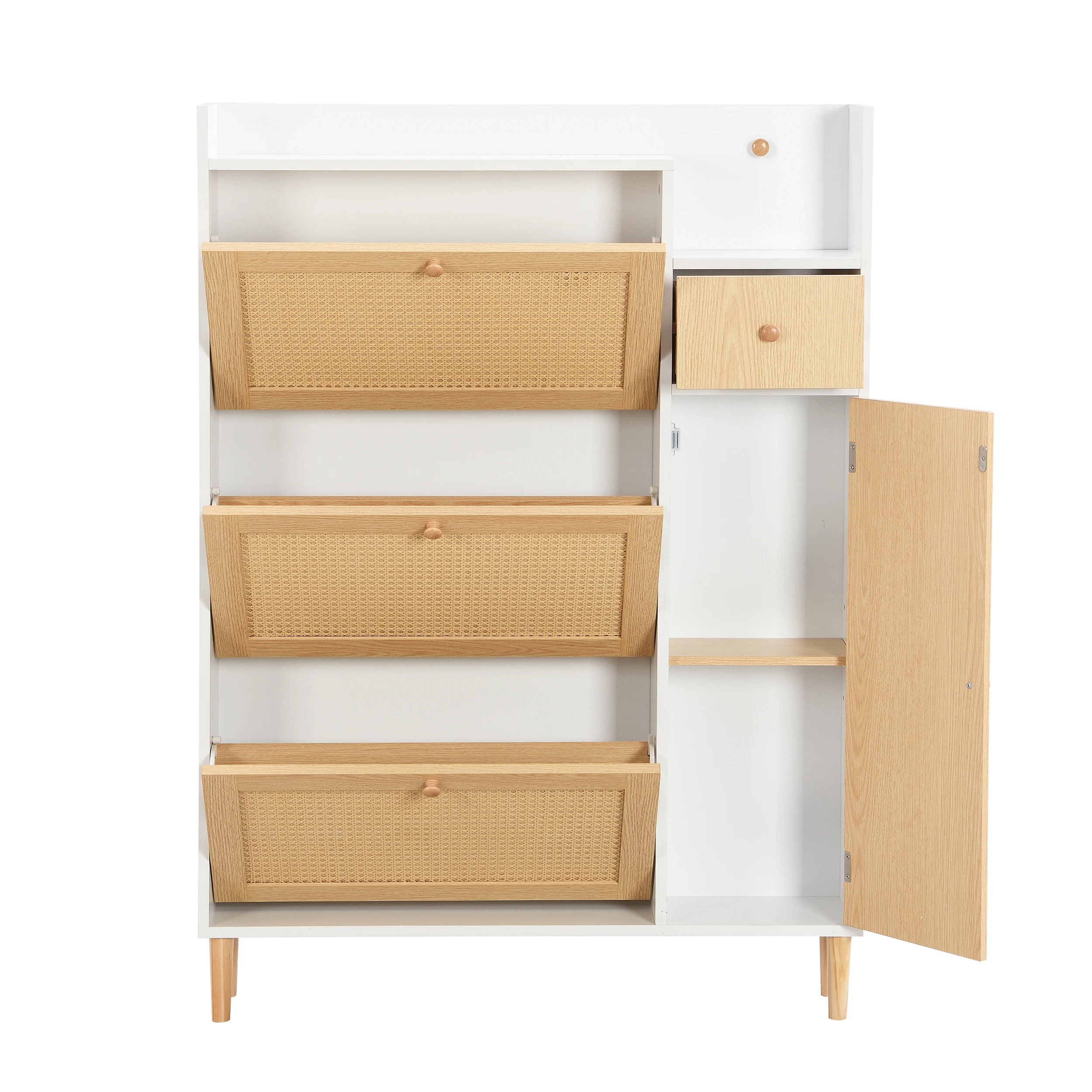 Шкаф для обуви из деревянной ткани из ротанга для узких вход, 3 наклонных двери, 1 ящика, ножки из массива дерева и ручки
