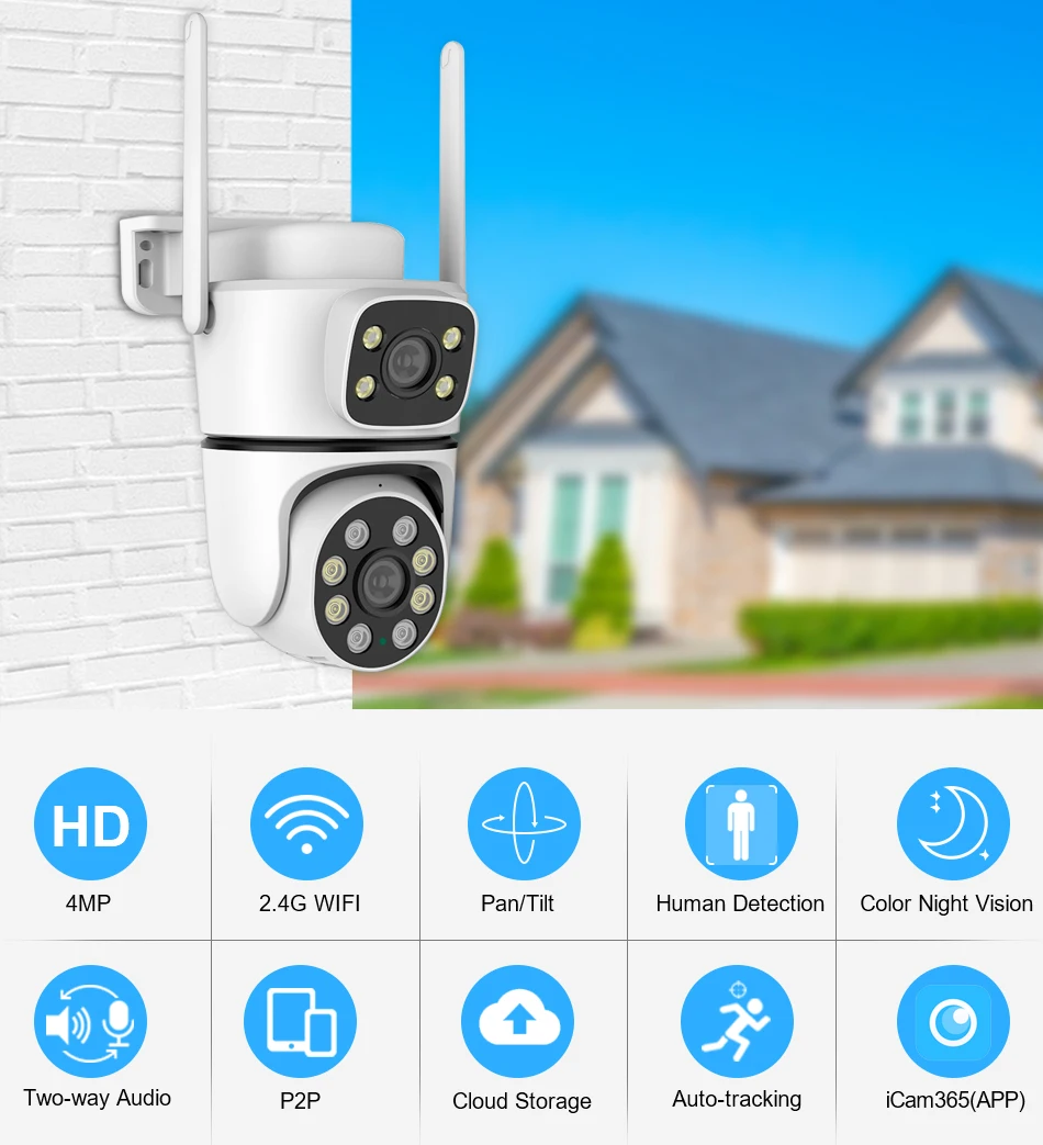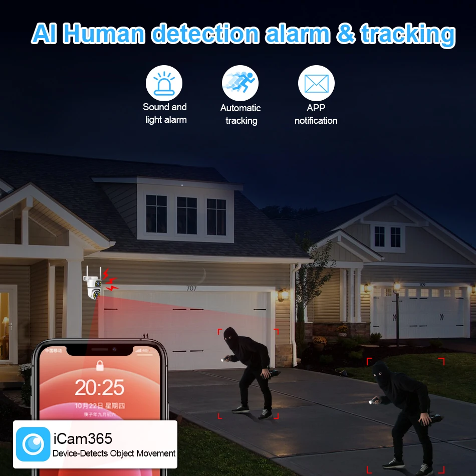 Smar 4MP PTZ Wi-Fi IP-камера с двумя объективами для улицы 5-кратный зум Ai Автоматическое отслеживание Беспроводное наблюдение Камеры видеонаблюдения ICam365