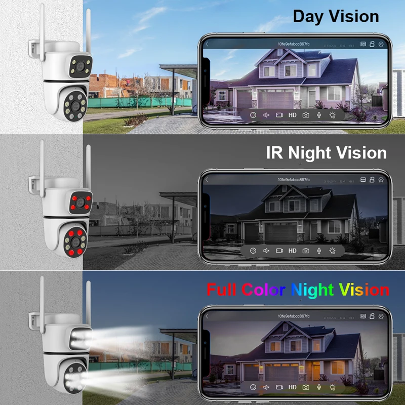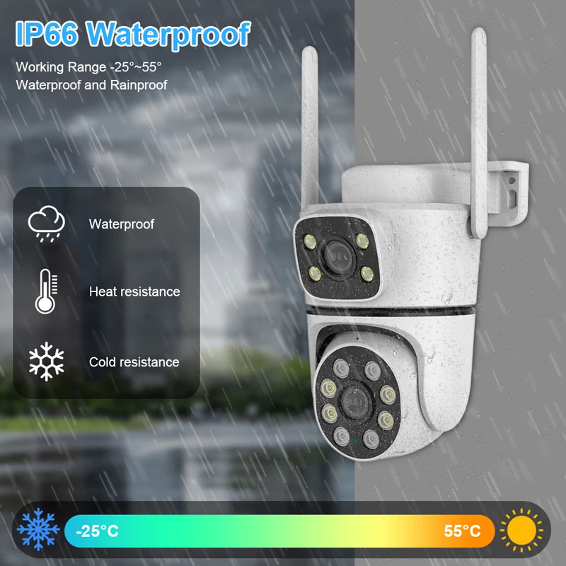 Двойной объектив, двойной экран, сигнализация уведомлений, отслеживание гуманоидов, двусторонний голосовой мониторинг внутренней связи, полноцветное ночное видение, водонепроницаемость IP66, удаленный мониторинг мобильного телефона, обмен видео, хранение SD-карты, 24-часовая запись видео