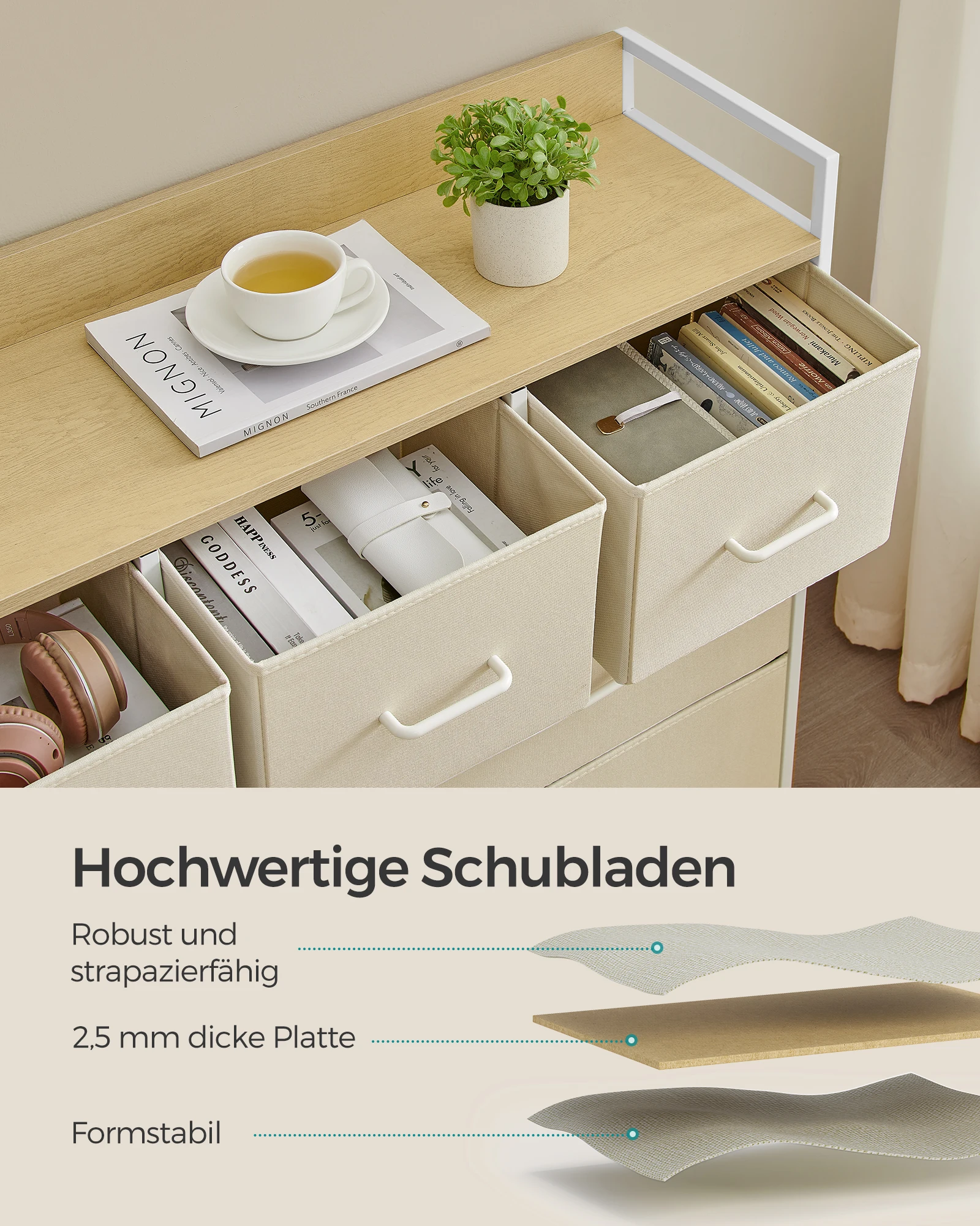 Тканевые фасады ящиков в сочетании с древесной стружкой и металлическим каркасом-создан прочный и прочный комод, который можно легко вставить куда угодно.