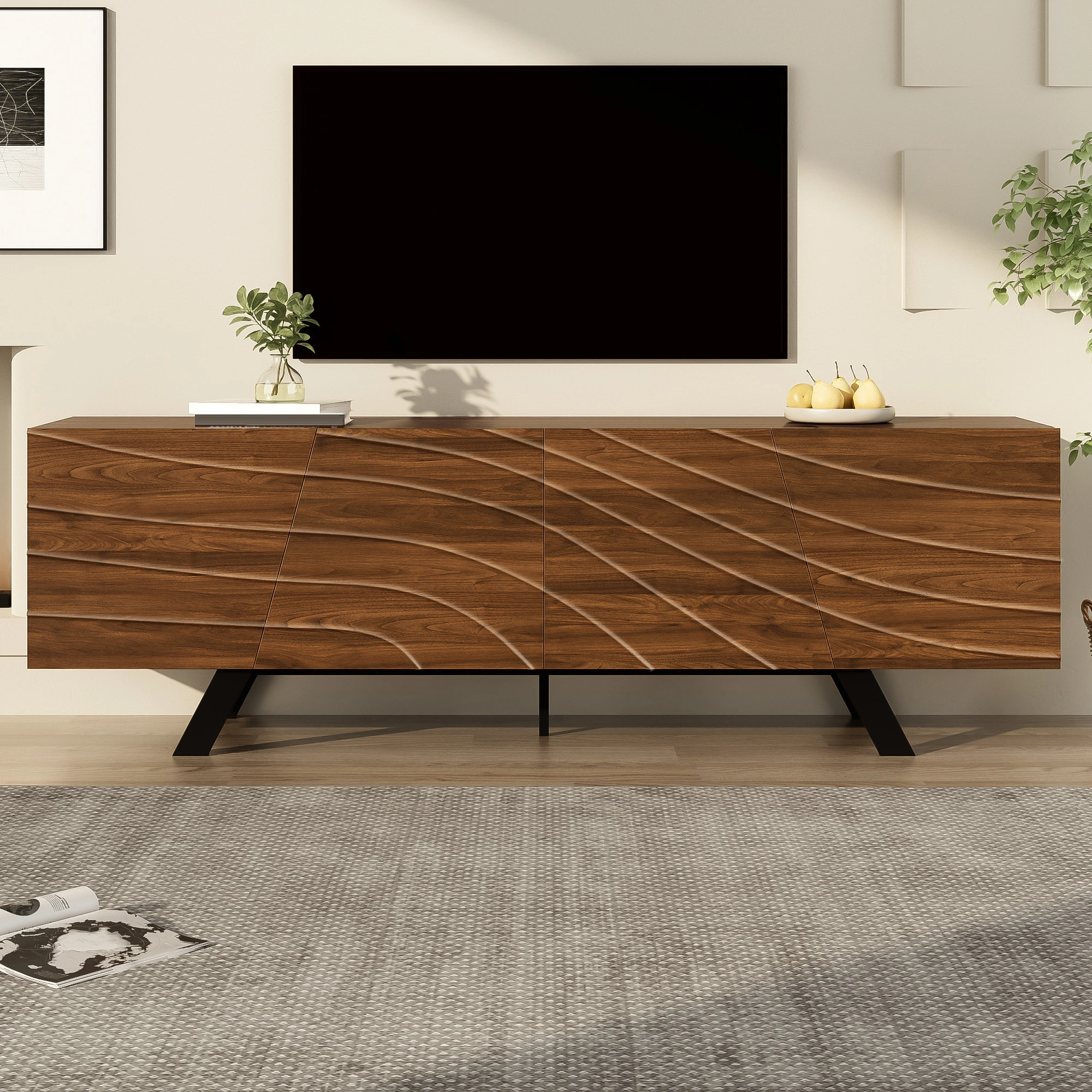 Современная мебель под телевизор с гофрированными дверцами и встроенным пространством для хранения, орех