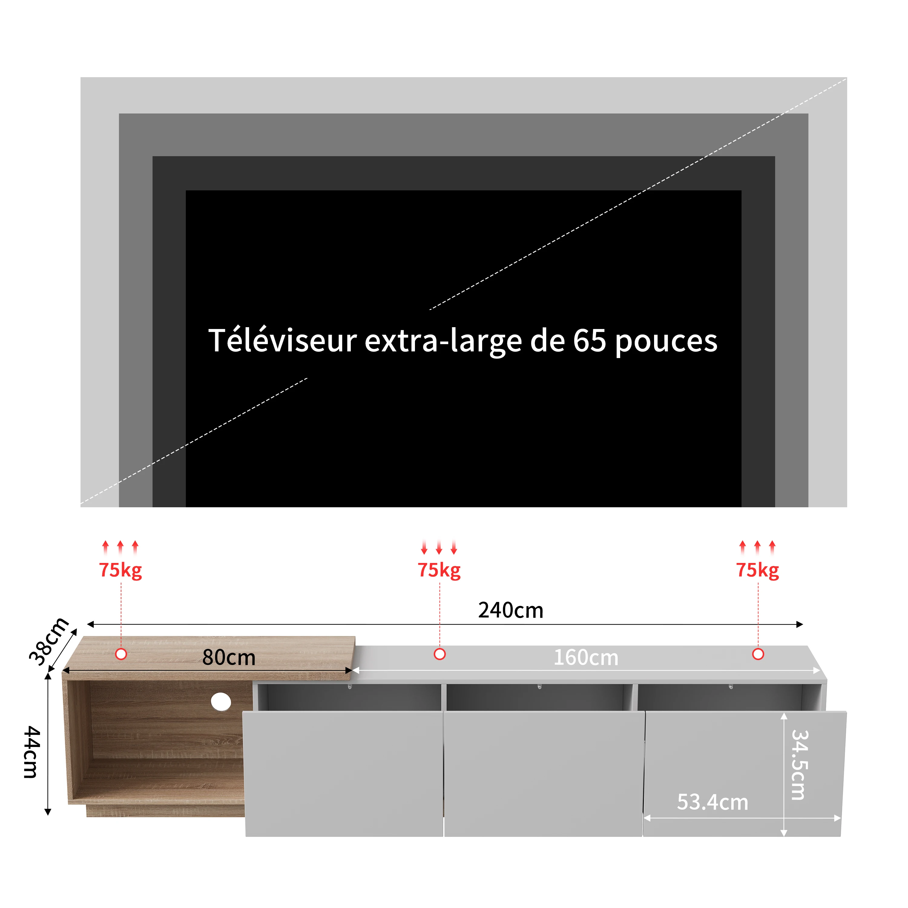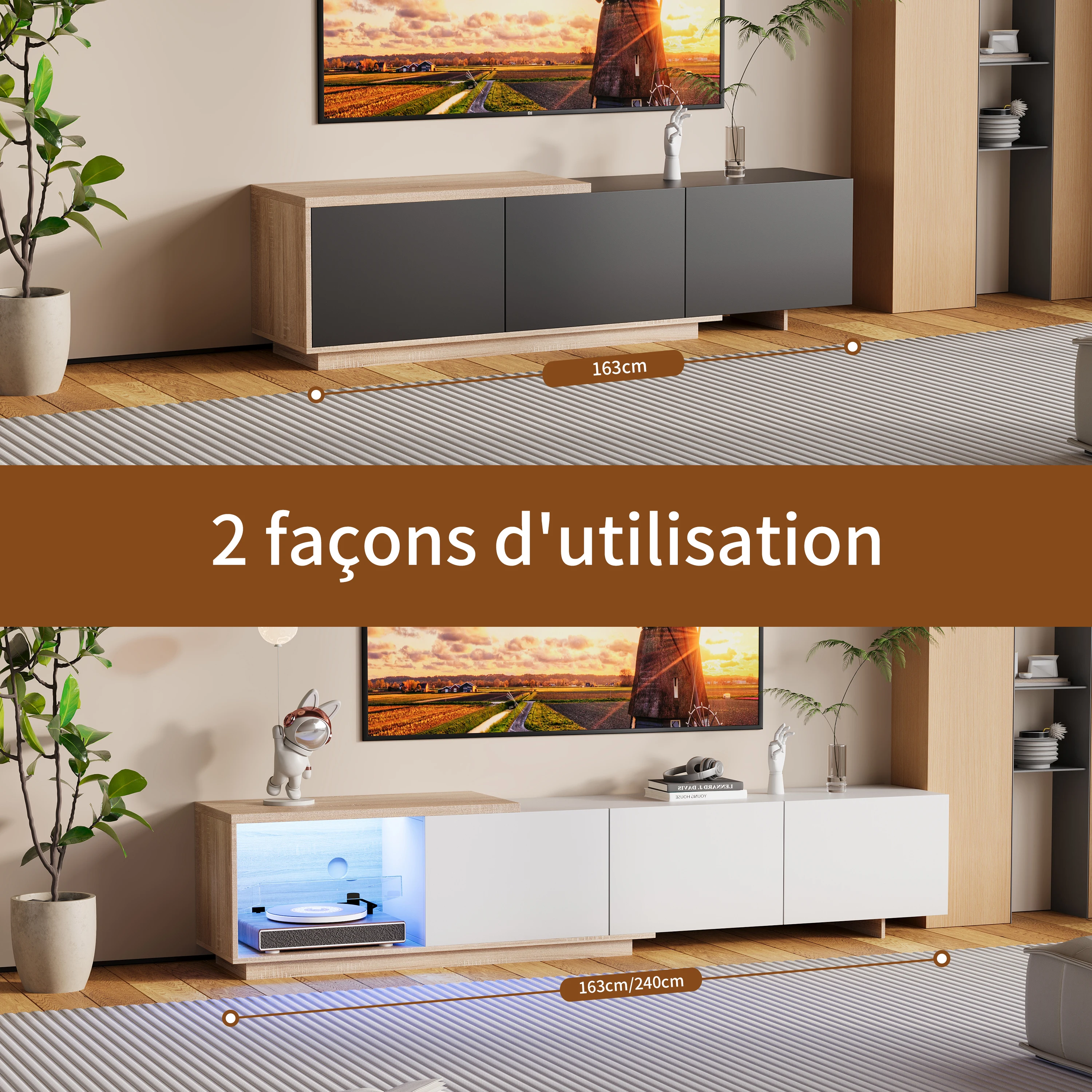 1. Тумба под телевизор с выдвижным ящиком имеет длину 163 см в закрытом состоянии и выдвигается до 240 см при полном открытии.