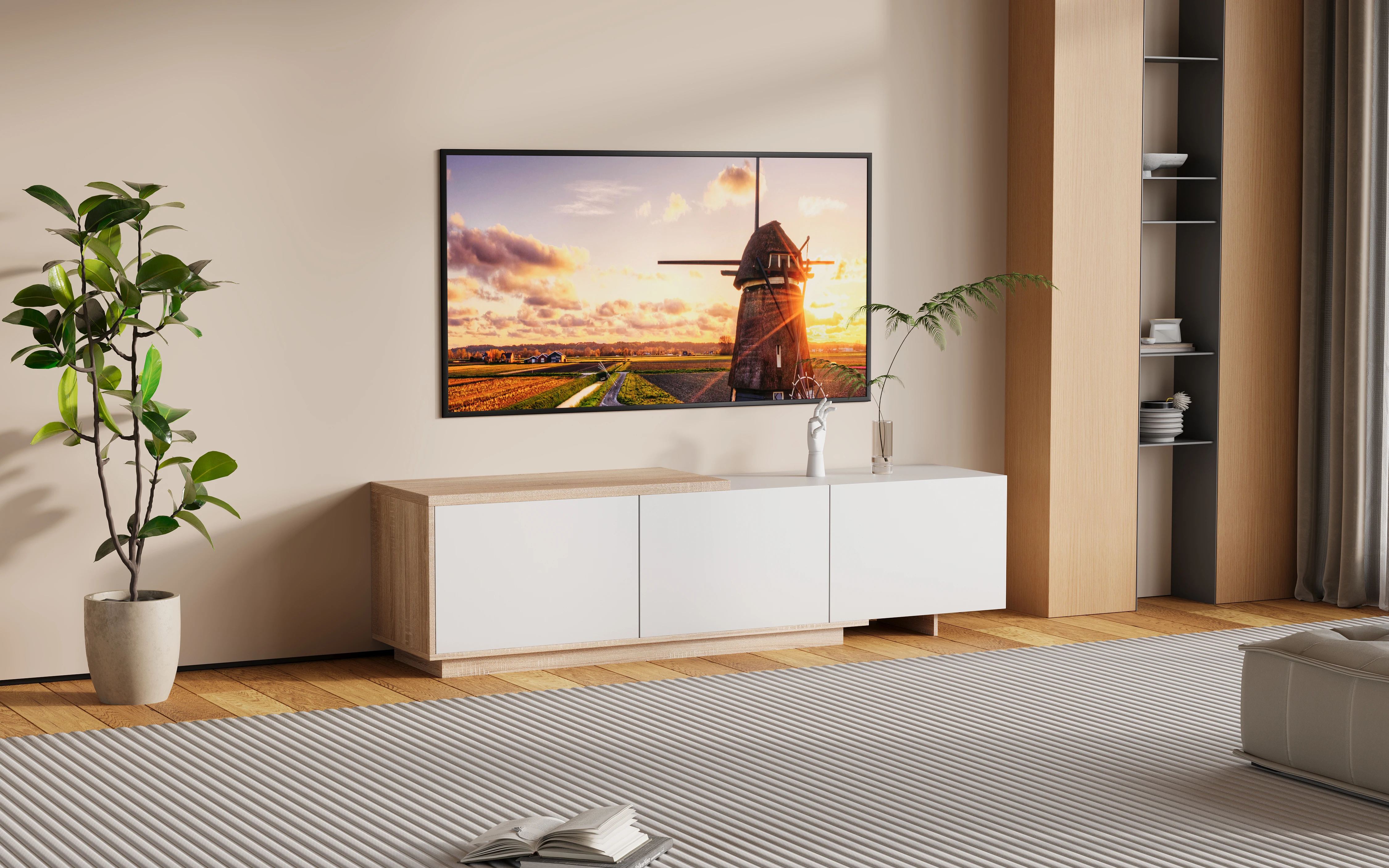 2. Мебельный телевизор с местом для хранения вещей, ящики оснащены пружинными механизмами для удобства использования.