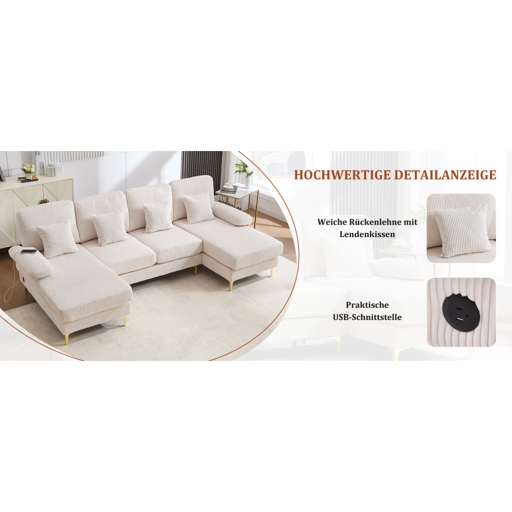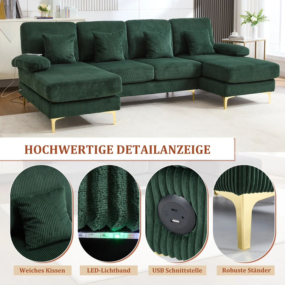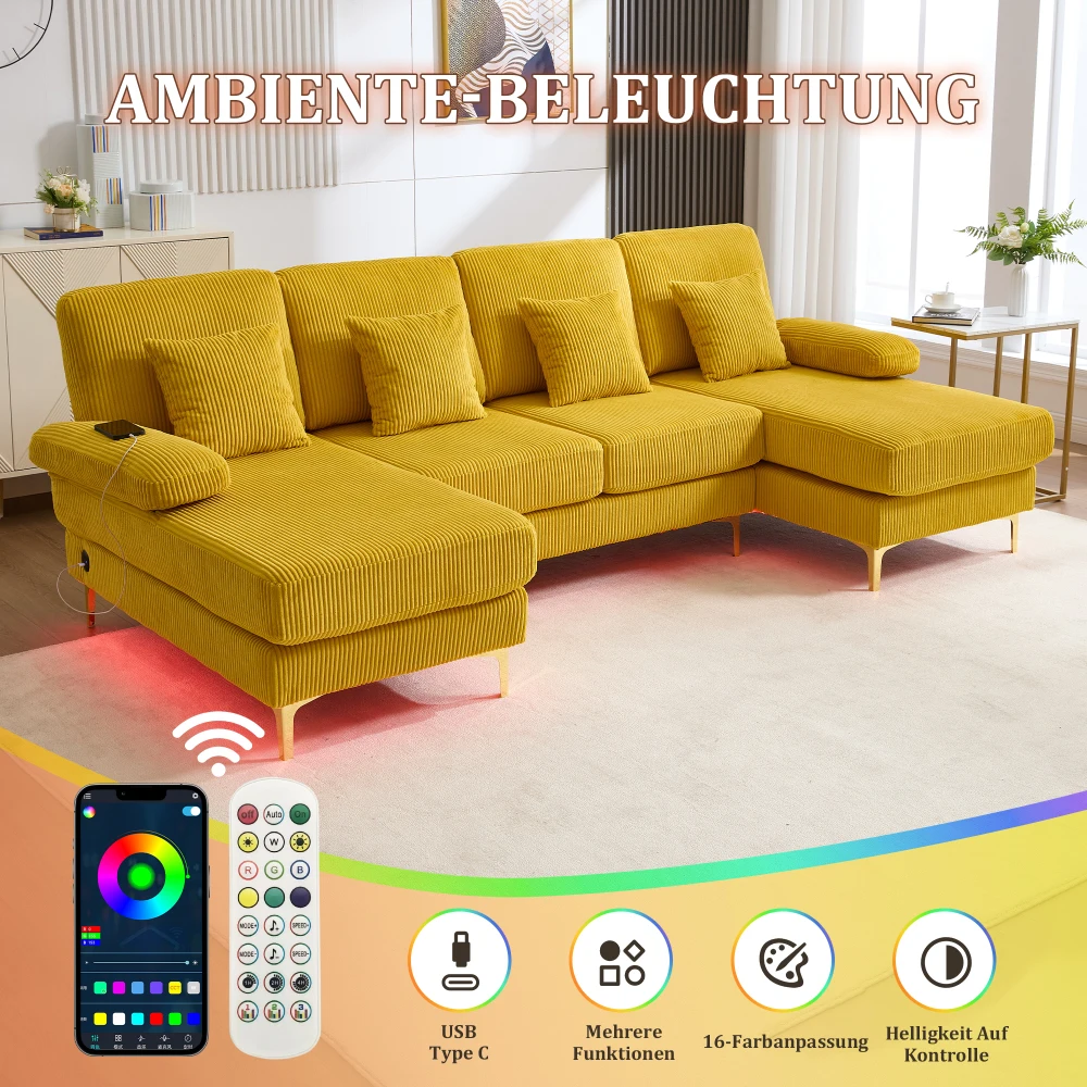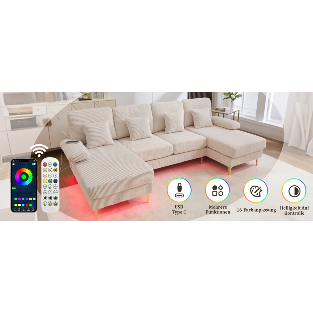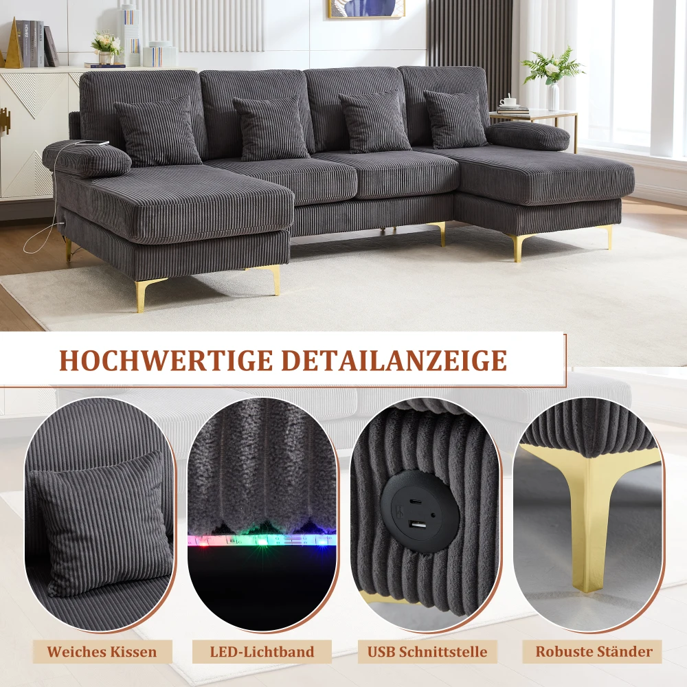 Современный U-диван со светодиодной подсветкой и каркасом из цельного дерева с портом USB-C, 4 роскошными подушками и эргономичной спинкой премиум-класса
