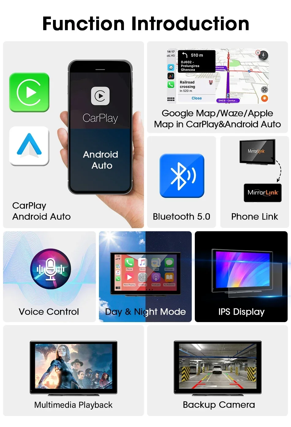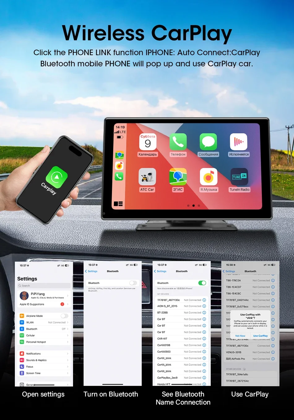 Телефоны Apple и телефоны с системой Android нужно только подключиться к Bluetooth и Wi-Fi этого продукта, чтобы войти в автоматический интерфейс Carplay и Android.Нет необходимости использовать кабель для передачи данных для подключения устройств. Телефоны Huawei не поддерживают функции Android Auto.