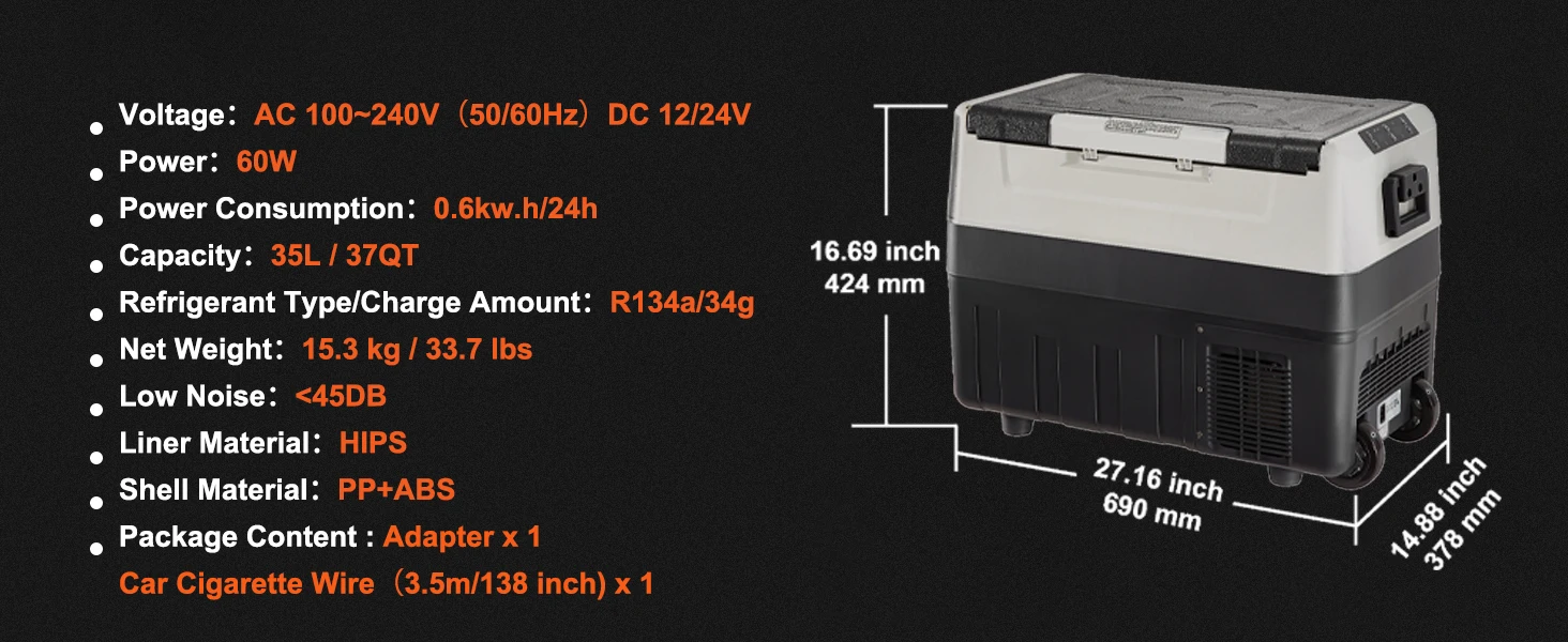 Автомобильный холодильник 37QT предлагает просторное место для хранения всех необходимых вещей.Благодаря передовой компрессорной технологии он быстро охлаждается за час и поддерживает температуру от -4 лет.°F до 158°Ф.