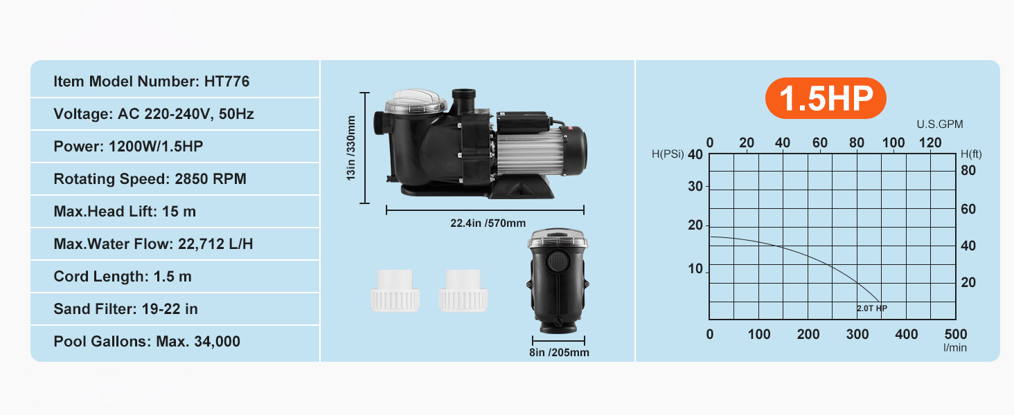 1,5 л.с. 100 галлонов в минуту —С макс. 100 галлонов в минуту.Расход воды и макс. 15 м.Подъем головы: наш насос для бассейна обеспечивает быструю циркуляцию воды.