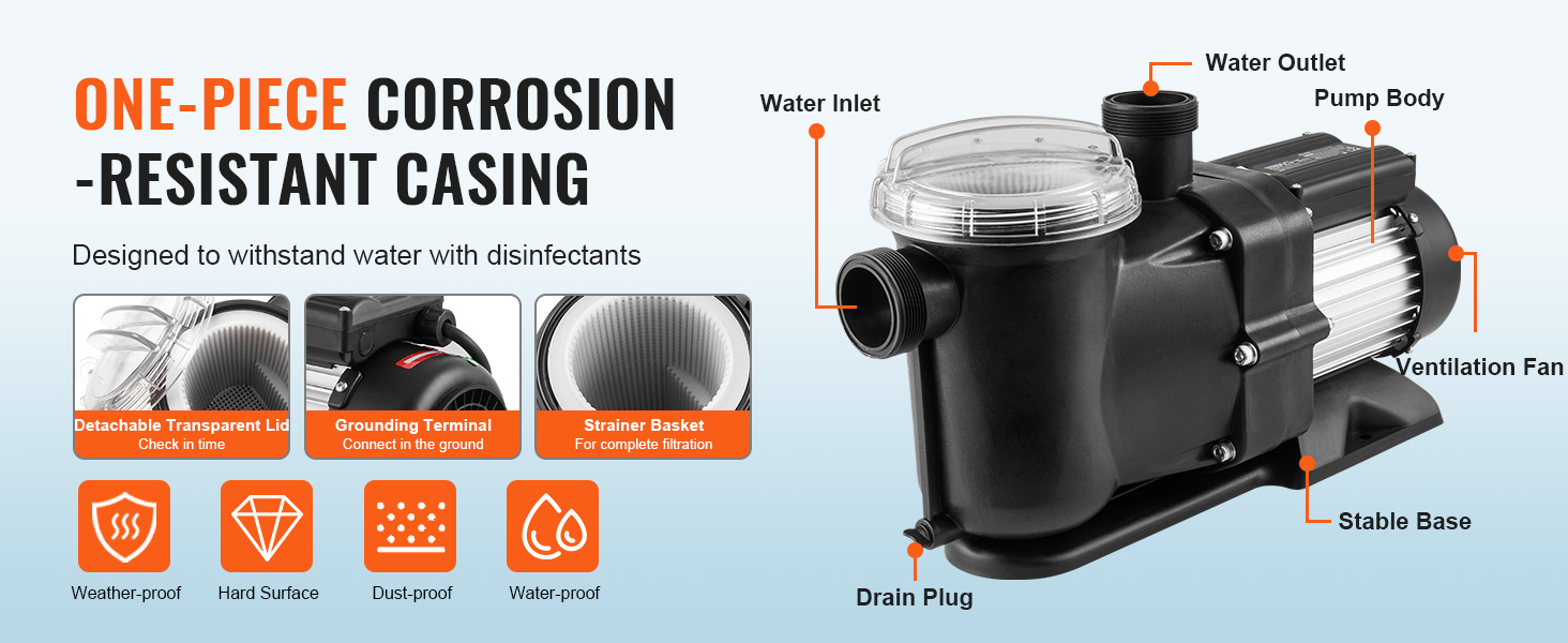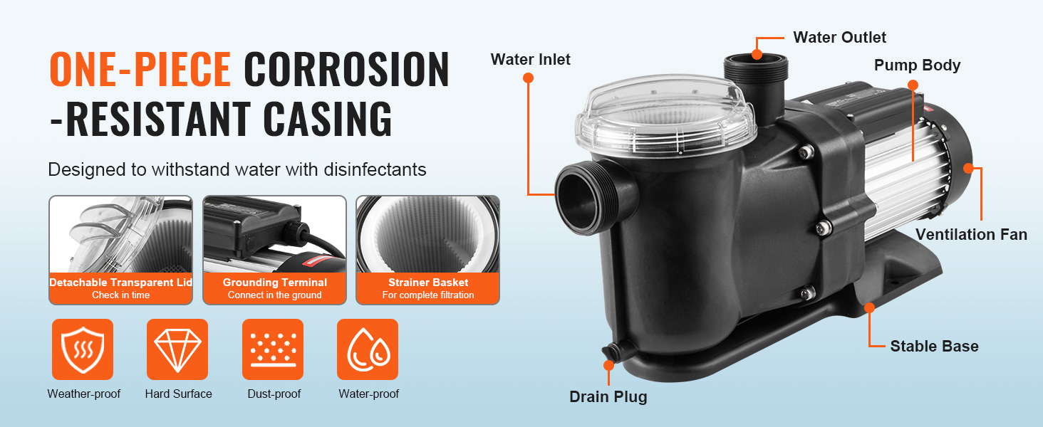 【Утолщенный корпус, устойчивый к коррозии】: в отличие от других насосов, наш насос для бассейна имеет оболочку из полипропилена, которая выдерживает вредные вещества.Благодаря интегрированной структуре он обладает герметичными и износостойкими свойствами, обеспечивая долговечность даже при работе с водой, обработанной дезинфицирующими средствами.Погрузитесь в беспроблемное обслуживание бассейна с нашим насосом!