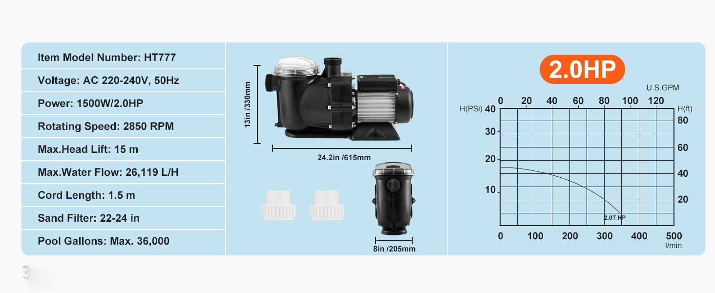 2 л.с. 115 галлонов на миллион —С 115 галлонов в минуту Макс.Расход воды и макс. 15 м.Подъем головы: наш насос для бассейна обеспечивает быструю циркуляцию воды.