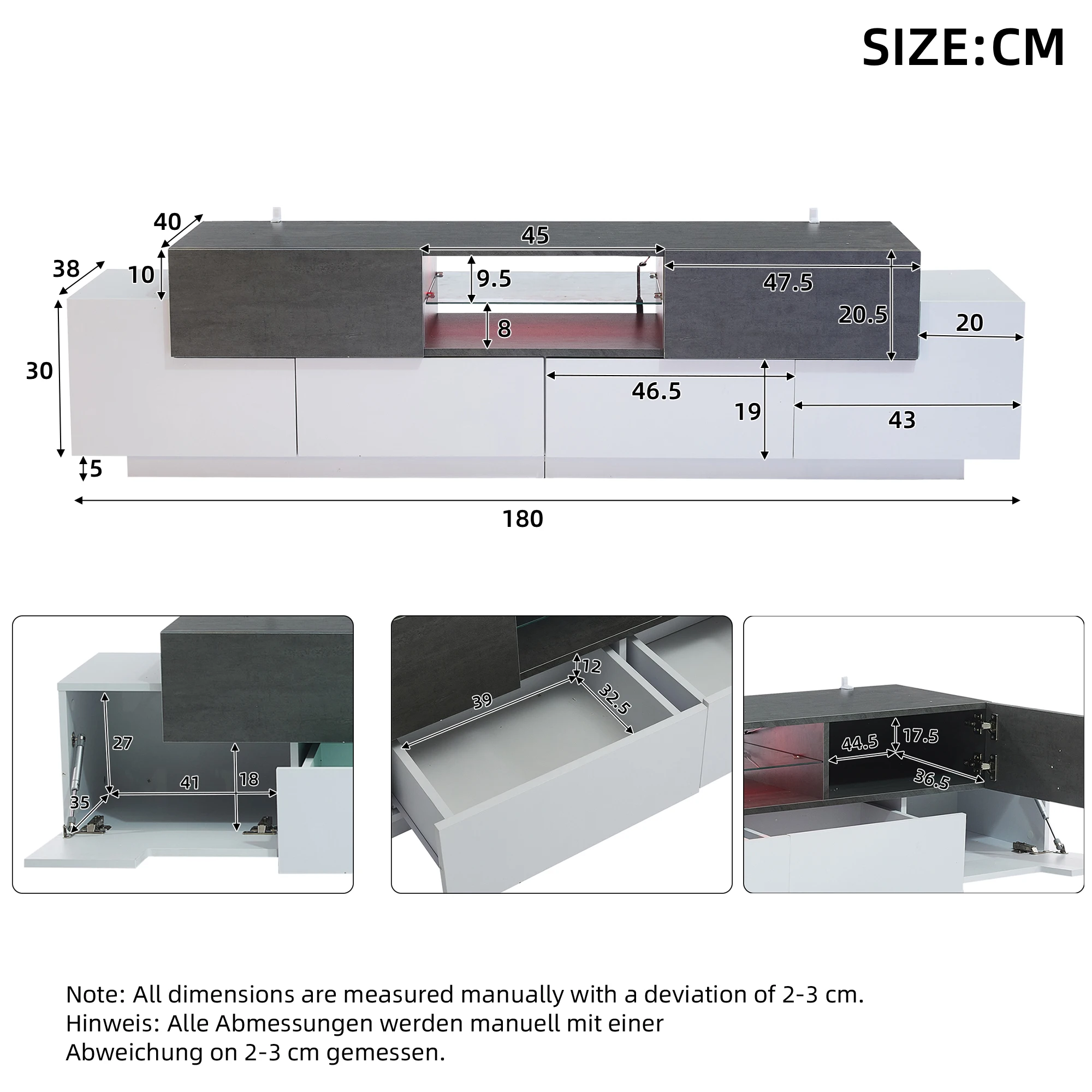 2.Эта подставка для телевизора с впечатляющей шириной 180 см предлагает достаточно места для телевизоров с диагональю до 80 дюймов, что делает ее настоящим акцентом в вашей гостиной.Белая поверхность излучает элегантность и современный шарм, а эффект тонкого серого мрамора добавляет нотку вневременной красоты и органично сочетается с различными стилями дизайна интерьера.