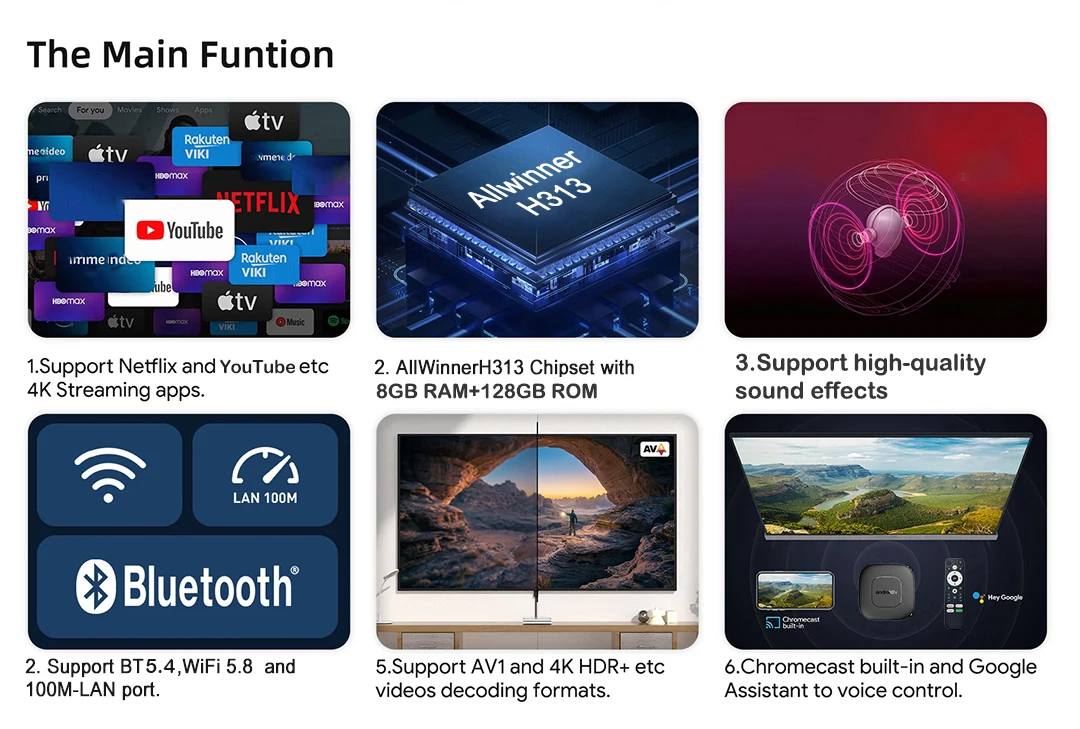 T1 Smart Android TV Box Android 14 Allwinner H313 Google Assistant Dual Wi-Fi 5G 8K Video 8GB 128 ГБ Медиаплеер Set Top Box Fast