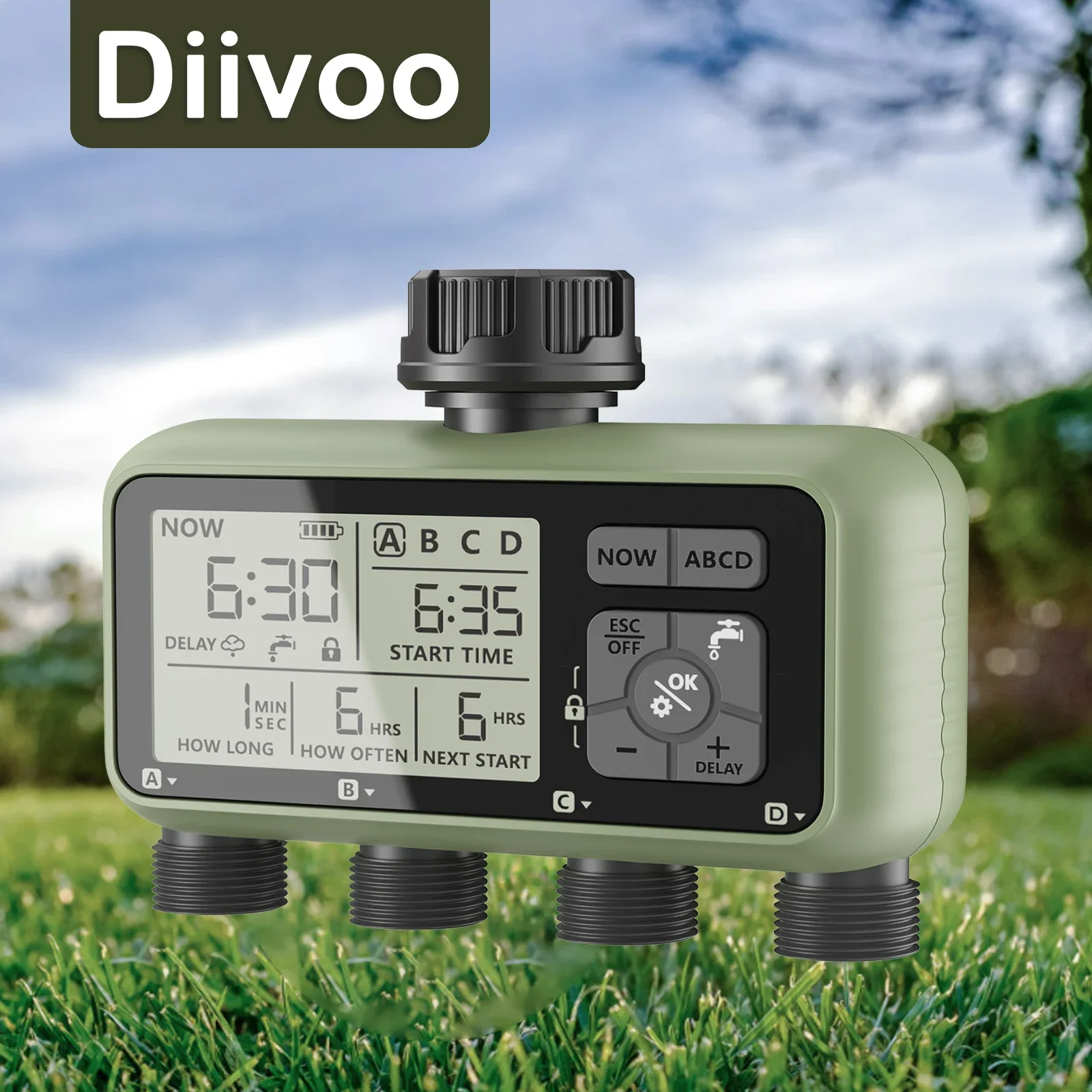 Таймер воды Diivoo, 4-зонный садовый программируемый автоматический таймер для орошения с задержкой дождя, ручной/автоматический режим полива для газона и двора