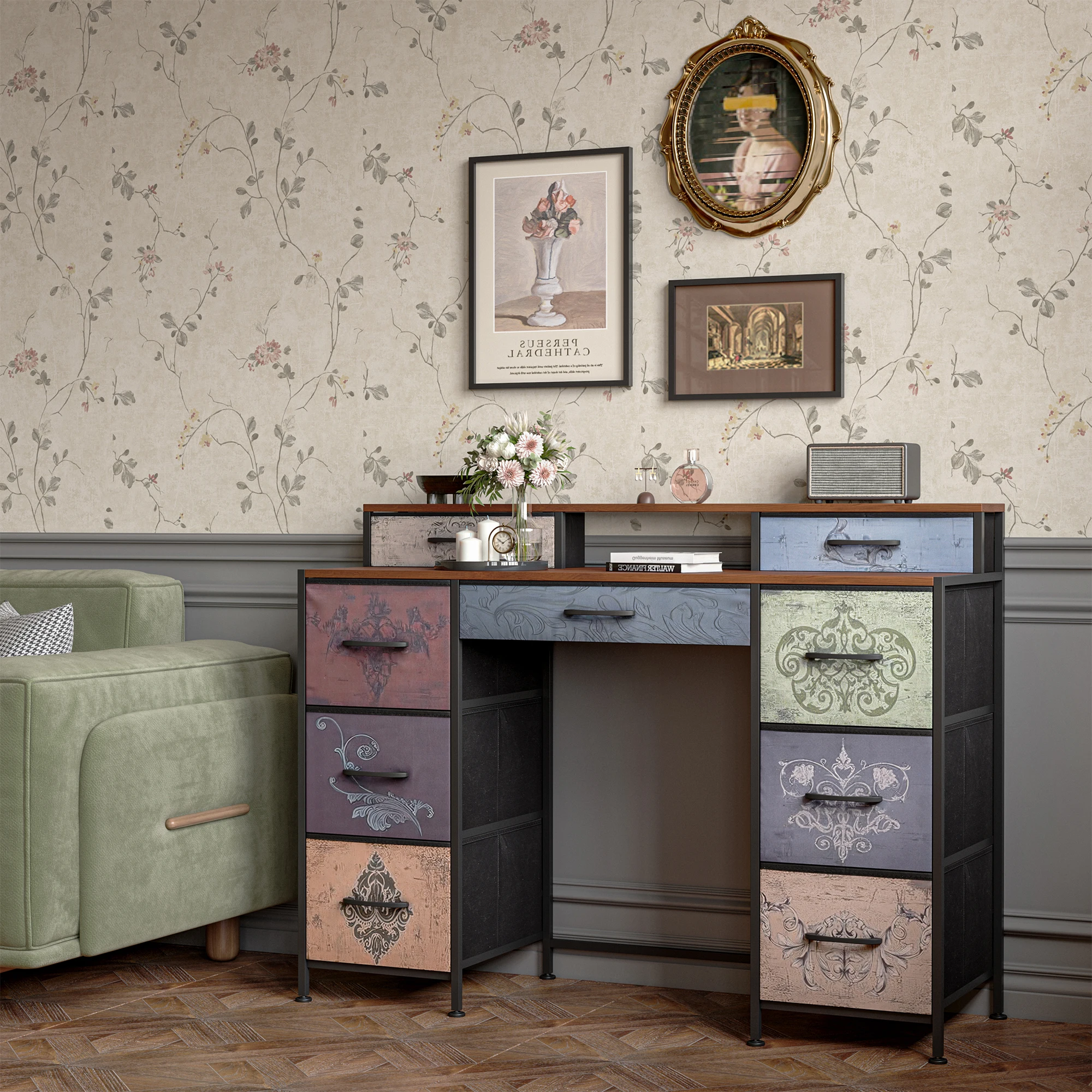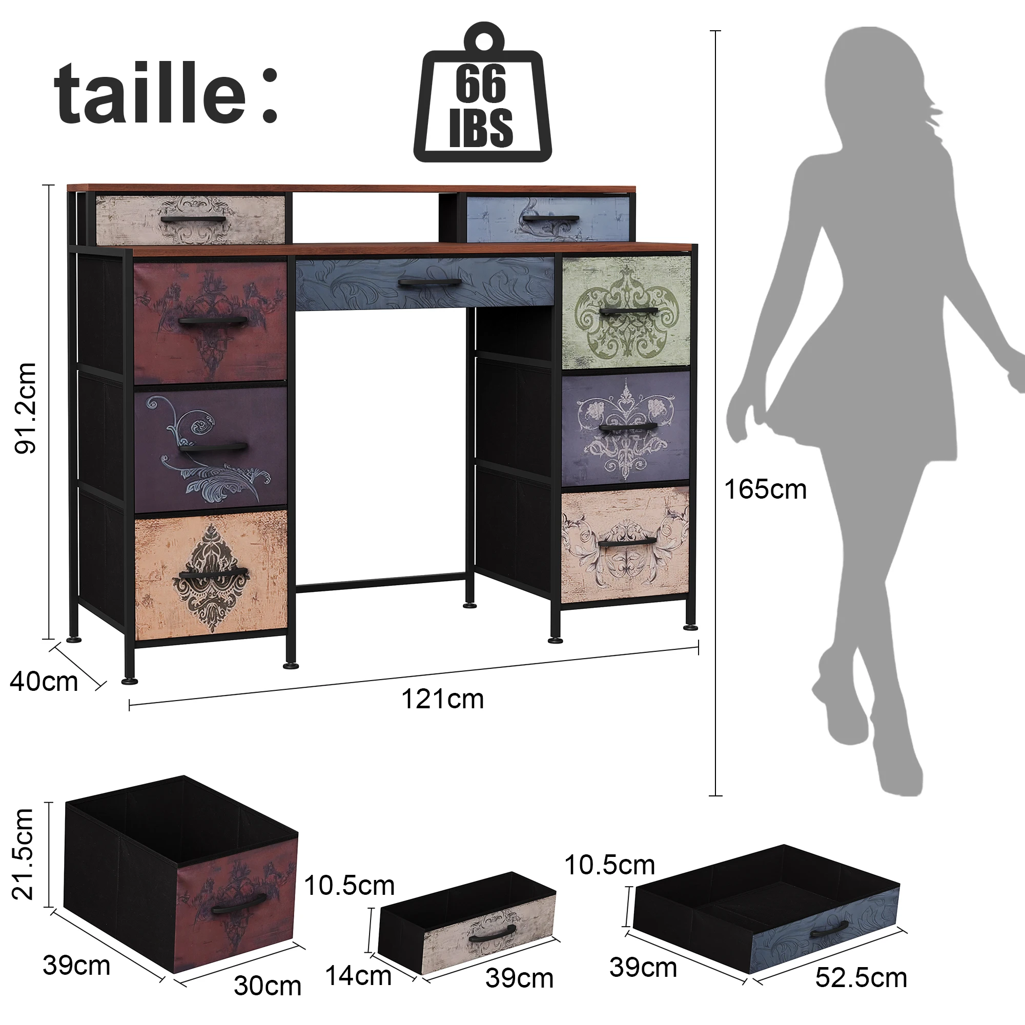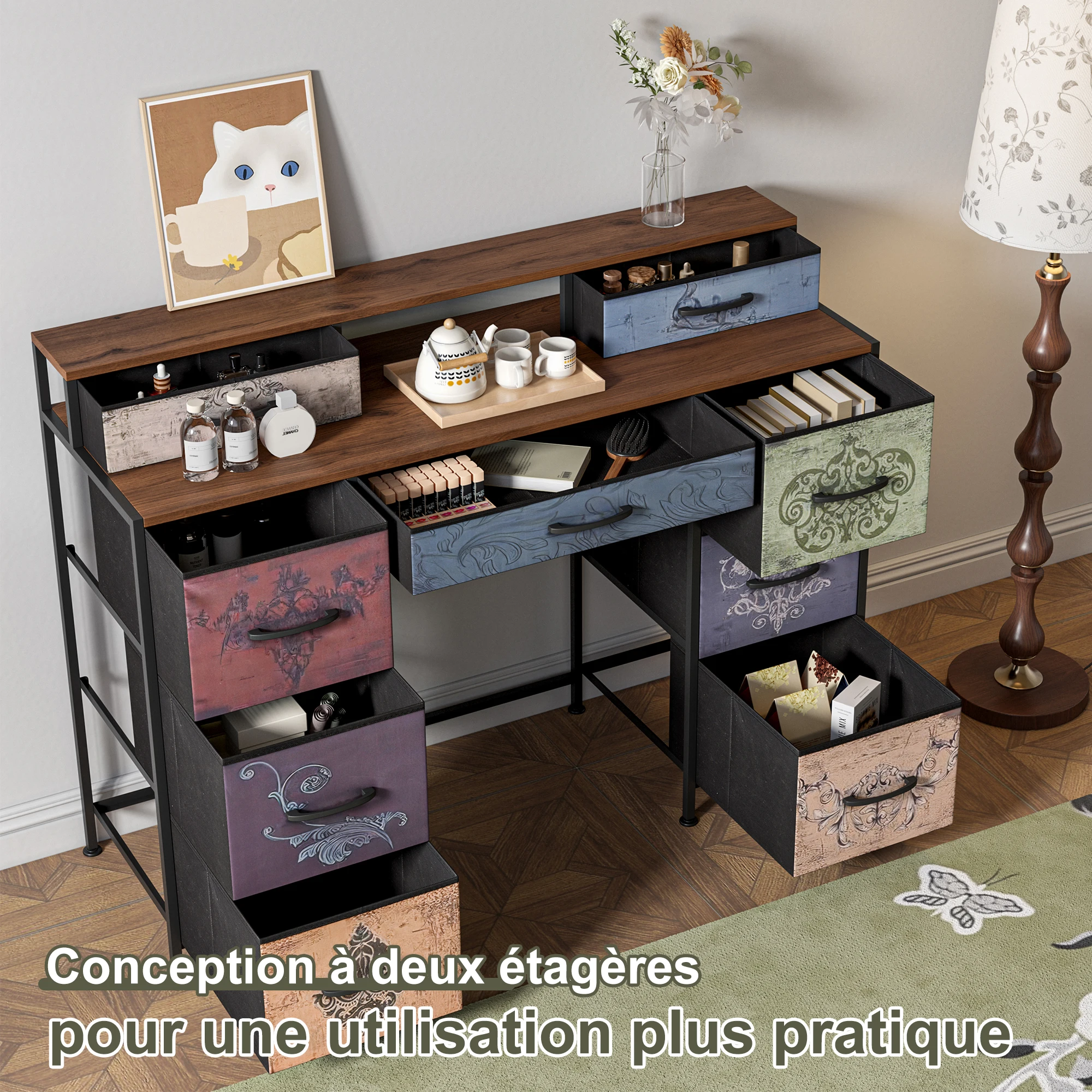 【Большое место для хранения 】:Этот туалетный столик оснащен девятью просторными тканевыми ящиками и практичной полкой.Вы можете хранить косметику, канцелярские товары, книги или электронные аксессуары для упорядоченного и функционального пространства, будь то спальня, офис или рабочее место.Идеальный гидрокостюм функциональности, стиля и оптимизации пространства!