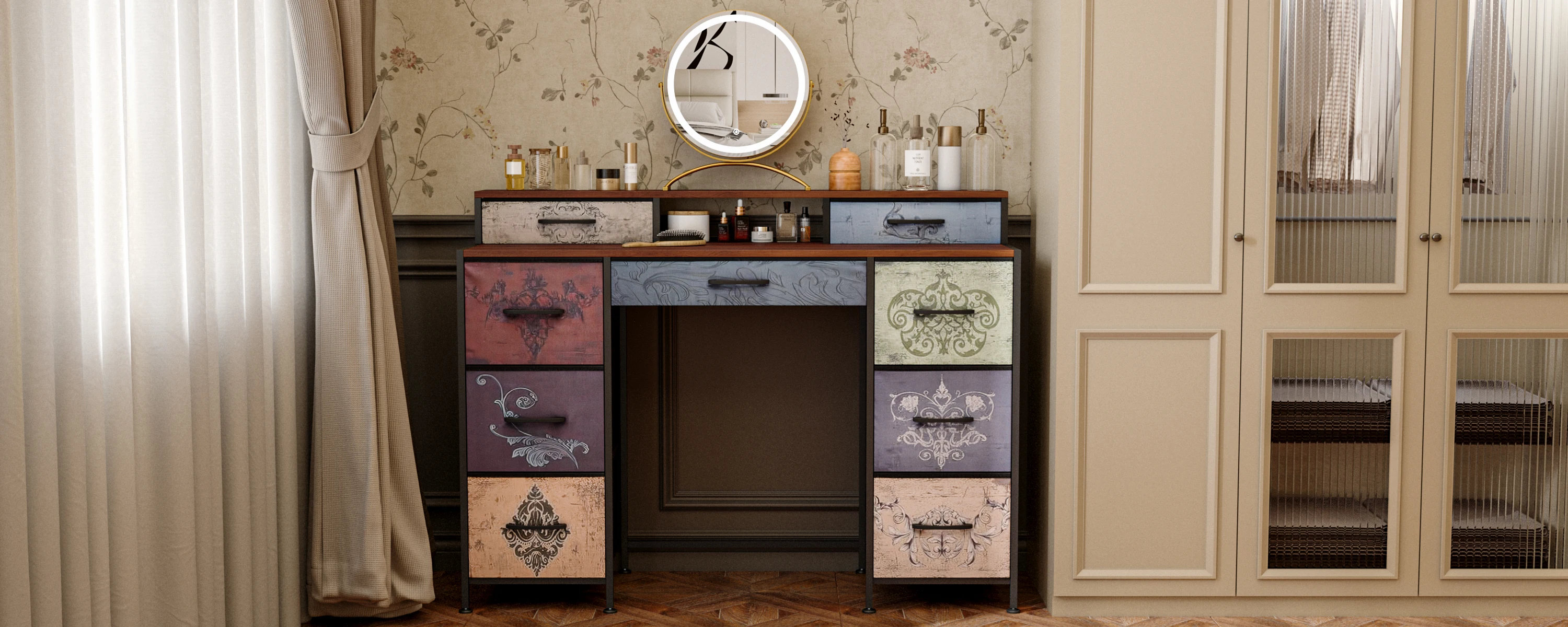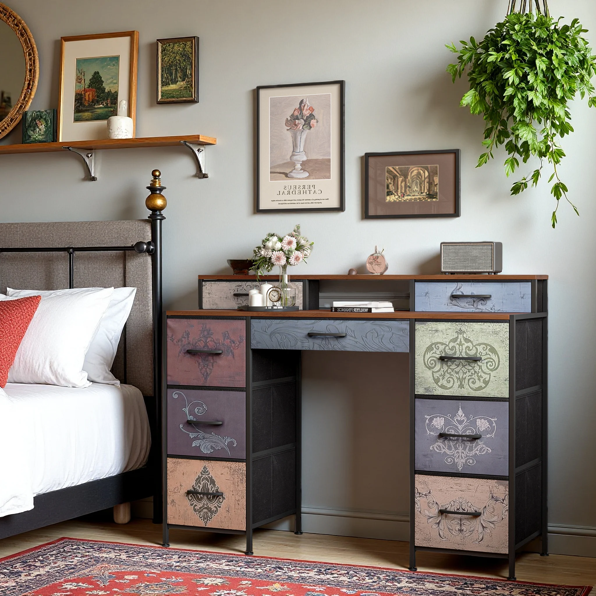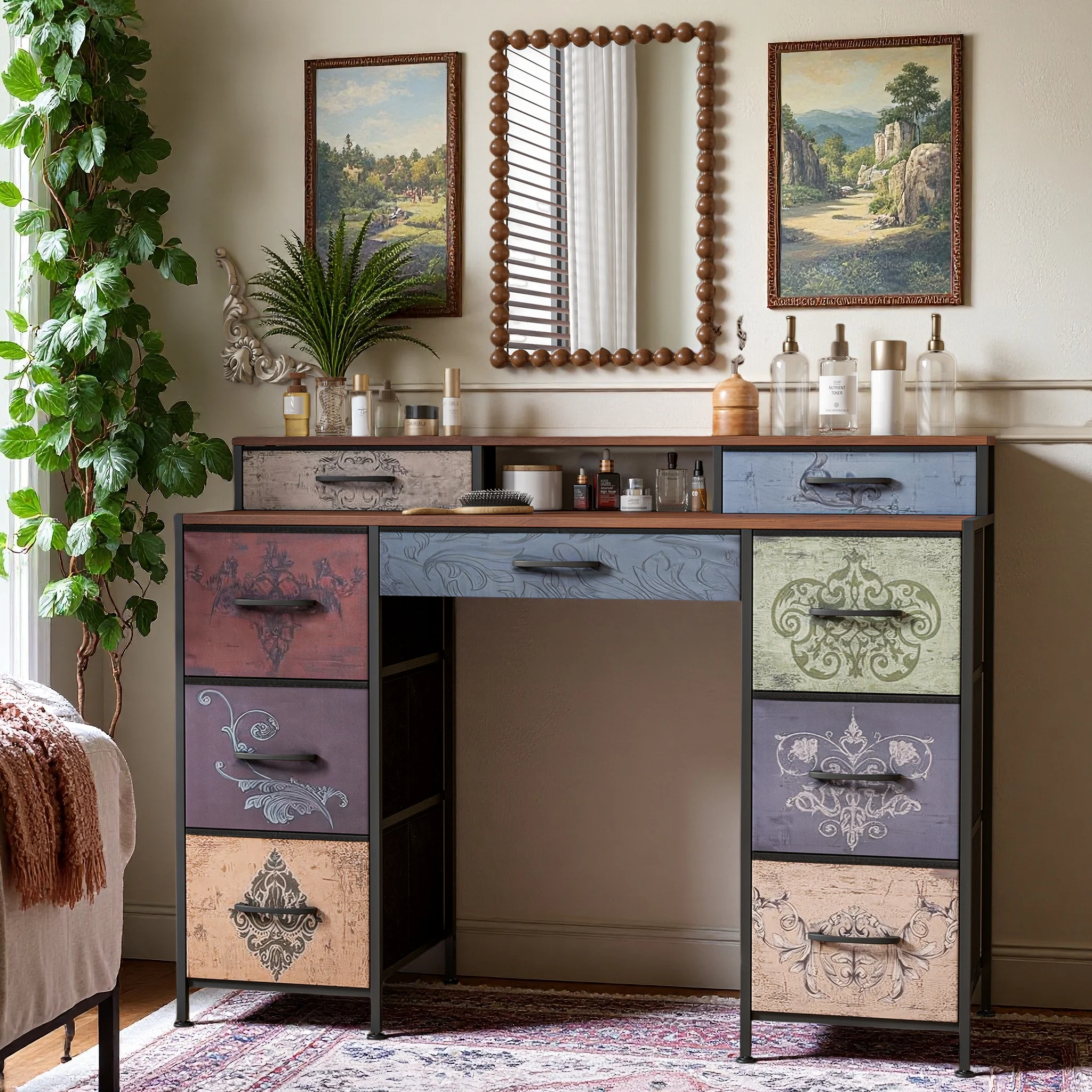 【Большое место для хранения 】:Этот туалетный столик оснащен девятью просторными тканевыми ящиками и практичной полкой.Вы можете хранить косметику, канцелярские товары, книги или электронные аксессуары для упорядоченного и функционального пространства, будь то спальня, офис или рабочее место.Идеальный гидрокостюм функциональности, стиля и оптимизации пространства!