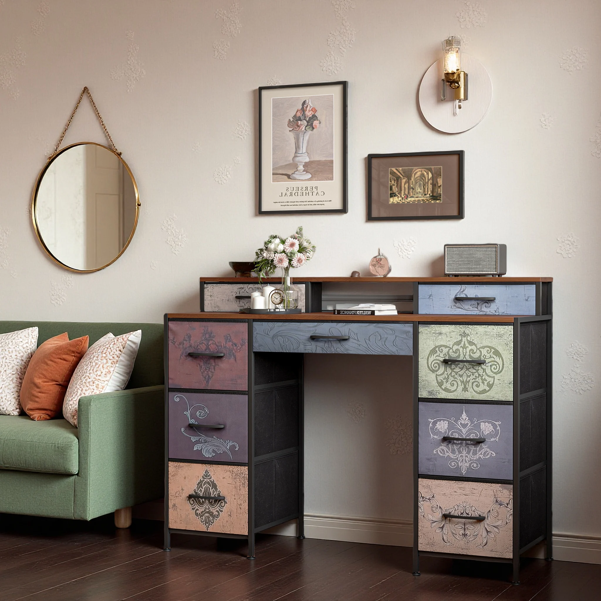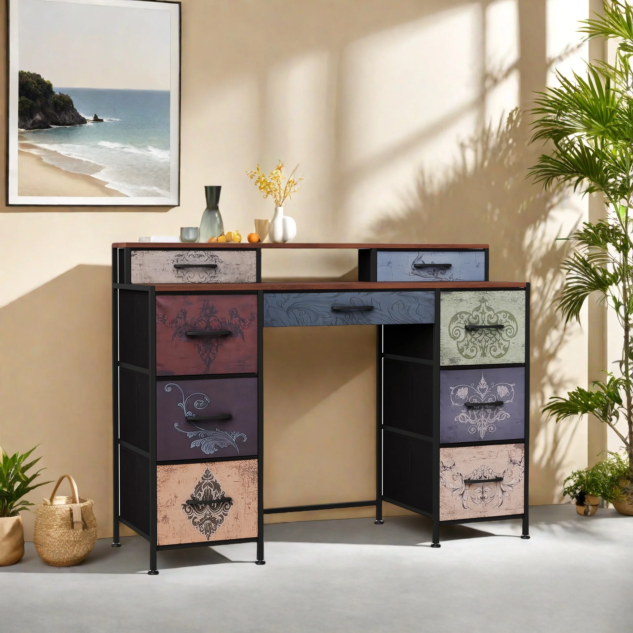 Туалетный столик без зеркала, комод с 9 ящиками, Макияжный столик в стиле ретро с деревянным подносом, для спальни, гостиной, прихожей