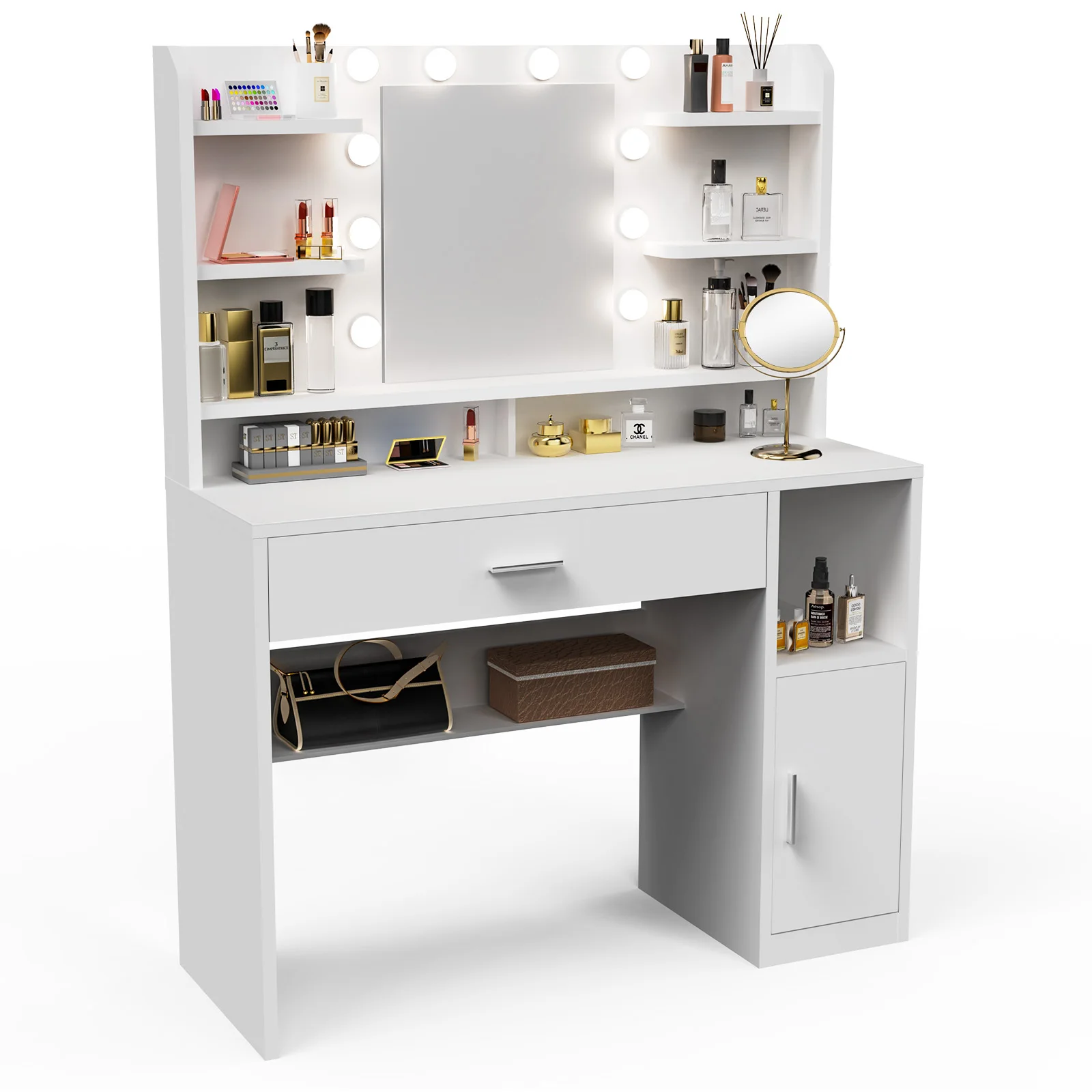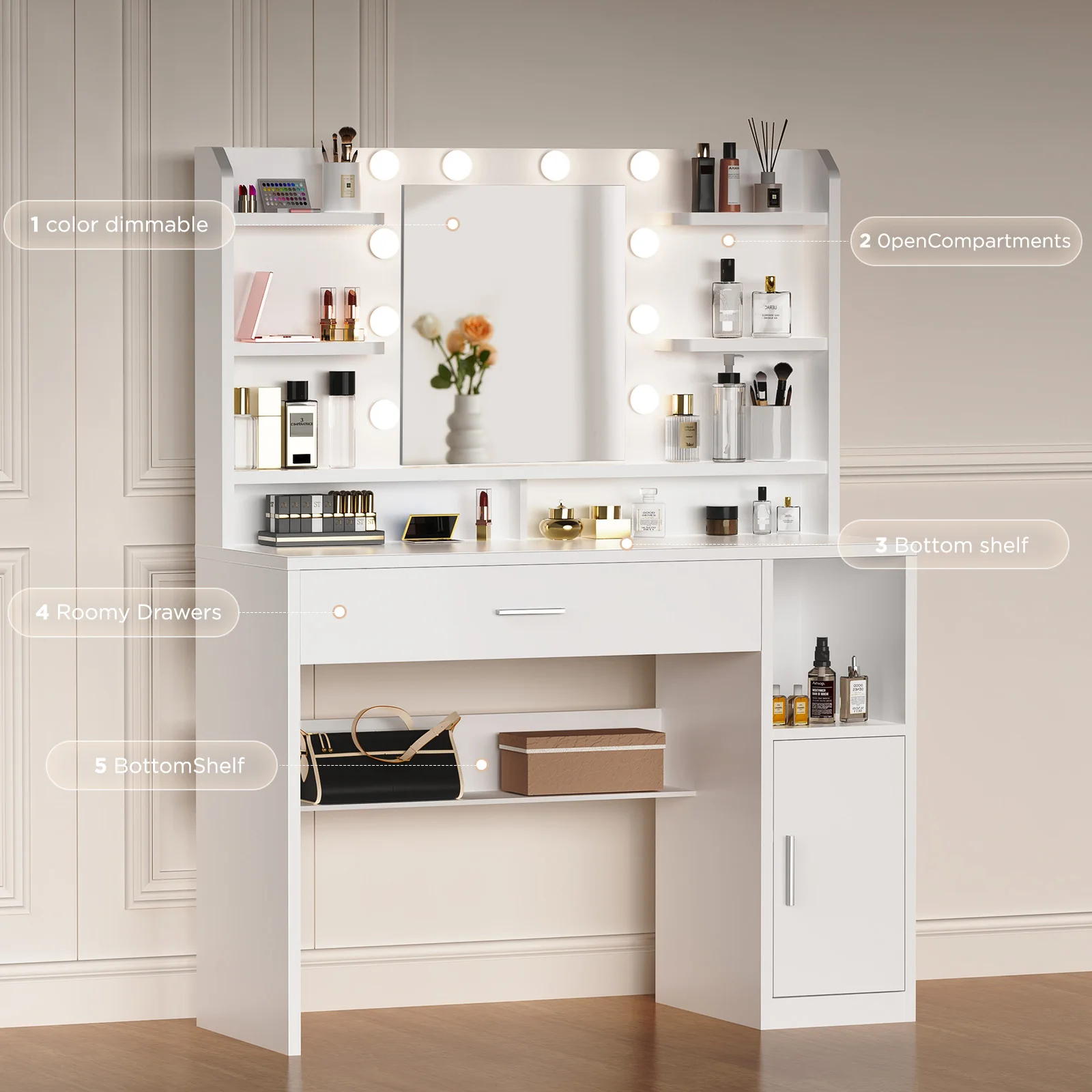 [Многофункциональное место для хранения]Туалетный столик предлагает достаточно места для хранения вещей с 8 открытыми отделениями сверху и большим ящиком.Верхнее отделение предлагает место для всех распространенных предметов, таких как косметика, средства по уходу за кожей и парфюмерии, и легко доступно.В ящике внизу достаточно места для более крупных предметов, таких как парикмахерская посуда или косметические предметы, обеспечивая порядок и обзор.