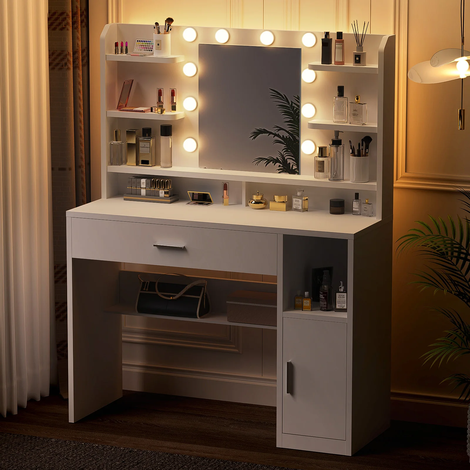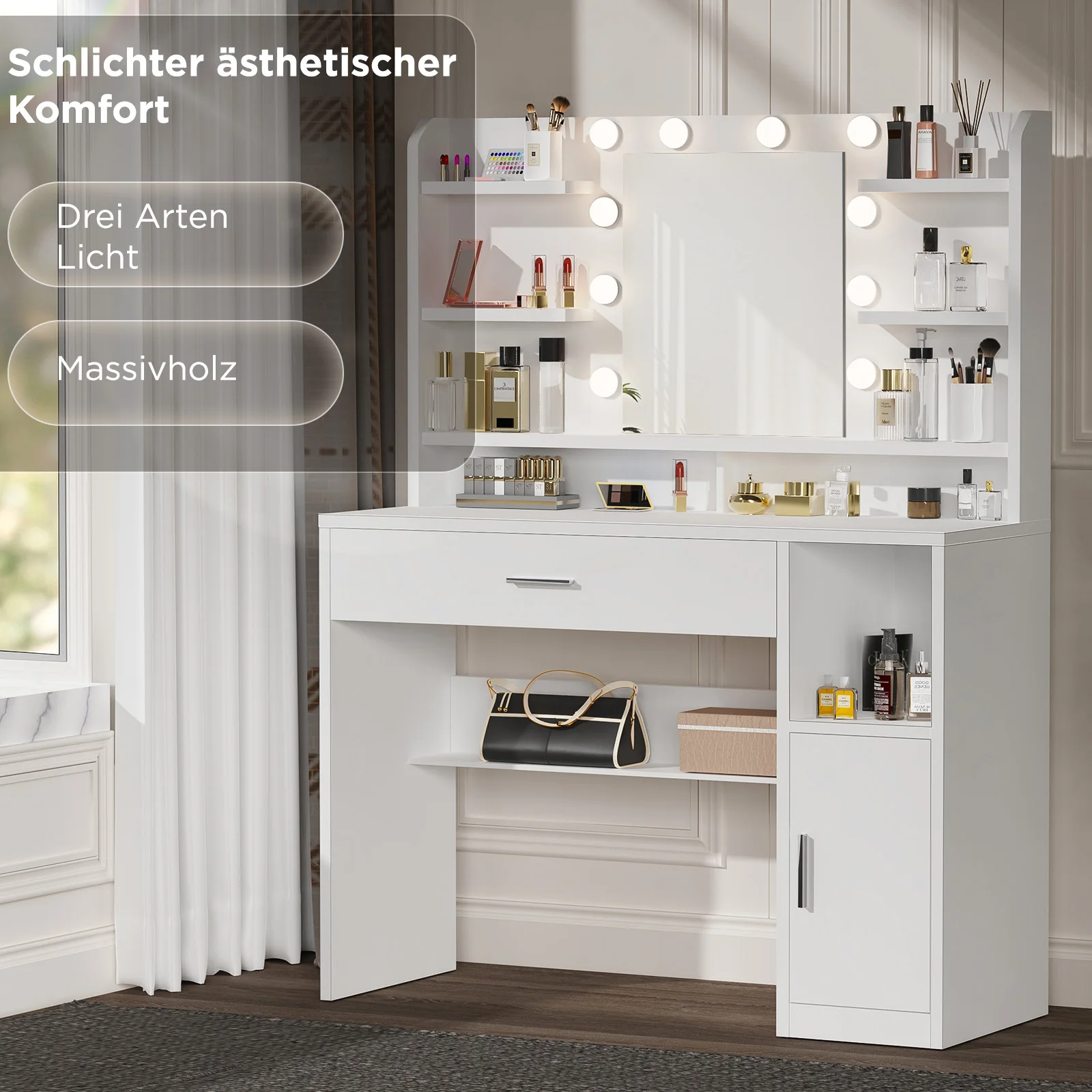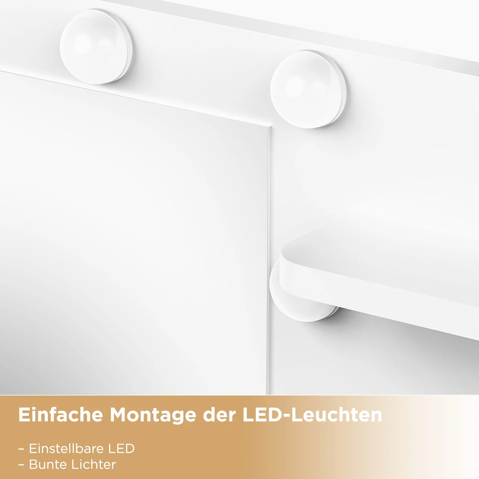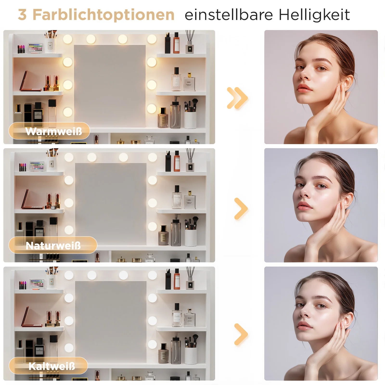 [10 регулируемых светодиодных фонарей]Этот большой туалетный столик оснащен 10 окружающими светодиодными лампами, которые отражают свет под разными углами, равномерно и мягко освещая ваше лицо.Кроме того, можно установить три цвета (холодный свет, естественный свет и теплый свет).Нажмите и удерживайте переключатель, чтобы отрегулировать яркость.Наносите ли вы макияж или делаете селфи – вы легко сможете добиться наилучшего эффекта!