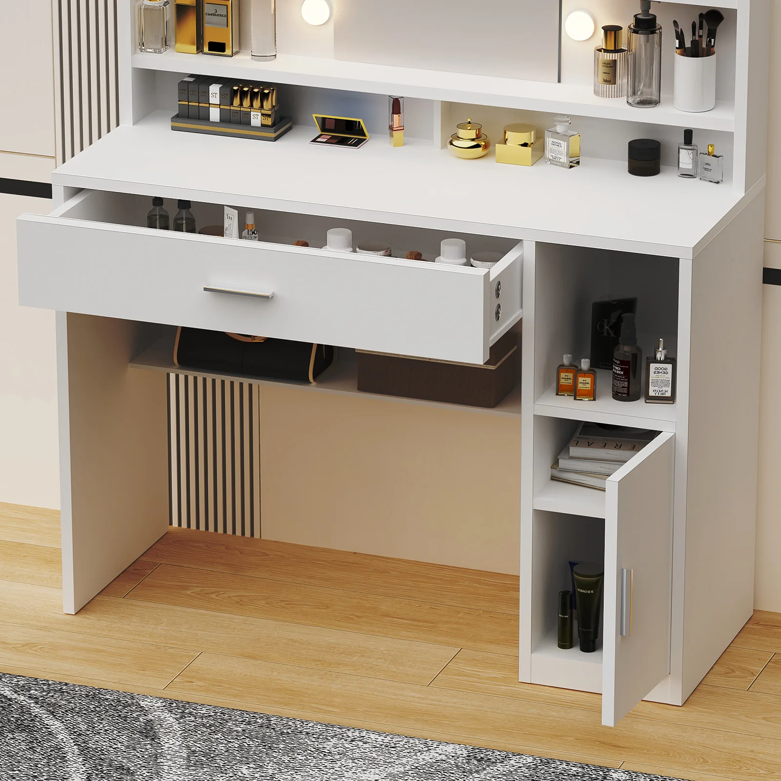 [Большое зеркало HD]Этот туалетный столик с зеркалом имеет большой зеркальный дизайн.HD-экран обеспечивает четкое отражение и идеально отображает цвет кожи.Независимо от того, наносите ли вы тональный крем или тени для век, вы сможете четко и точно просмотреть каждую деталь вашего макияжа.Как создать изысканный макияж и насладиться идеальным профессиональным макияжем, не выходя из собственного дома.
