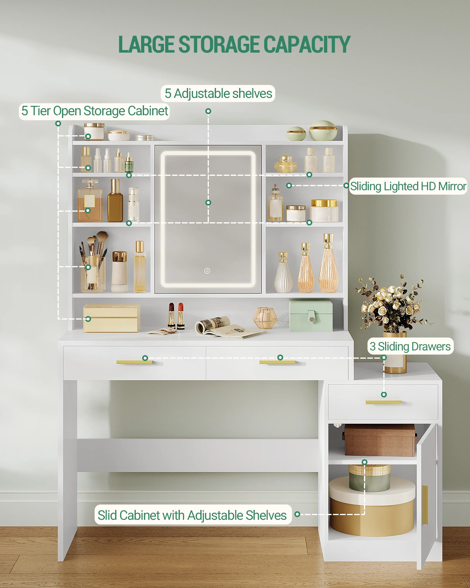 【Многофункциональные полки для хранения】около зеркала расположены 7 полок.Будь то палитра теней для век, помада или духи, вы всегда найдете подходящее место для легкого доступа.За зеркалом расположены 2 слоя скрытых полок, что дает вам больше возможностей для хранения вещей.Будь то небольшой личный предмет или ценная коллекция, вы можете сохранять их со спокойной душой.
